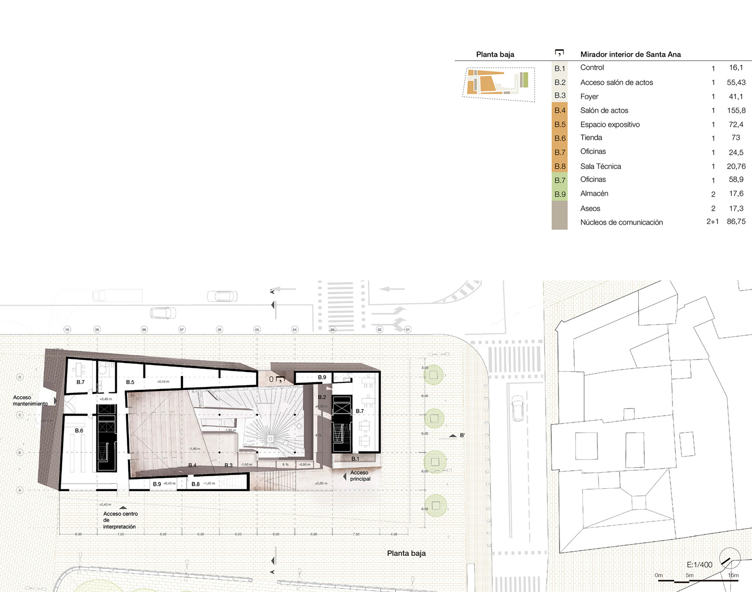 Alguien propuso alguna vez que la mejor manera de proteger un patrimonio es aumentarlo. Se plantea devolver a la ciudad la cota en la que descansan los restos romanos y la Iglesia de Santa Ana. Para ello es importante no considerar a las preexistencias desde un punto de vista físico, esto es, como elementos pasivos, sino como información reactiva. El pasado se convierte en elemento vivo y vivencial del proyecto. El encuentro entre las trazas de la ciudad actual y las antiguas trazas de los vestigios arqueológicos son tomados como ejes de la intervención. De igual forma, la modulación de las arcadas de la nave principal de la iglesia nos sirve para proyectar la retícula estructural que soporte el programa.