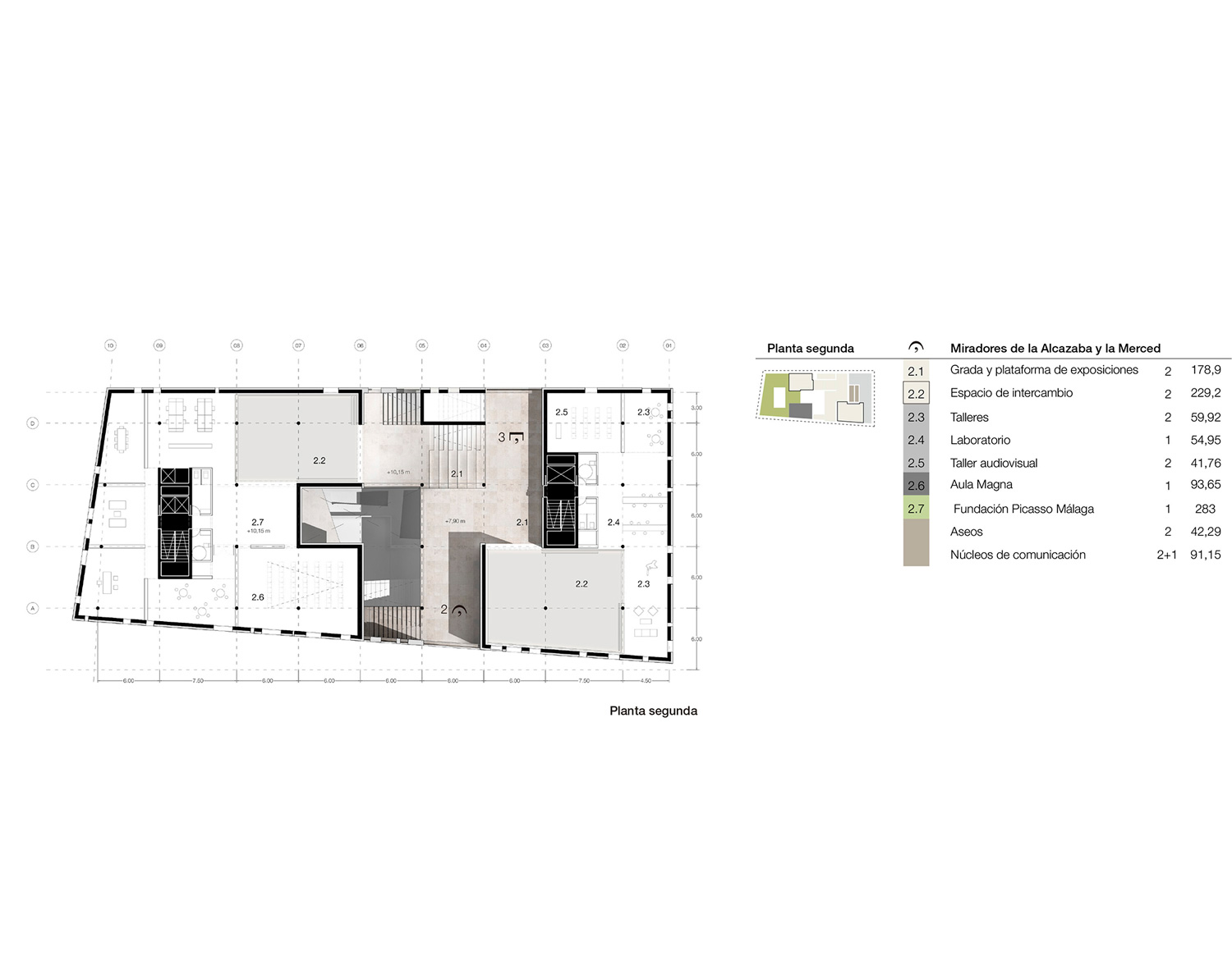El espacio público ejerce la función de junta entre acontecimientos, absorbiendo las variaciones del espacio privado. Se ofrece un espacio a la calle inundable de su ritmo, de ese desarrollo sincopado e intermitente que la caracteriza, un alto en el que refugiarse (malagueña fermata). La excavación necesaria para acordar las cotas de nuestra ciudad y la pasada facilita la oportunidad de introducir un espacio escénico a pie de calle. Por otro lado, el potencial intrínseco de la localización, en pleno centro histórico de la ciudad, convierte el lugar en un espacio para el aprendizaje creativo, buscando contagiar al público del legado cultural e histórico de los bienes que alberga.