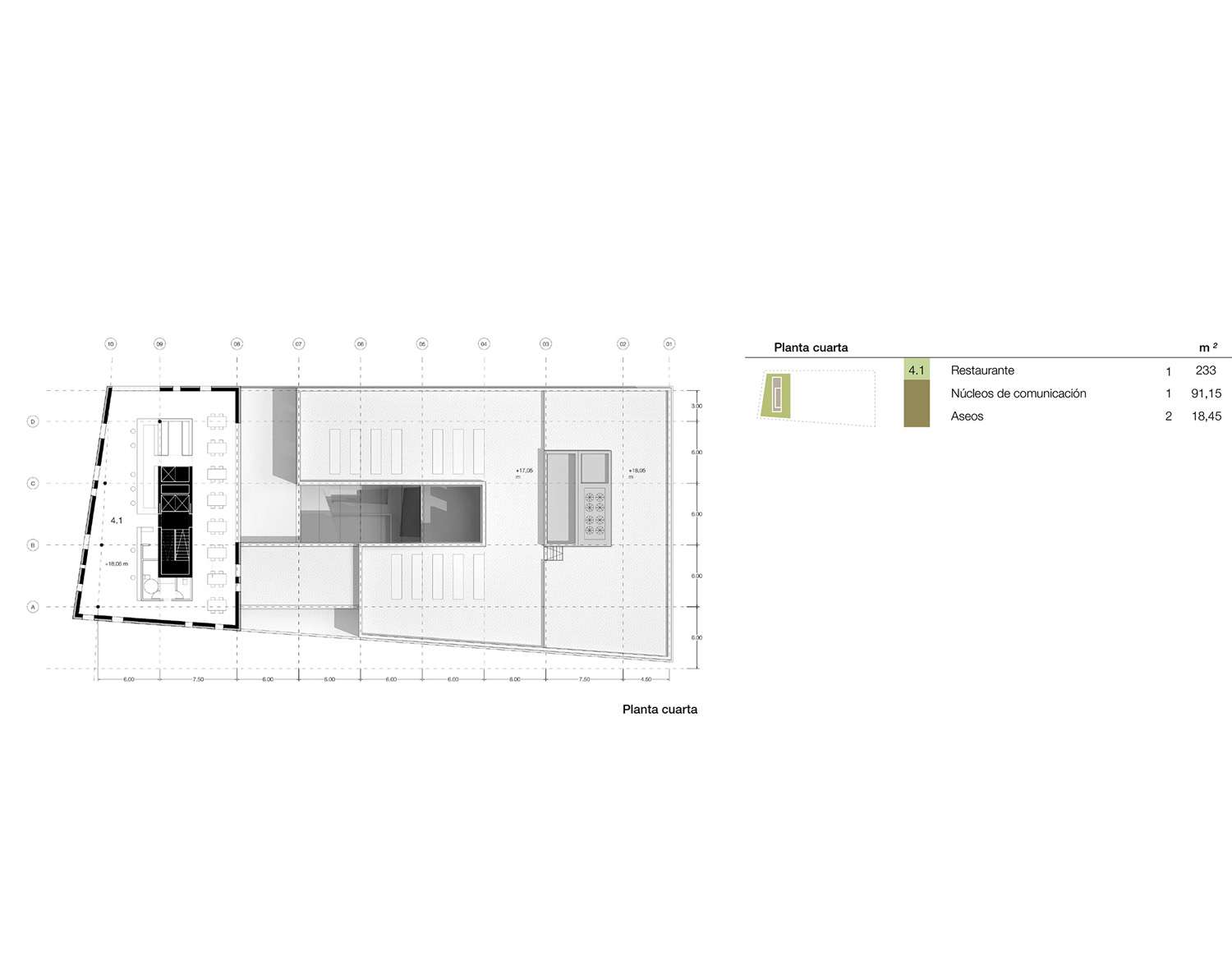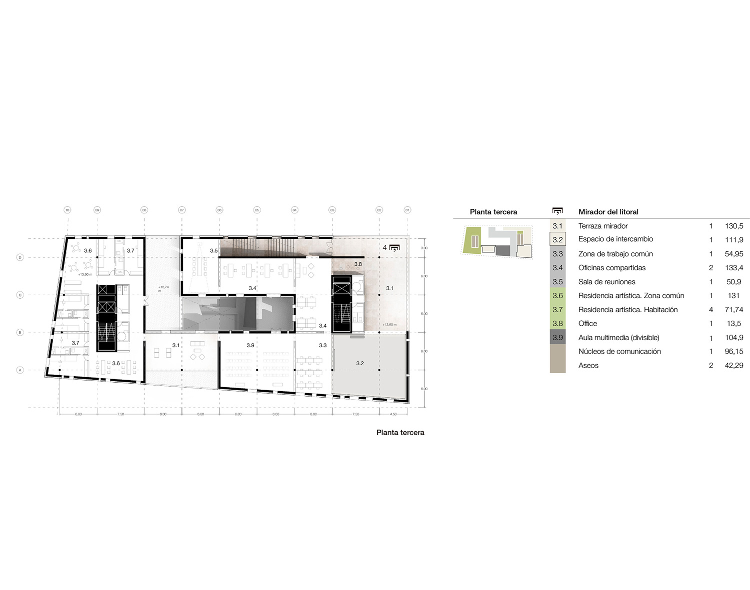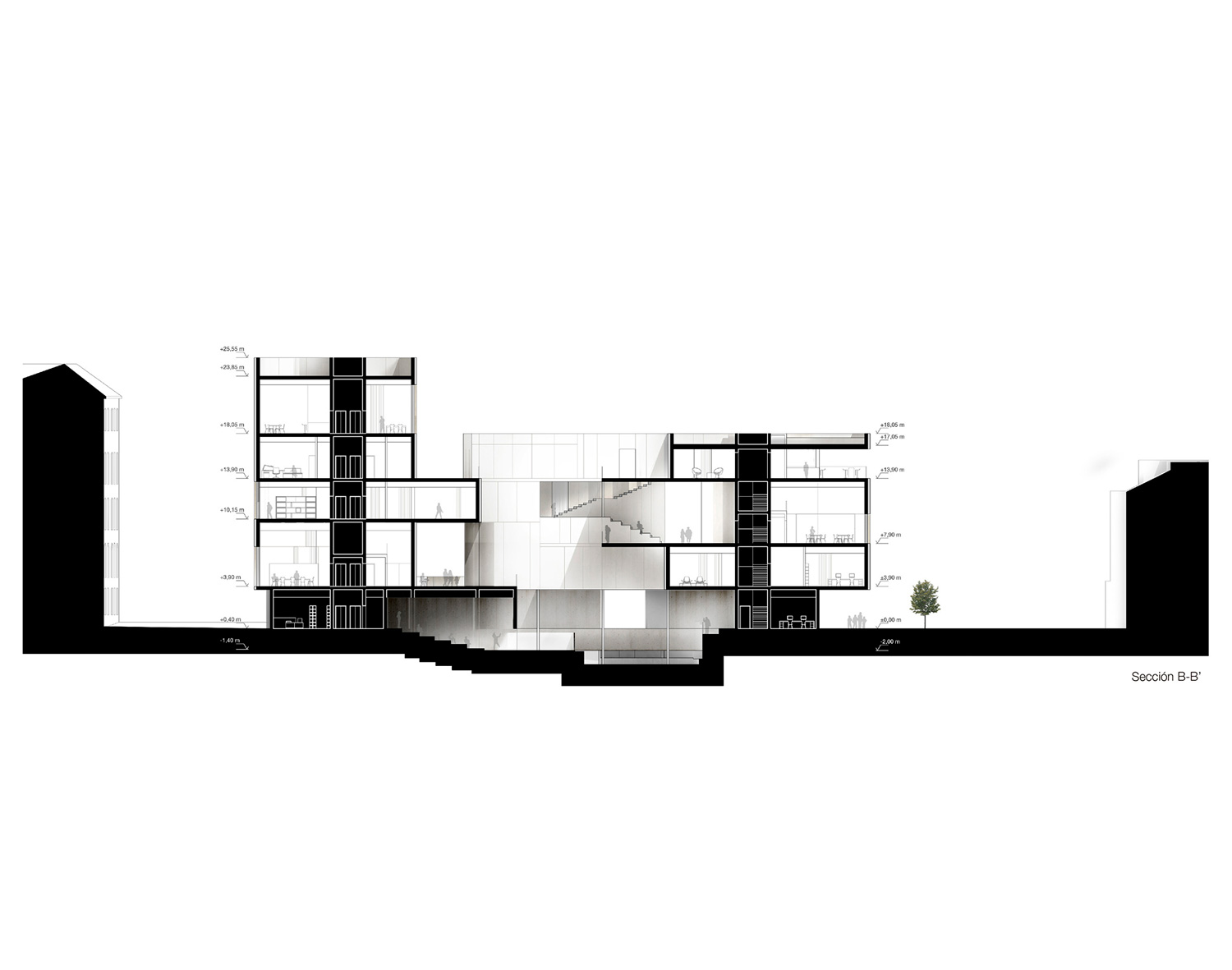 El edificio se convierte en un espacio híbrido donde pueden coexistir diversidad de usos diferentes. El soporte arquitectónico que asumirá el programa privado aparece como negativo de la parte pública, abrazándola, y queda determinado por el espacio libre entre pórticos estructurales, en módulos de 6 x 6 metros. A partir de ellos pueden desarrollarse un elenco de posibilidades que den lugar a soluciones alejadas de convencionalismos o ideales proyectuales. Espacios de confluencia: Entre el vaciado y el programa privado que lo abraza aparecen espacios de transición que funcionan como junta de acontecimientos. Absorben las variaciones de los usos que conecta. Gracias a la modulación estructural se posibilita albergar un tapiz de usos heterogéneos variables en el tiempo.