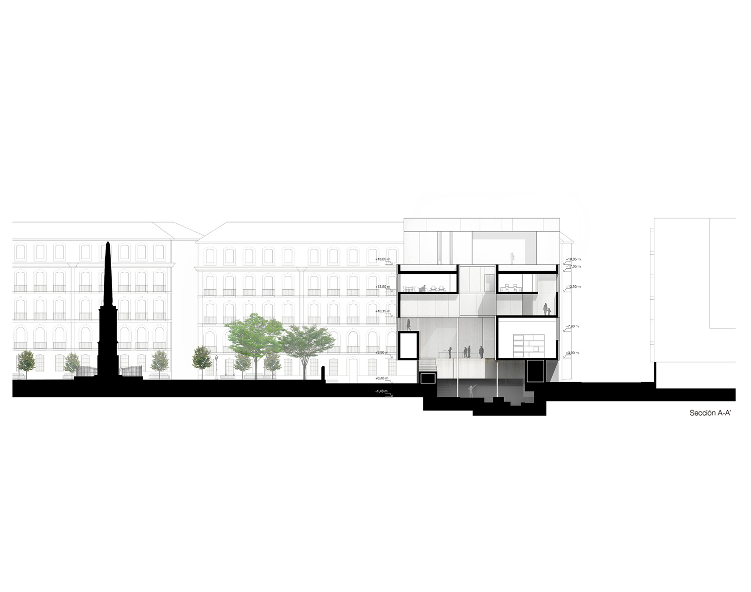 Vaciar el interior del edificio hace que el espectador tome conciencia de éste como espacio. El vacío excavado soporta la carga pública del proyecto mientras protege los restos arqueológicos. El proyecto debe mostrarse y configurarse como una plataforma abierta a la sorpresa. El acto de encofrar convierte el volumen interior en un espacio con características singulares y únicas en el contexto urbano del centro de Málaga. Un lugar para ampliar la apuesta cultural de la ciudad.