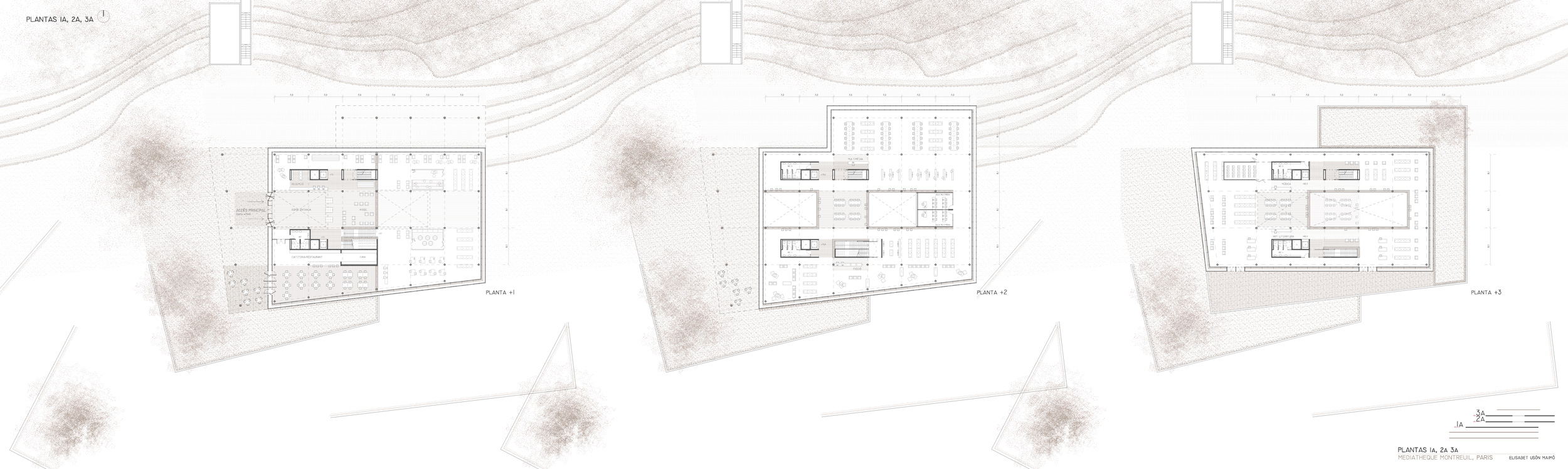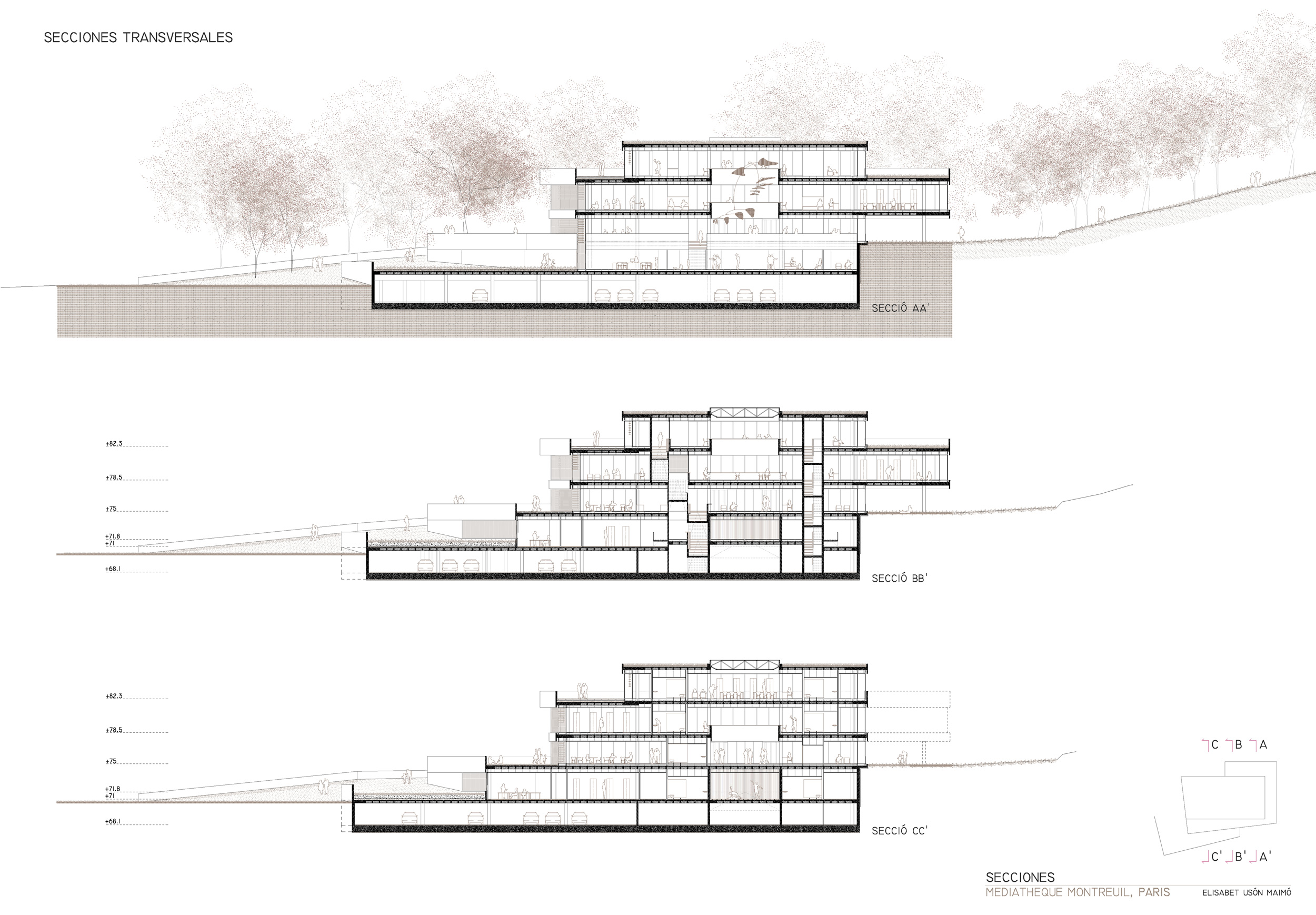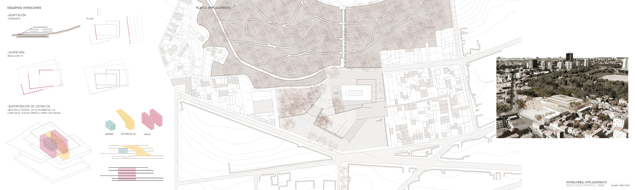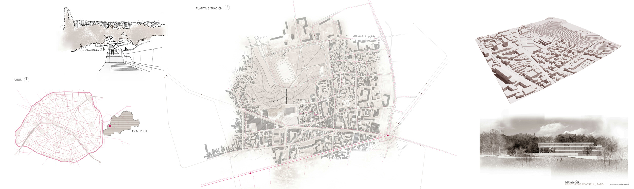 El proyecto se ubica en Montreuil, a la periferia de Paris. Un barrio que debido a su posición y sus conexiones está lleno de actividad. La Mediatheque de Montreuil está situada en un punto urbanísticamente estratégico, a los pies de una colina. Se trata de un equipamiento cultural para el barrio y de un nuevo espacio público que conectará la trama urbana con la cima de la colina donde se encuentra el parque de Jean Moullin, es decir constituirá un nuevo centro urbano y cultural. Podríamos asociar metafóricamente la mediateca con la colina. La mediateca, un espacio permeable que todos pueden recorrer, encontrar su espacio de calma, de relajación o de concentración. Cada uno puede habitar el espacio a su manera. Nos recuerda así el uso de la colina, donde además, la accesibilidad, los recorridos y la cima tienen una importancia máxima.