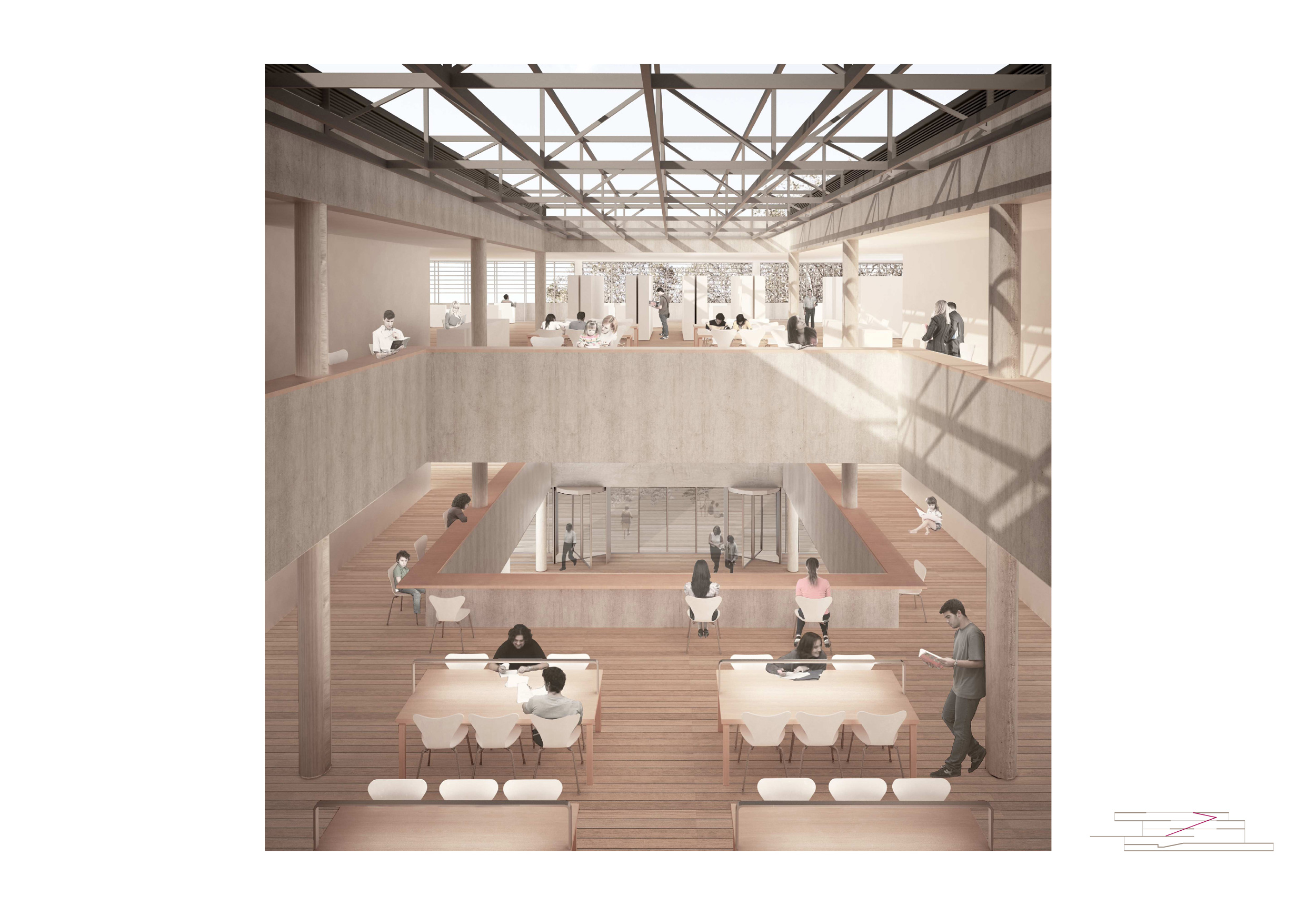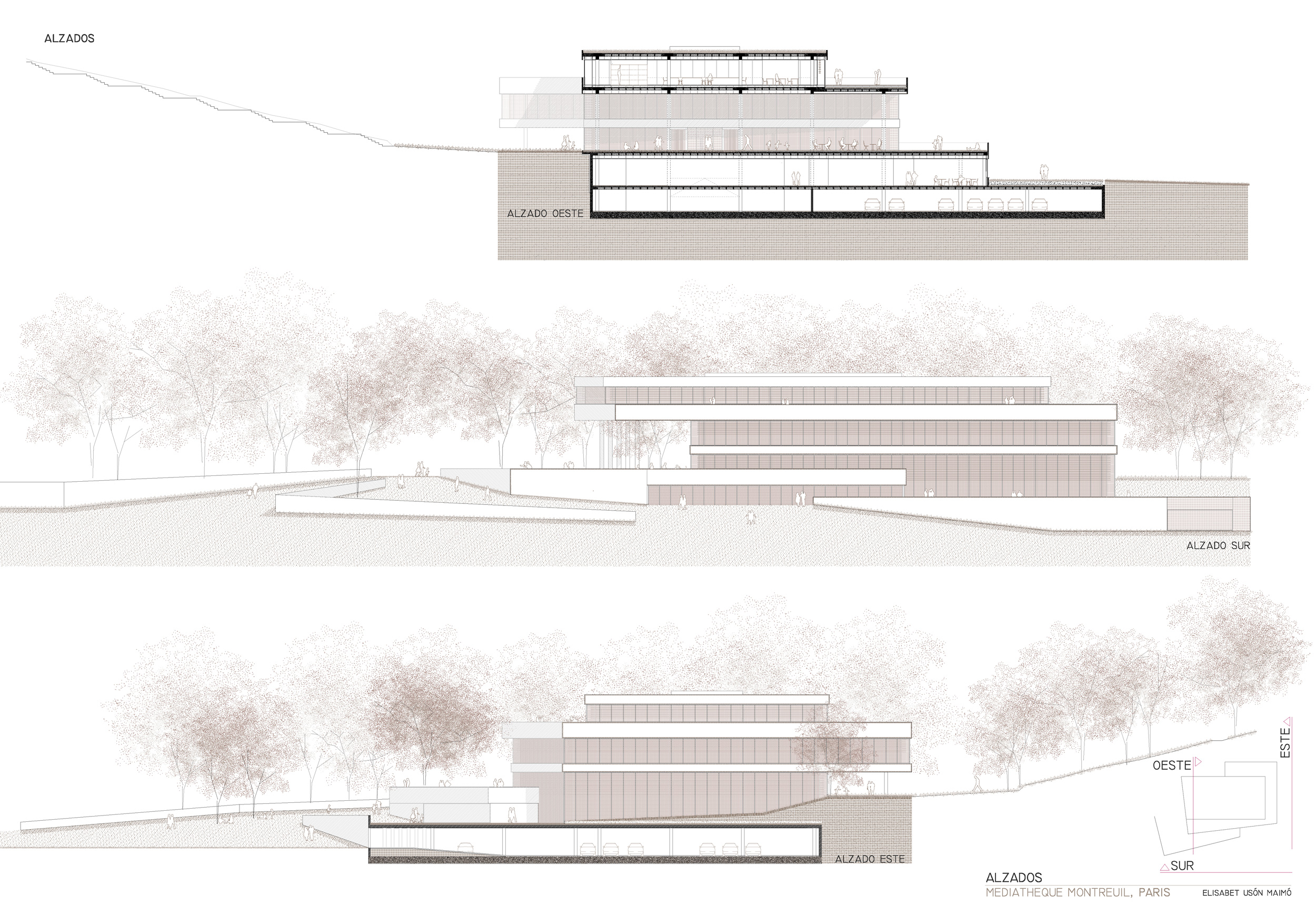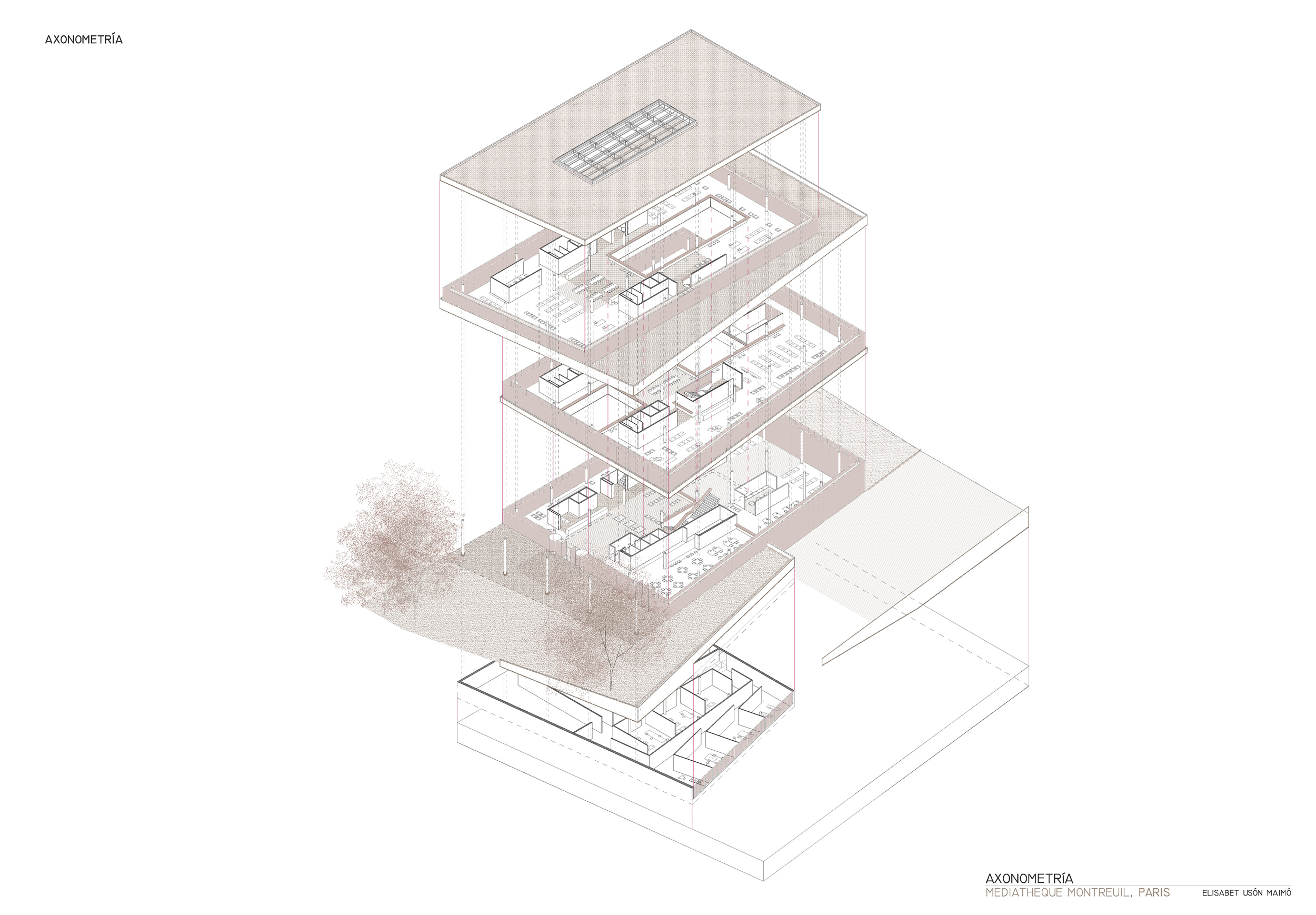 ☉ Mediatheque Montreuil is an academic project by Elisabet Usón for ETSA Barcelona designed in 2014. It is located in Paris France in an urban setting. Its scale is large. Key material is concrete. Concepts such as atrium step and stratification are explored.