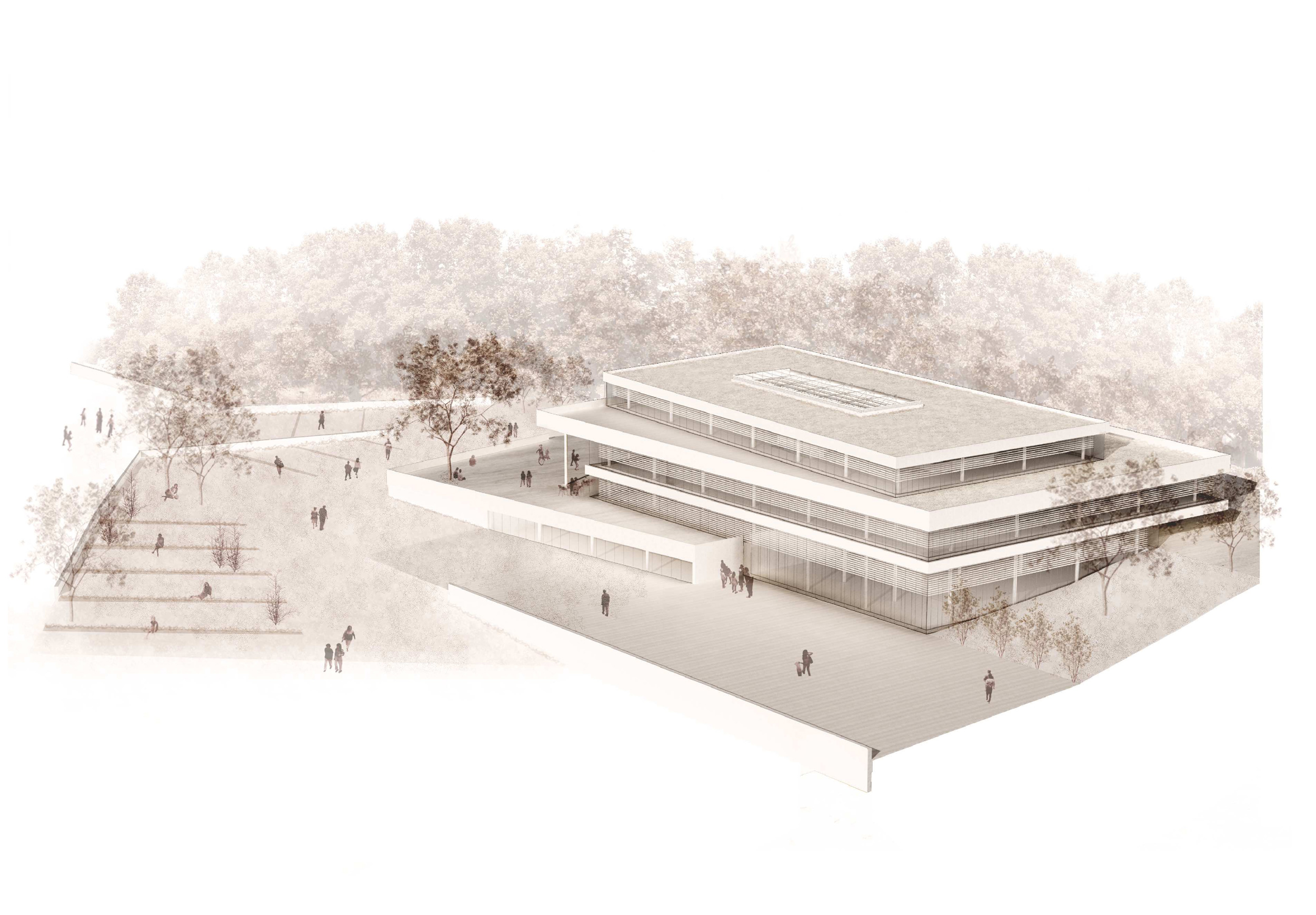 Por tanto la geometría del edificio responde al programa y al lugar; el edificio se puede entender como una prolongación de la colina. Potenciando y enfatizando la imagen de la cima, desde donde se observa su topografía. La respuesta se encuentra en la arquitectura del edificio. El edificio está proyectado a partir de la superposición de plataformas que recuerdan los estratos de la colina. Las plataformas se superponen abriéndose como un abanico siguiendo el movimiento de las curvas de nivel de la montaña y la geometría del tejido vecino, sin perder el ángulo recto. Los llenos y vacíos de las plataformas están concebidos con dos intenciones. La reproducción de la topografía de la colina (sección transversal) y la incorporación de la luz, la organización del acceso y los recorridos internos (sección longitudinal). De forma que la superposición crea un lleno interior (común a todos los niveles) donde se agrupan los núcleos de servicio y las circulaciones verticales, un vacío interior que busca la iluminación natural y un vacío exterior que te conducen al acceso y te enmarcan la escalinata de subida a la colina.
