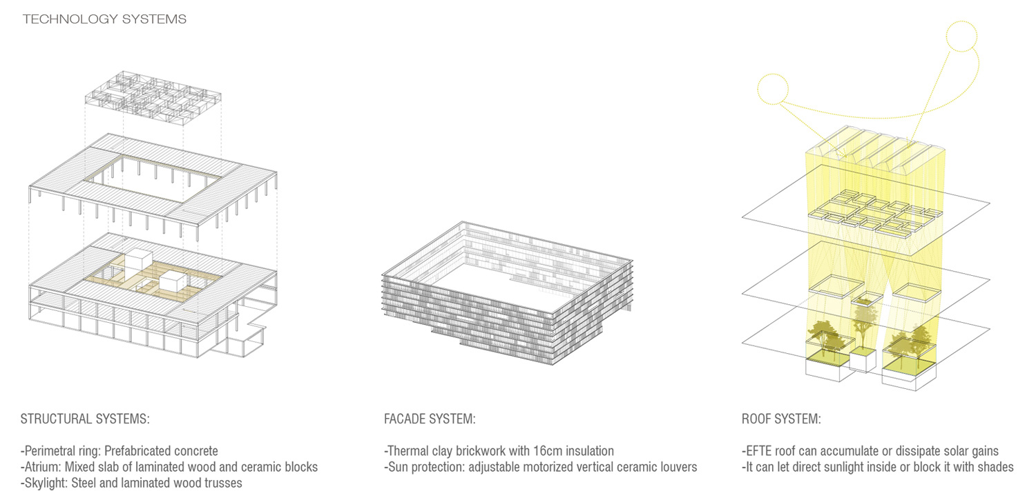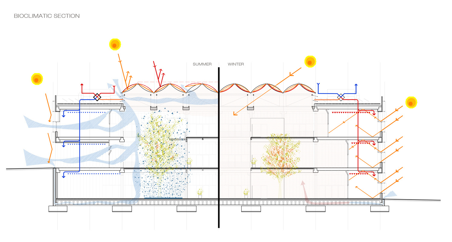 The energetic proposal will minimize the energetic and water demand. Thanks to the insulation solutions and the automated control of sun protection and natural ventilation system, the demand will be minimal all year long and will drastically reduce the operation cost of the building. Climatic behavior of the building will be monitored and will constantly provide data that will help to improve the automated control and therefore progressively optimize the energy demand.