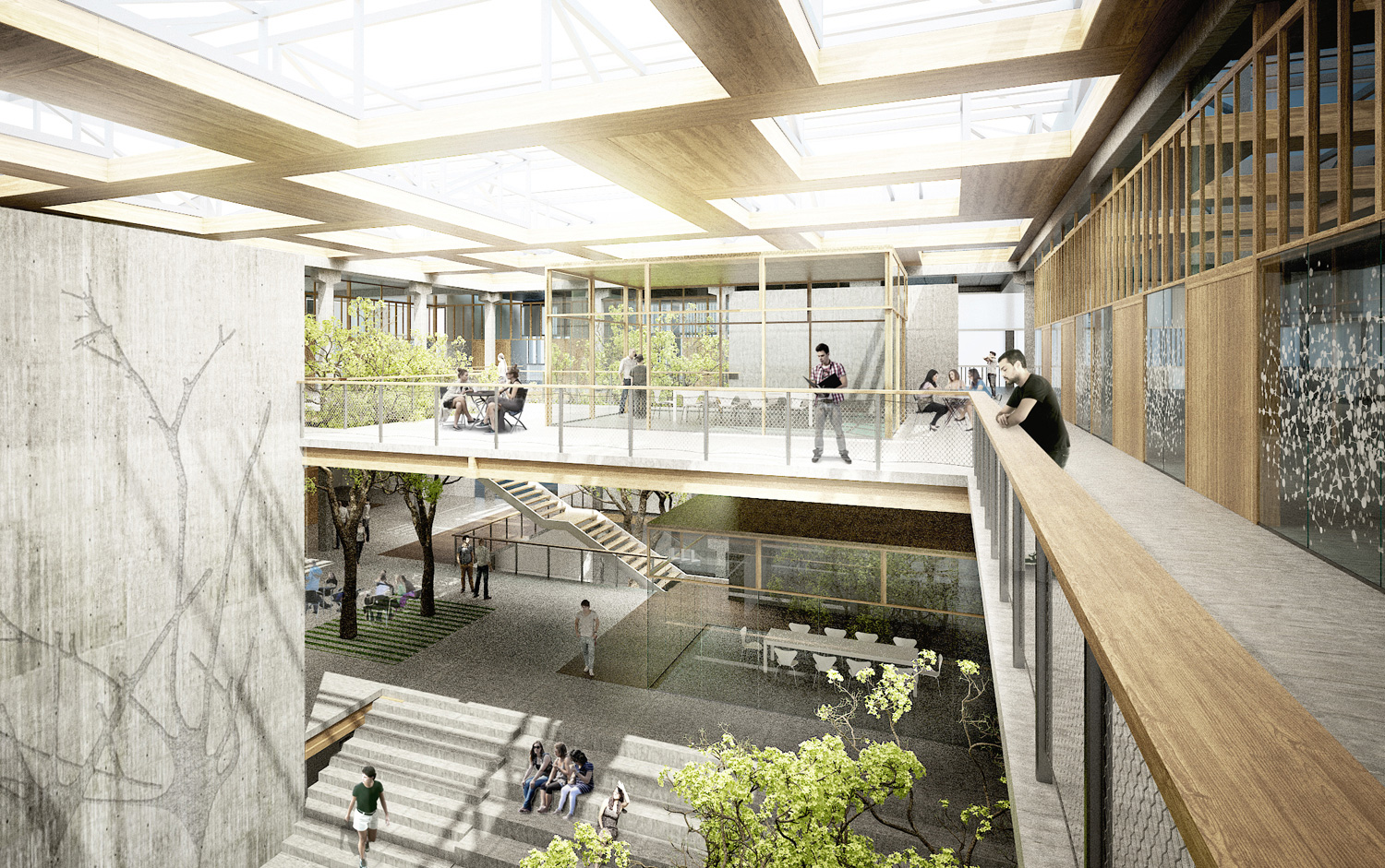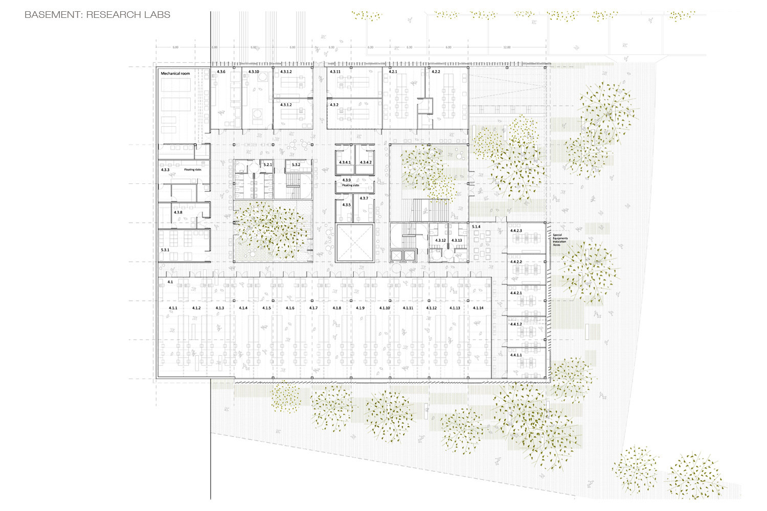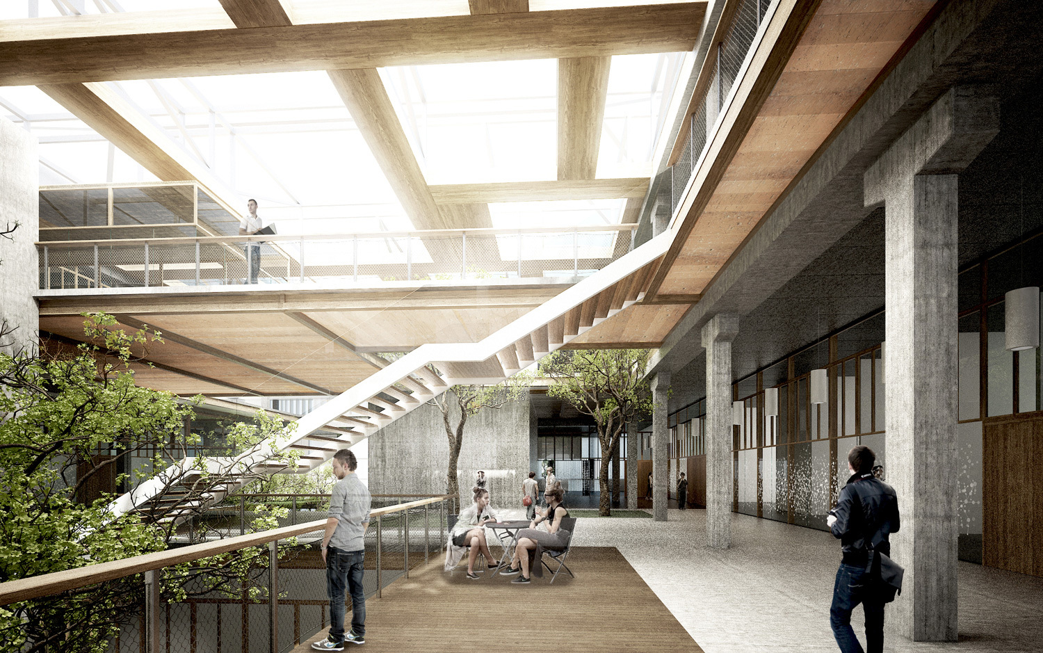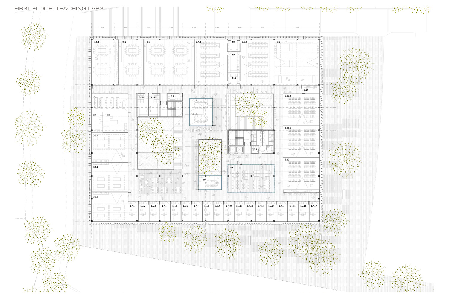 The building typology aims at creating a Campus within the Campus: A space where interaction among students, faculty members and researchers can facilitate debate, creativity and potential fruitful collaborations. A cloister configuration with different programme entities around a central circulation and relational space is the simplest and more effective solution to promote interaction between the different types of population. The central patio is the social core of the building and its bioclimatic lung and regulator.