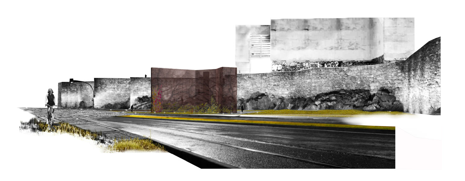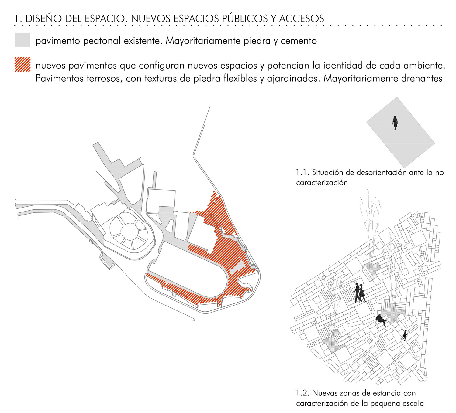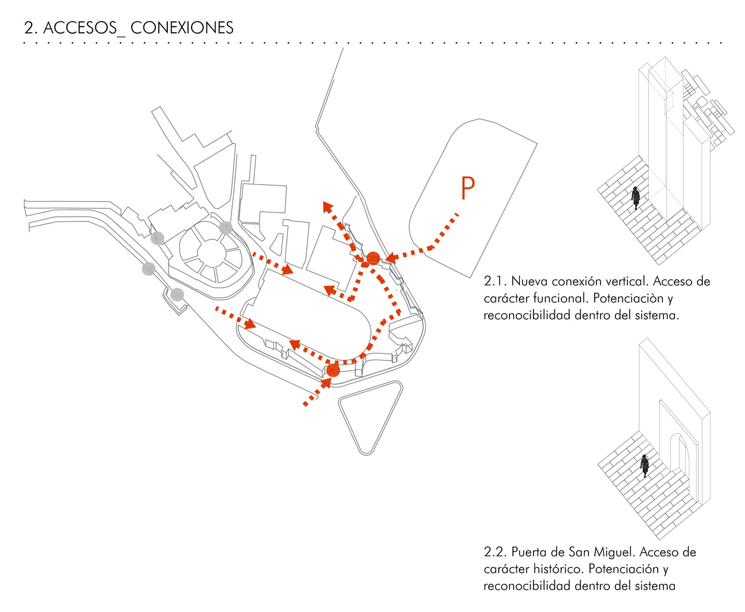 El ámbito objeto de la intervención se caracteriza por aglomerar un carácter de identidad histórica de notable importancia y un posicionamiento estratégico y comprometido en la estructura funcional moderna de la ciudad, además de repercutir internamente la coexistencia de los diferentes elementos arquitectónicos que hacen uso de gran parte del ámbito simplemente porque subyace a ellos. El primer factor considerado es el de recuperar la lectura de punta amurallada como espacio público y de atractivo para la ciudad, se trata de patrimonio, es una riqueza irrenunciable. Para ello la propuesta, en la zona intramuros, propondrá un tratamiento sencillo que configure un borde con carácter propio y adaptado al uso de visitar la parte alta de la muralla, un lugar enriquecido con zonas para estar y en cuyos materiales resuene su identidad originaria. El segundo factor es el de las conexiones y la accesibilidad dentro del sistema ciudad, por un lado se contempla la relación hacia el interior, hacia el frente de los Jardines de San Carlos, se trata de la conexión con otro perímetro histórico con el que la propuesta abre un mayor diálogo dirigiendo y facilitando las relaciones a través de las texturas de pavimentación que dan continuidad.