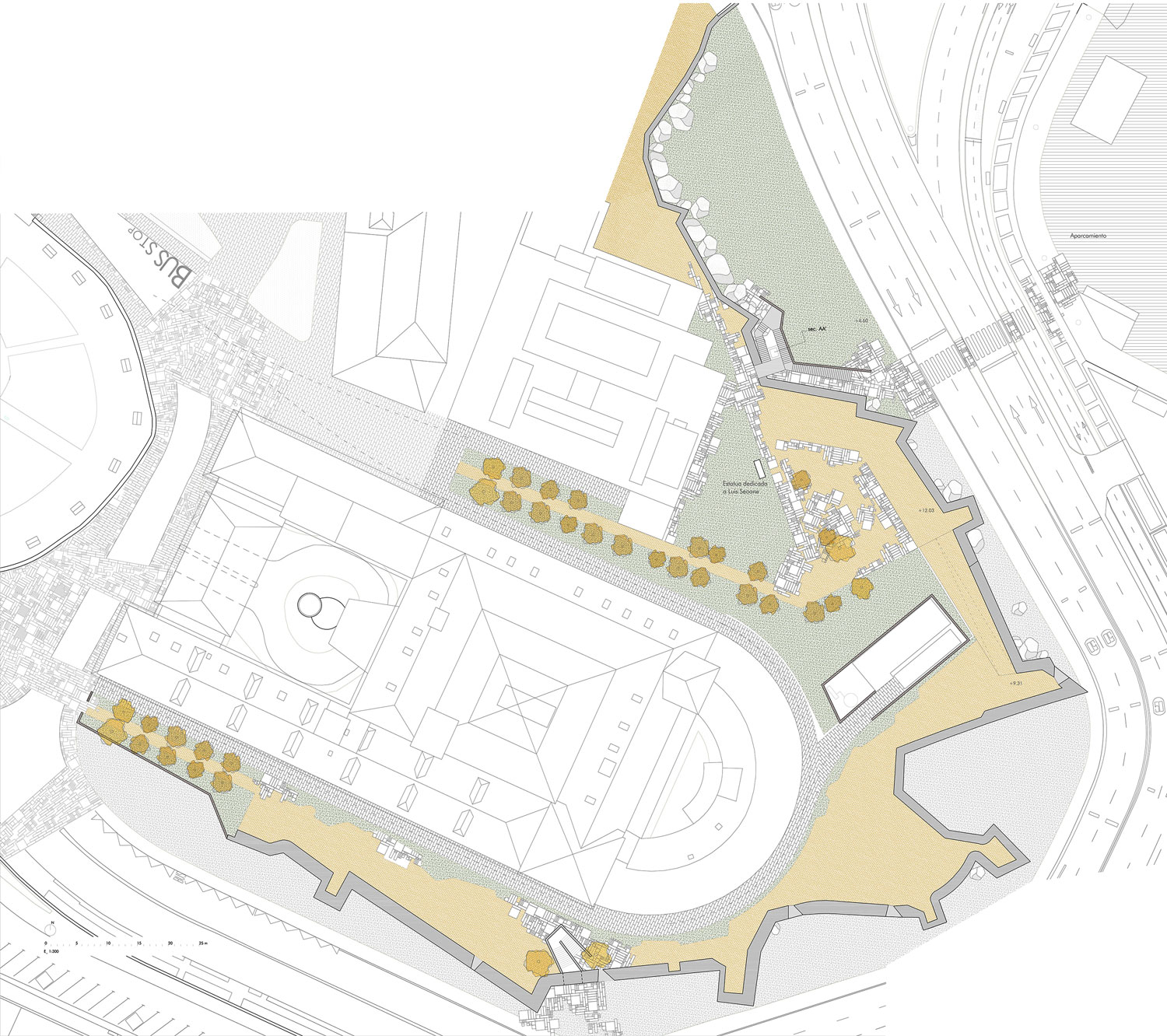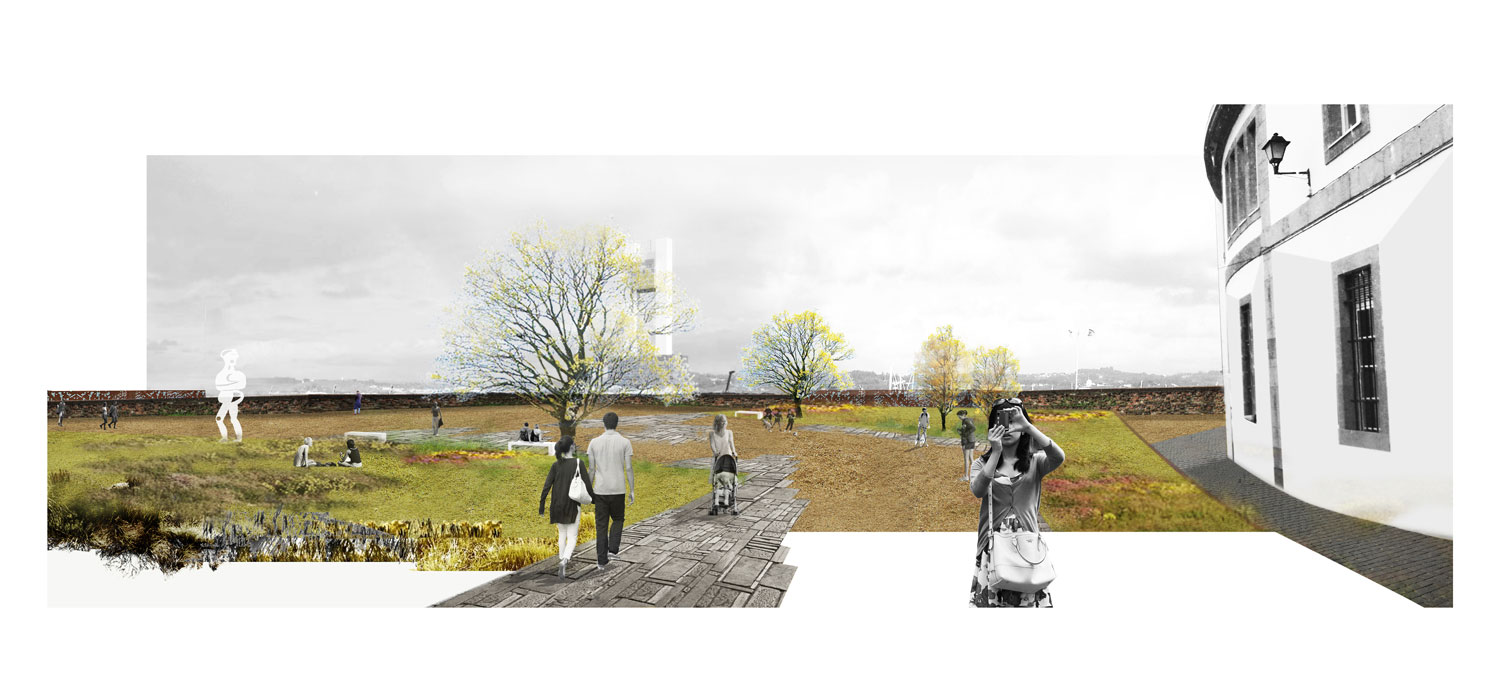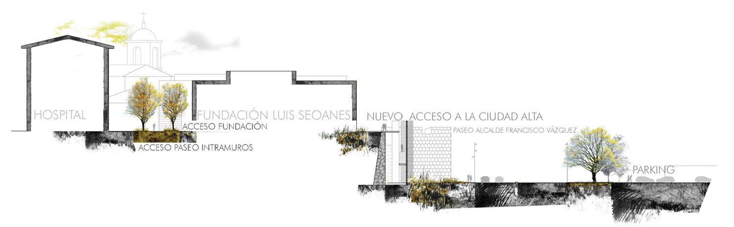 Hacia el exterior de la ciudad también se reclama una continuidad que facilite el acceso desde la cota inferior de las murallas y sobre todo que permita utilizar el aparcamiento de las infraestructuras naúticas para descongestionar el uso de aparcamiento de la Ciudad Vieja, se propone un nuevo acceso vertical a las murallas mediante la superposición de una segunda piel en tramex que transpira visivamente y alberga una escalera ligera metálica y un ascensor. El tramex consiente la incorporación de la vegetación e igualmente se propone para ayudar a la integración del depósito e instalaciones del Hospital intramuros y en el primer tramo de cerramiento en el acceso noroeste. Gracias al nuevo acceso vertical y a las demoliciones previstas se diseña un nuevo espacio en el cruce entre la llegada extramuros, el recorrido perimetral intramuros y la fuga hacia el interior de la Ciudad Vieja, en este punto, junto con un nuevo jardín adyacente a la Fundación Seoane se crea una nueva plaza con el mismo lenguaje al del resto de la propuesta. La configuración de pavimento en piedra propuesto se emplea como elemento recurrente que se intercala ya sea con los pavimentos existentes que con tratamientos vegetales o terrosos continuos, evidenciando situaciones a modo de hito a la vez que favoreciendo un cosido entre las partes.