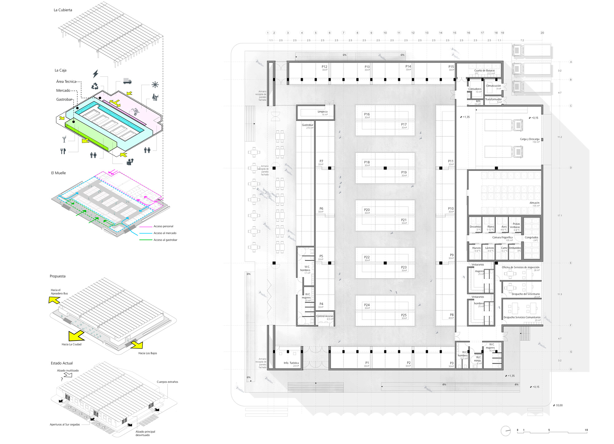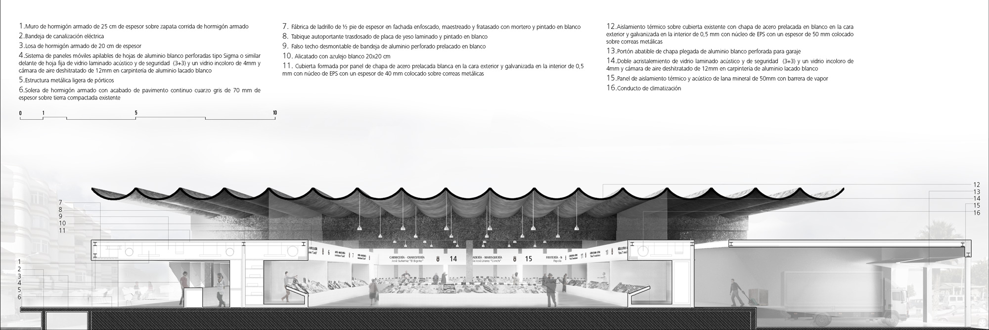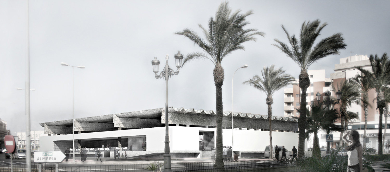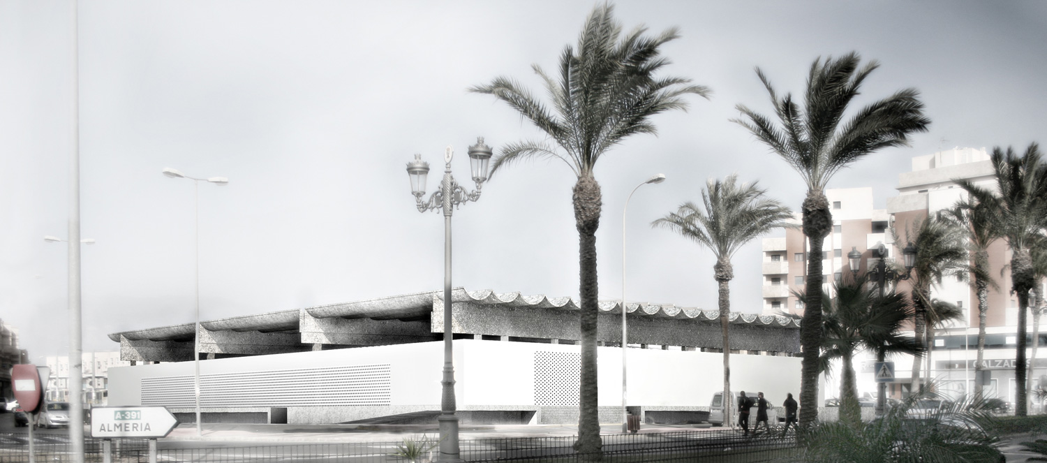 El ayuntamiento de Roquetas de Mar, Almería (España) sacó a concurso la recuperación del Mercado de abastos, con la intención de formar parte de una serie de intervenciones en la ciudad que transformarán y actualizarán sus infraestructuras y su imagen urbana. Roquetas de Mar es un localidad con gran potencial turístico por su costa y económicamente pujante por ser una localidad epicéntrica de la producción agrícola de los invernaderos de Almería. El edificio existente del mercado es una edificación con un estructura muy interesante compuesto principalmente de una cubierta de piezas de hormigón pretensado de mediados del siglo XX y herencia de las vanguardias de la modernidad española. Esta estructura apoya mediante pilares de hormigón armado sobre un podium con un muelle perimetral que requería ser adaptado a las nuevas exigencias de accesibilidad. El programa de necesidades consiste en un sistema de puestos de mercado que permitieran ciertas flexibilidad de composición y adaptables a diferentes usos, así como los espacio técnicos que requieren este tipo de programas, y como objetivo principal, integrar dicho mercado con los usos más contemporáneos de lugar de ocio y tiempo libre mediante un gastrobar que debería ser protagonista del nuevo mercado.