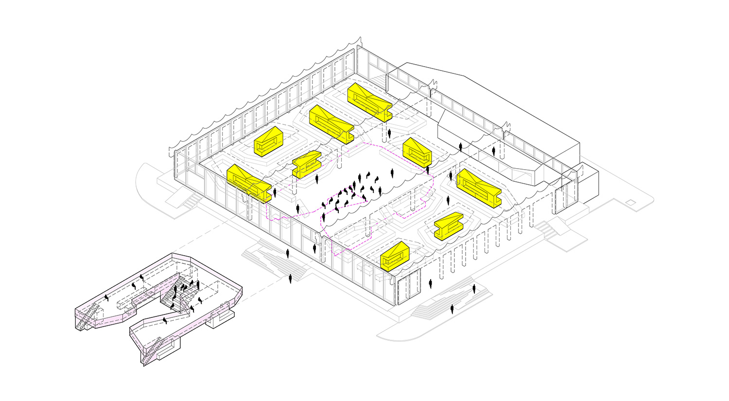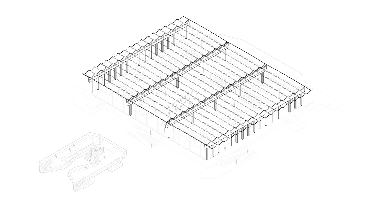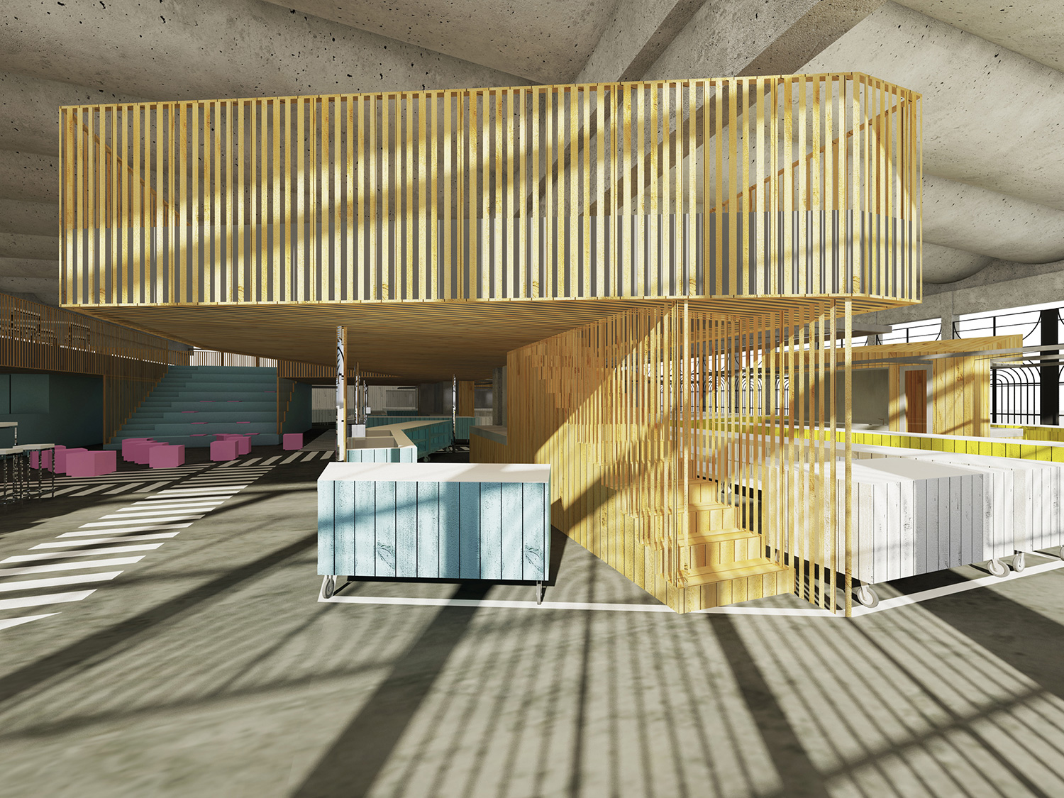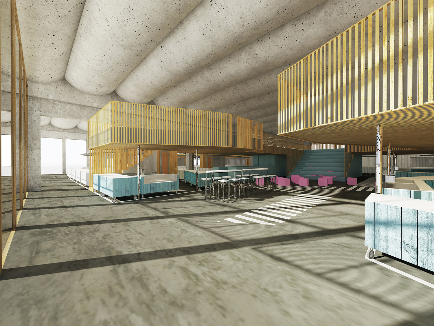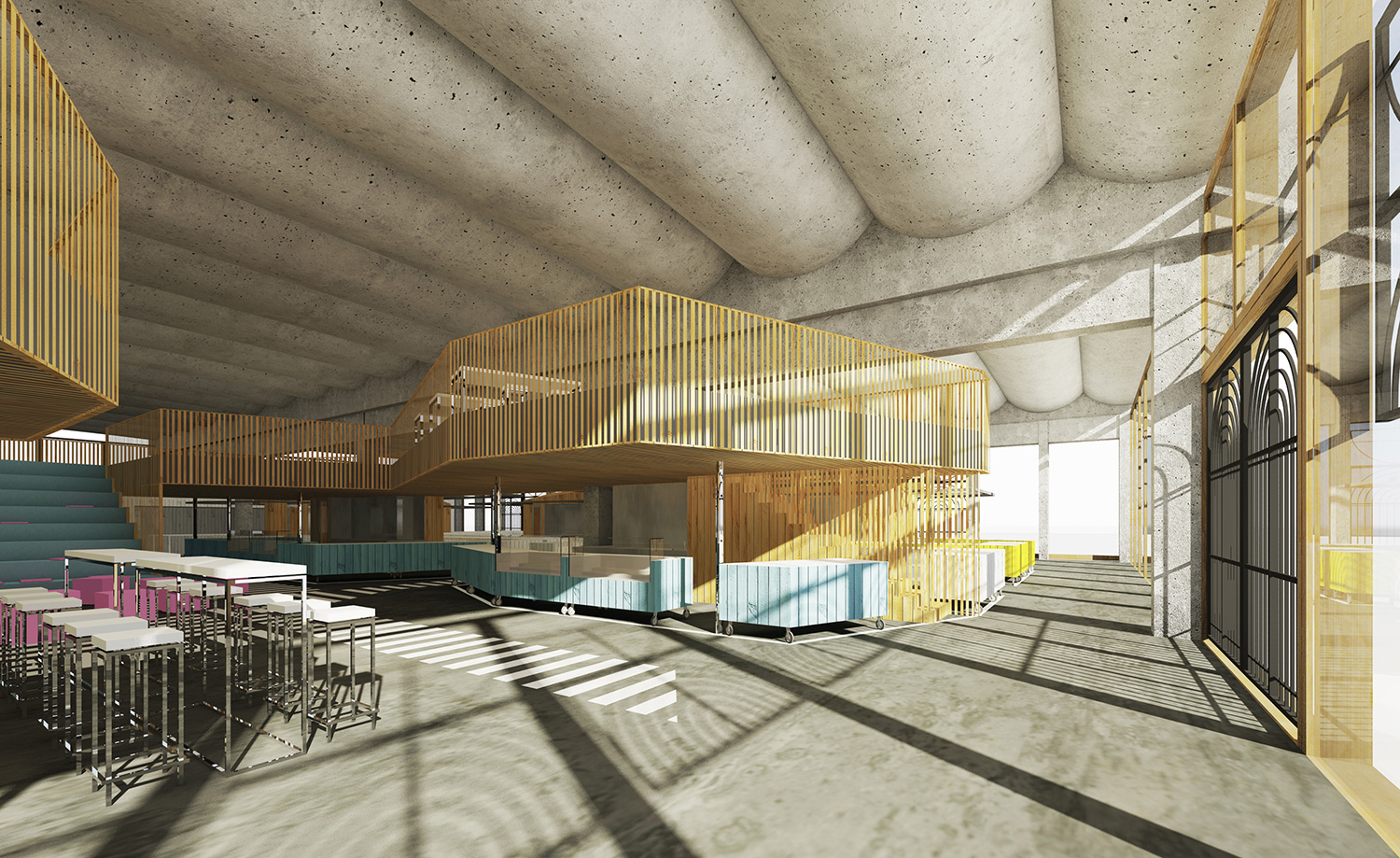 La estructura sin las fachadas existentes se hace presente como el gran apoyo de la cubierta cuya sección se potencia en los extremos. La cubierta adquiere aún más peso en el proyecto, por ello se propone exenta de instalaciones, y harán tareas de limpieza de la pintura existente. La solera actual se sustituirá por una nueva de 20cm y cota -50 cm respecto la actual, para reformar el sistema de saneamiento y servir de base de un pavimento técnico que incorporará todas las instalaciones del mercado. Los puestos están formados por módulos que se repiten en planta, uno rectangular y otro irregular que permite oxigenar los cruces entre los pasillos del mercado. Cada puesto se forma de dos, tres o cuatro módulos según necesidades, y forman agrupaciones delimitadas por una línea perimetral en el pavimento técnico de paneles de acabado en microcemento. Cada agrupación dispone de mueble fijo o núcleo (cuya cubierta está inclinada a dos aguas para contrastar con la horizontalidad del edificio existente), y muebles móviles o mostradores móviles (cuya configuración es flexible dentro de los módulos).