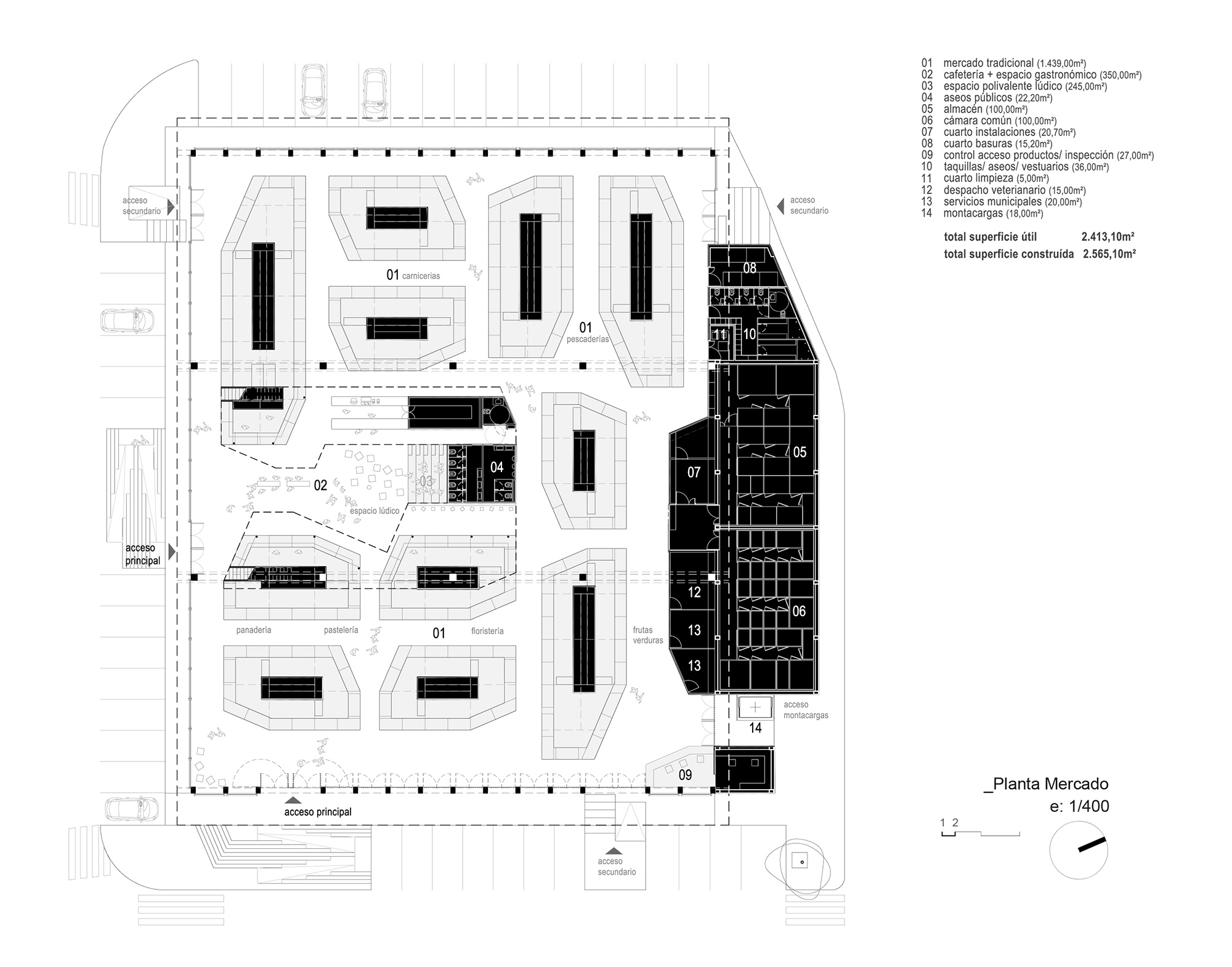 ”Mantener el carácter» recuperando la esencia e identidad formal de la cubierta y la estructura como elementos singulares principales; reutilizando las carpinterías metálicas como elementos singulares secundarios; y reformar el volumen de servicios de almacén en la calle Dr. Osorio Martínez, accesos de rampas y escaleras, y la solera interior del mercado. «Derribo» de elementos no singulares, como los volúmenes anexos en la fachada Oeste que parasitan el edificio, la fachada hacia la plaza Norieta, los cerramientos de la fachada Este y Oeste, y los tabiques interiores de reformas del edificio. ”Transparencia» y liberación en fachada, que permita la entrada de luz natural en su máxima superficie, y una nueva conexión de apertura entre el equipamiento y el espacio urbano. «Nueva configuración» de mercado: desarrollando el programa en «paquetes volumétricos o muebles» (puestos de mercado y espacio lúdico), como piezas de contraste y generación de diferentes espacios característicos, que se aíslan de la fachada y de la estructura existente para mantener la esencia espacial; «Alineación y dirección» de las parcelas siguiendo los ejes del edificio y de las ejes cardinales para generar chaflanes que permiten una mejora de la movilidad; «Flexibilidad» pudiendo utilizar el espacio lúdico y el espacio de mercado de forma independiente, disponer de espacios burbuja o de respiración en el acceso al edificio y el espacio lúdico, y modificar la configuración de los puestos de forma libre por el vendedor teniendo la posibilidad de aumentar los espacios libres para un evento; El espacio lúdico se convierte en «referencia espacial», con una planta primera de uso flexible, grada-escalera o mini auditorio, cafetería, gastro-bar, artesanía…, siendo el corazón del proyecto.