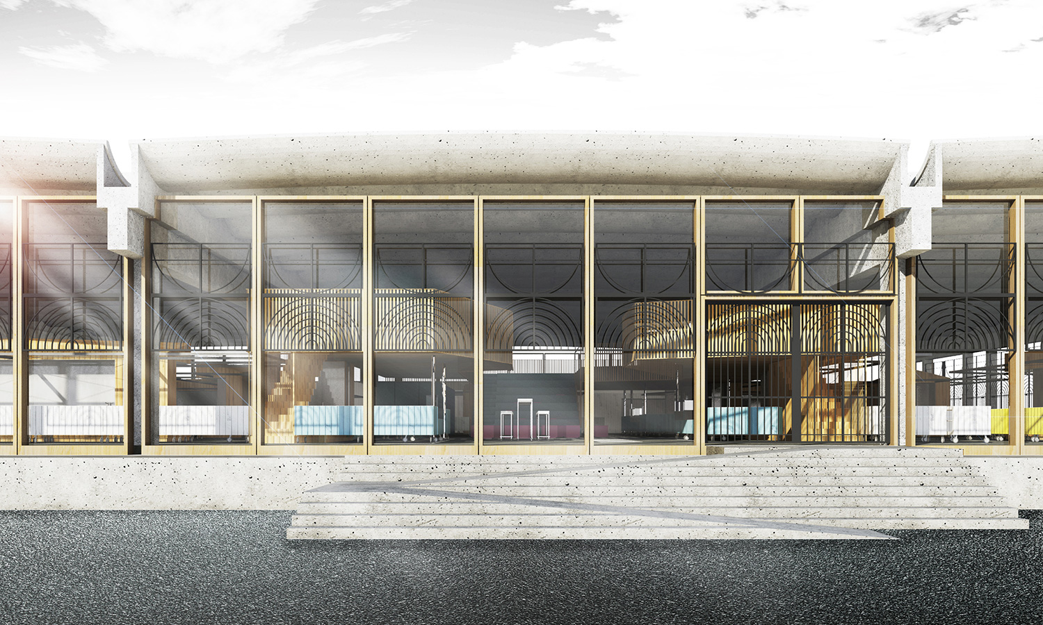 La fachada transparente se conforma en tres capas: carpintería de madera y cerramiento de vidrio, carpintería de acero existente como parasol, y la propia volumetría del programa interno creando diferentes profundidades a la composición de fachada desde el exterior, y aumentando la sensación de estar en un espacio público abierto. Las carpinterías son módulos de madera microlaminada prefabricada de diferentes alturas, sección 8x20cm en todas las fachada, 8x30cm en fachada Sur, y vidrio de templado 6/12/6. El cerramiento de vidrio se hace presente en las cuatro fachadas: en la fachada Este completa 4 módulos entre pilares de suelo a techo (para el resto se reutiliza las puertas existentes), en fachada Sur la carpintería se adapta a la distancia entre pilares incorporando las puertas y rejas existentes, en fachada Oeste se utiliza el mismo concepto que en la opuesta en la totalidad de huecos, y en la Norte se produce el mismo caso que en fachada Sur con carpinterías de menor altura colocadas sobre el volumen existente de servicios. La fachada se coloca por la cara exterior de la estructura, facilitando la colocación y modulación, siendo la estructura en espectador del nuevo cerramiento. La materialidad de fachada en los volúmenes de servicio con mortero monocapa de cemento y cal en tono gris. Los huecos de las puertas de almacén serán cerrados con ladrillo y posteriormente revestidos.