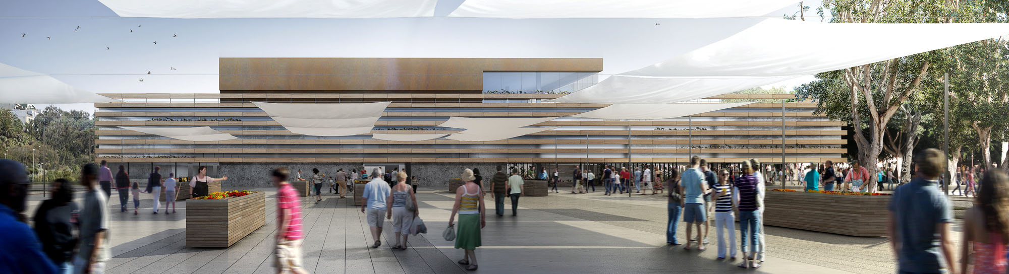 – Conexión urbana: El nuevo Mercado hará de charnela entre la plaza antigua del Adelantado y la nueva plaza del Barranco. El edificio se levanta en su frente del plano del suelo por medio de un gran volado, buscando generar un espacio abierto que sirva de umbral de acceso al edificio y se constituya como una articulación, una plaza cubierta llamada a conectar la plaza del Adelantado con la plaza del Barranco. En planta baja se respeta la alineación tradicional por medio de una superficie acristalada que permite su total apertura.