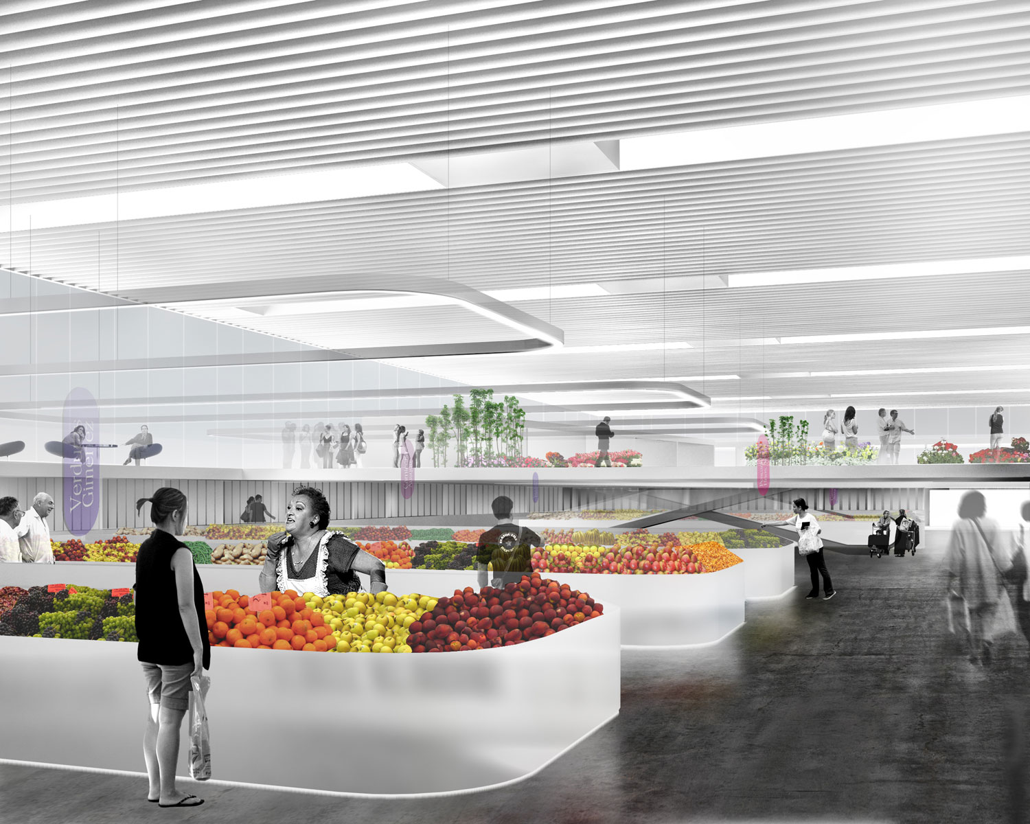 Espacios interiores y exteriores se entrelazan generando actividad en los espacios exteriores contiguos al Mercado y al mismo tiempo, generando espacios interiores de relación social. Proponemos un Mercado como extensión del espacio público, que invita a acceder y acoge al visitante con espacios amplios y diáfanos. Los límites entre interior y exterior se diluyen. Acercamos el espacio interior de intercambio y sus productos al ciudadano buscando su participación e implicación.