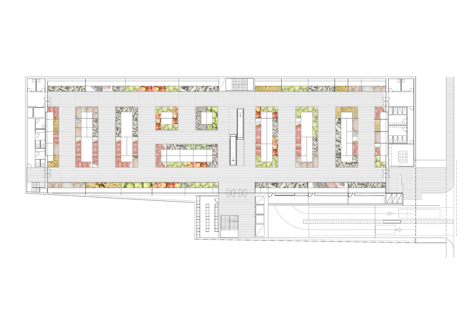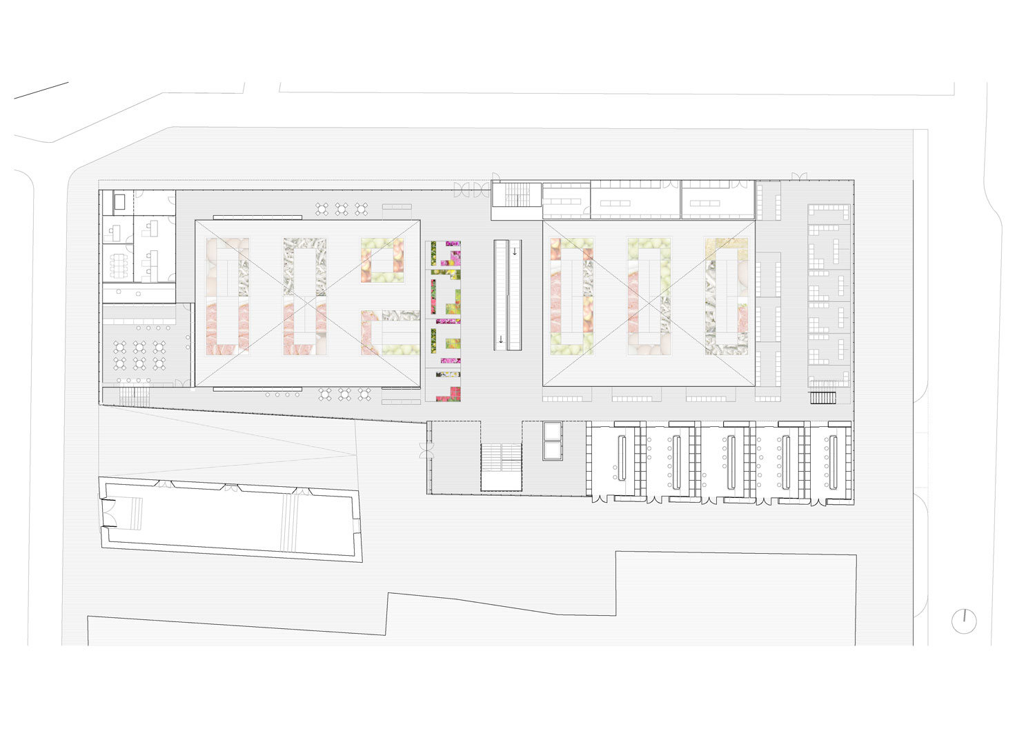 Conectamos todos los espacios interiores y exteriores en secuencia para dar la posibilidad de establecer un recorrido continuo. Se organizan todas las paradas del mercado en una misma planta de modo que disponen de igualdad de condiciones. Al mismo tiempo, en las plantas superiores se estructuran los espacios de manera que se puedan dividir generando diversas sales de uso autónomo.
