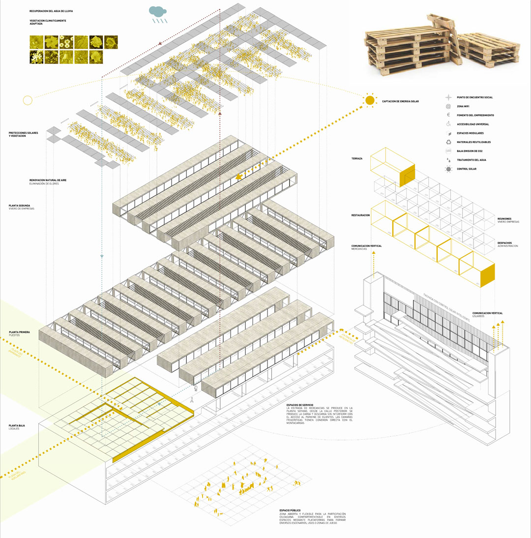 Flexibility and modules. The pallets concept leads us to a geometric and technologic approach. Modulation and prefabrication of elements allows various sizes of spaces by addition of basic units. We propose bigger shops downstairs, modular kiosks at first floor and co-working offices at second floor. These last two follow the same modulation so can switch. A linear block in the south part concentrates the managing uses as well as restaurants at ground level, and connects the different levels through a ramp. Loading areas and a car park are located in the basement.