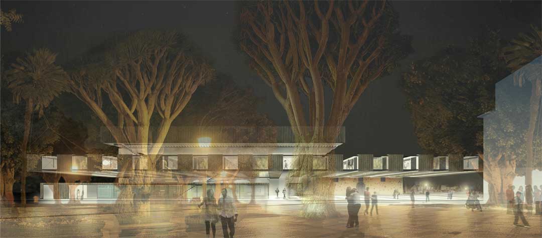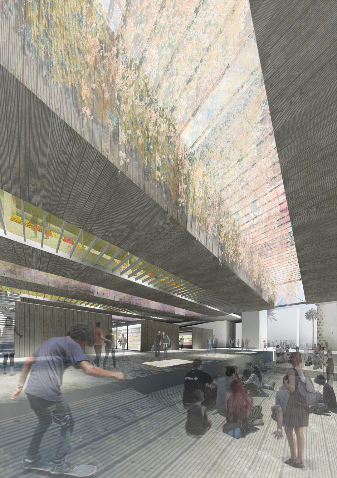 The market is located in the intersection of two public squares. The aim of our project is to become a joint between them. With that purpose, we propose a covered public space, flexible enough to host any kind of community events: assemblies, performances, sports, playgrounds, etc. This is achieved by the modulation of the ground in movable platforms like those used in theatre. We actually use the small church of san Miguel as a background for our scene.