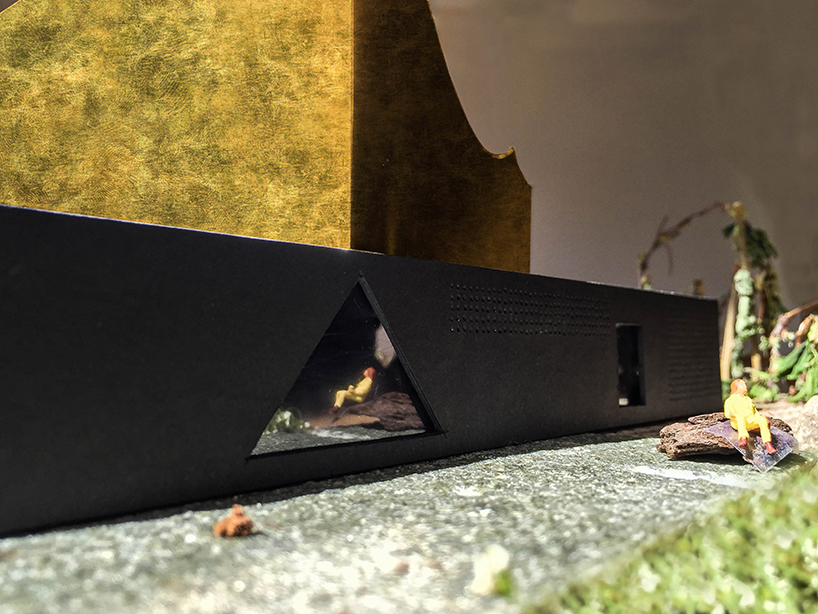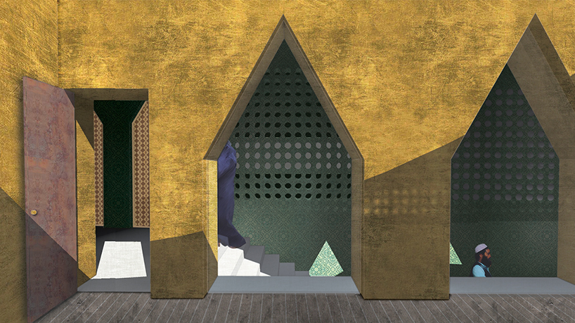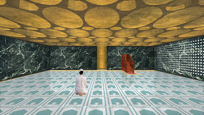 The reminding are to the atmospheres of the shiny golden pick of the Landmannalauga region, to the golden land of the Mýrdalsjökull Glacier and the Katla Volcan and to the black of the Vík í Mýrdal. On top of this the use of material with a short distance origin is also an eco-friendly strategy in order to reduce the impact of the building. The stone volume is related to the earth in the ground floor while the golden metal transforms the worship in a suspended volume that recalls to a mystic dimension. In addition to that a tiny tower 19m-tall with a focus on the “qibla” become a landmark for the surrounding and a place of meditation for the visitors. Every room is a storytelling of the rituality, of the tradition and so of the Islamic culture. The common ground of the space, is a ceramic paving that use several textures in order to help the definition of the singular rooms and to enrich the high quality of the architectural detail.