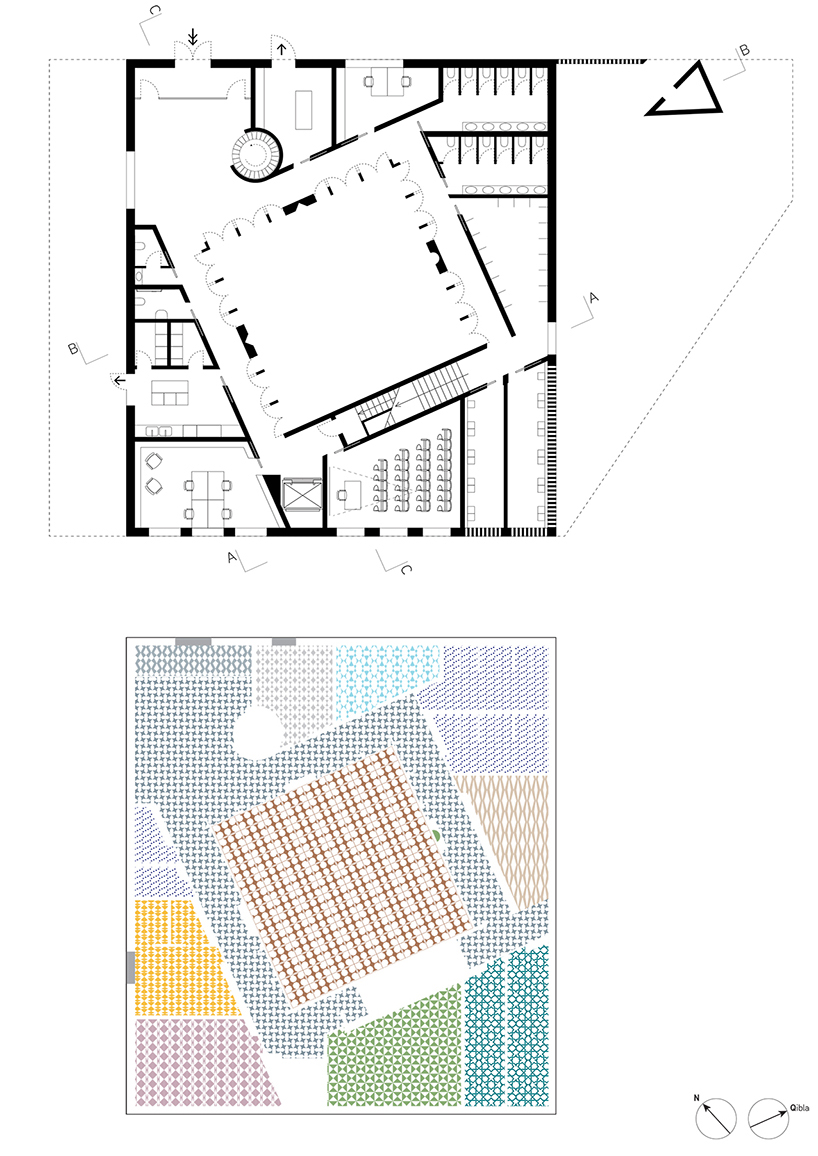 All the functions are located along the perimeter of the central assembly hall. The office and the embalming room are located close to the entrance and clockwise direction a ritual sequence of restrooms, cloackroom, ablution rooms led the people to the stairs where going up, the worship could be reached. On the other direction the kitchen is located in order to be easy connected with the exterior; while the functions related to the research: the library and the classroom are easily darken but keep a meditative view towards the park. Under the main stairs a service stair is located to allow the connection with the storage for the assembly room and the technical room. Both are reachable also with the lift in order to have a complete universal design in the entire building.