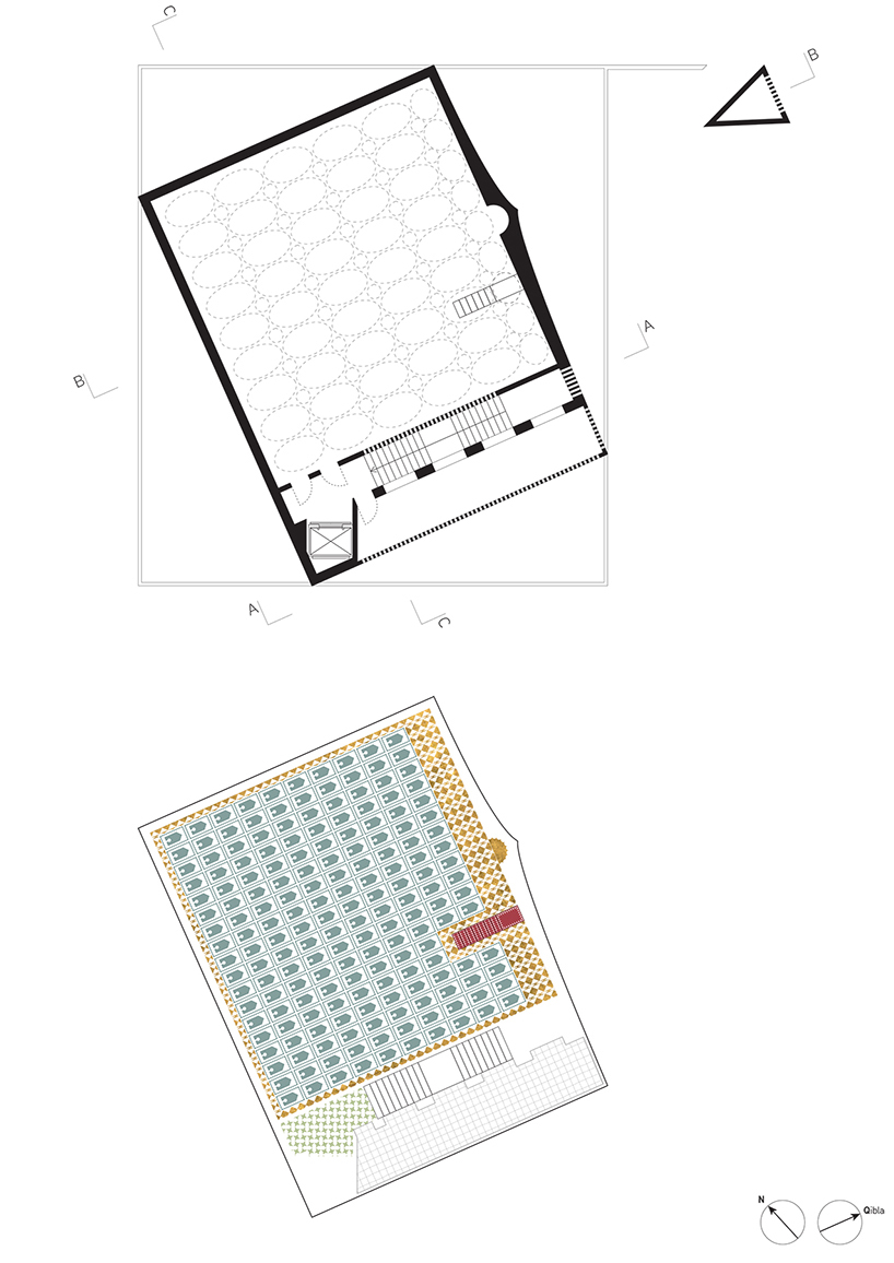 The ground floor is conceived starting from the typology of the mosque within the islamic architectural tradition. Two main spaces were relevant for our proposal: the Sahn and the Riwaq. The Sahn, is the large central courtyard usually able to provide for various civic uses. While the Riwaq is usually the arcade or portico open on one side that sorrounds the Sahn. Our Sahn is the auditorium: located as a room in the centre of the ground floor is an indoor courtyard surrounded by the only corridor that permit the access to all the other functions around and to the worship on the second floor in a ritual circular way. With its 100 sqm surface and its shape it’s able to be totally flexible and host several functions like a conference hall with the stage and the seating; a dining hall with tables; a place where gathering together and other temporary unexpected functions. In addition to the normal flexibility of a multi-purpose hall what is relevant is that this space could be extent of the 40% just opening all the door and using also the corridor, our Riwaq. Being oriented focus on the “qibla” and being connected to the worship through a private stair could be considered as an extension of the worship itself. It’s a space of relation where the ritual, the education, the culture and the meditation could found a place, thanks to its shape and its position.
