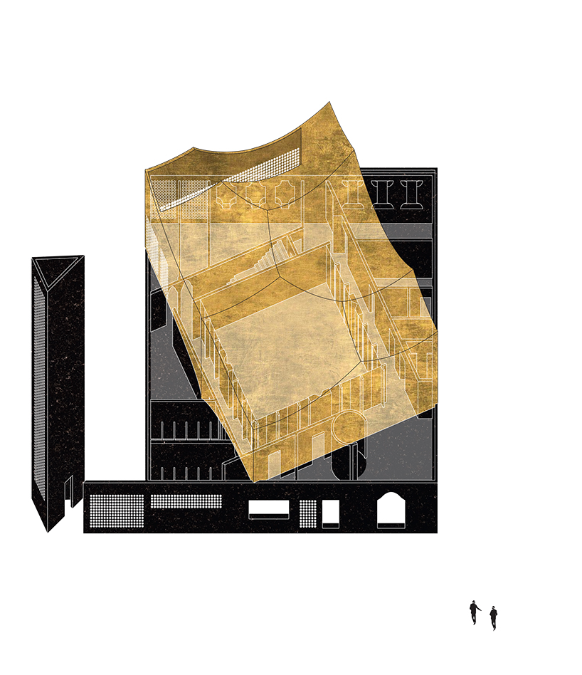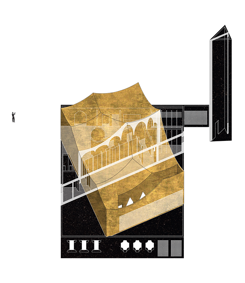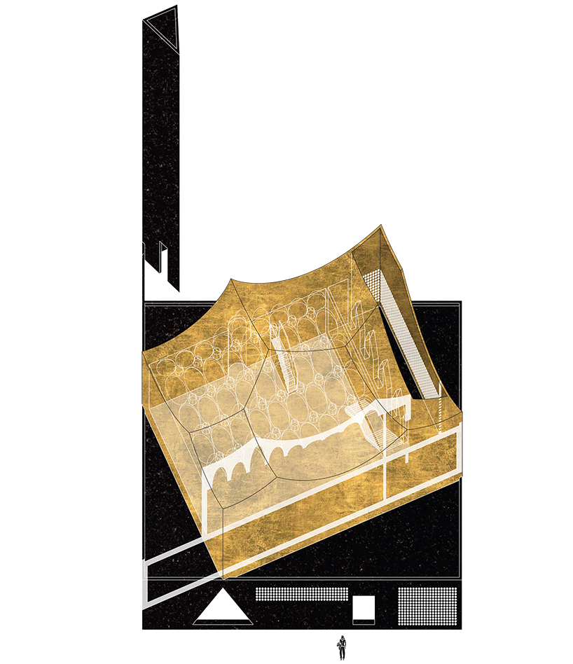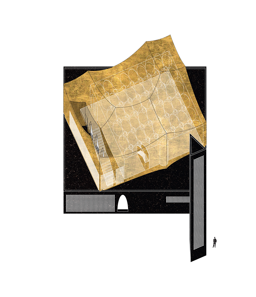 The project creates a place where the Islamic culture could be intertwined with the site-specificity of Reykjavik and of Icelandic architecture as the bigger frame. On one side the promotion, both in terms of collective prayers and cultural activities, but even to consider the building itself a medium of learning about the historical process of the mosque’s typologies considering the Islamic Architecture an important part of the deep culture of Islam. On the other side the volume itself is conceived to recall the Icelandic Landscape and it is composed of two main parts: a flat simple and solide volume that works as a solid mass and where the local Black Basalt is employed as cladding that hosts all the common areas and the research areas; on top of this the worship is a volume where the geometry of the facades is shaped with several vaults that remind to the picks of the vulcanuos landscape. The façades of the upper volume is a cladding of a an alloy of copper and aluminium that with the natural weathering gradually forms a striking warm golden surface with very unique characteristics able to reflect the surrounding to relate with it.