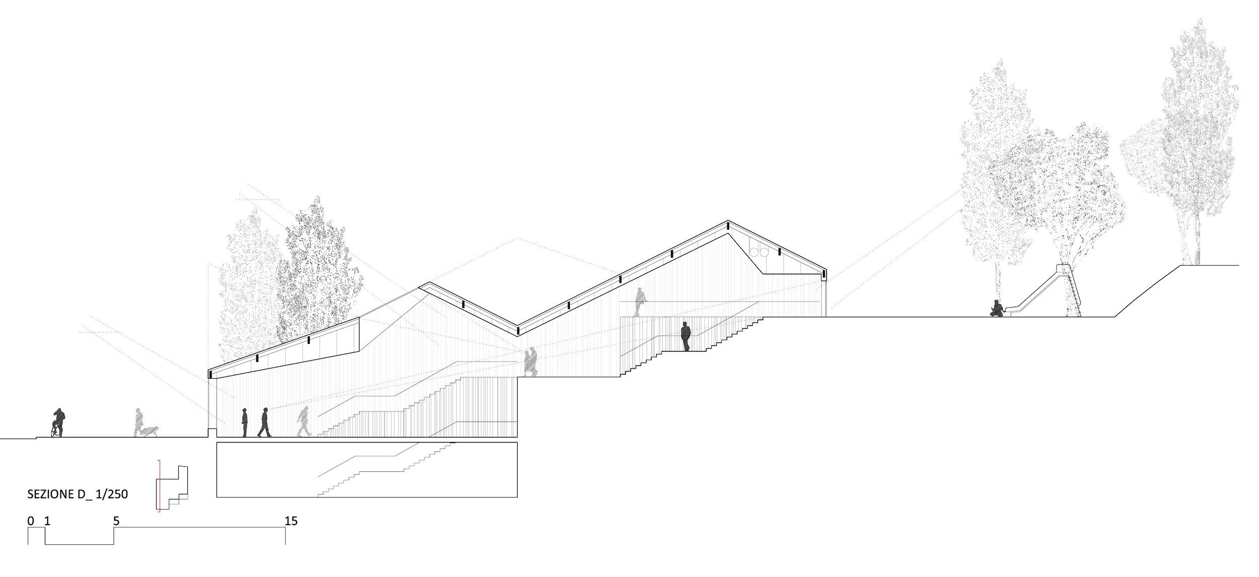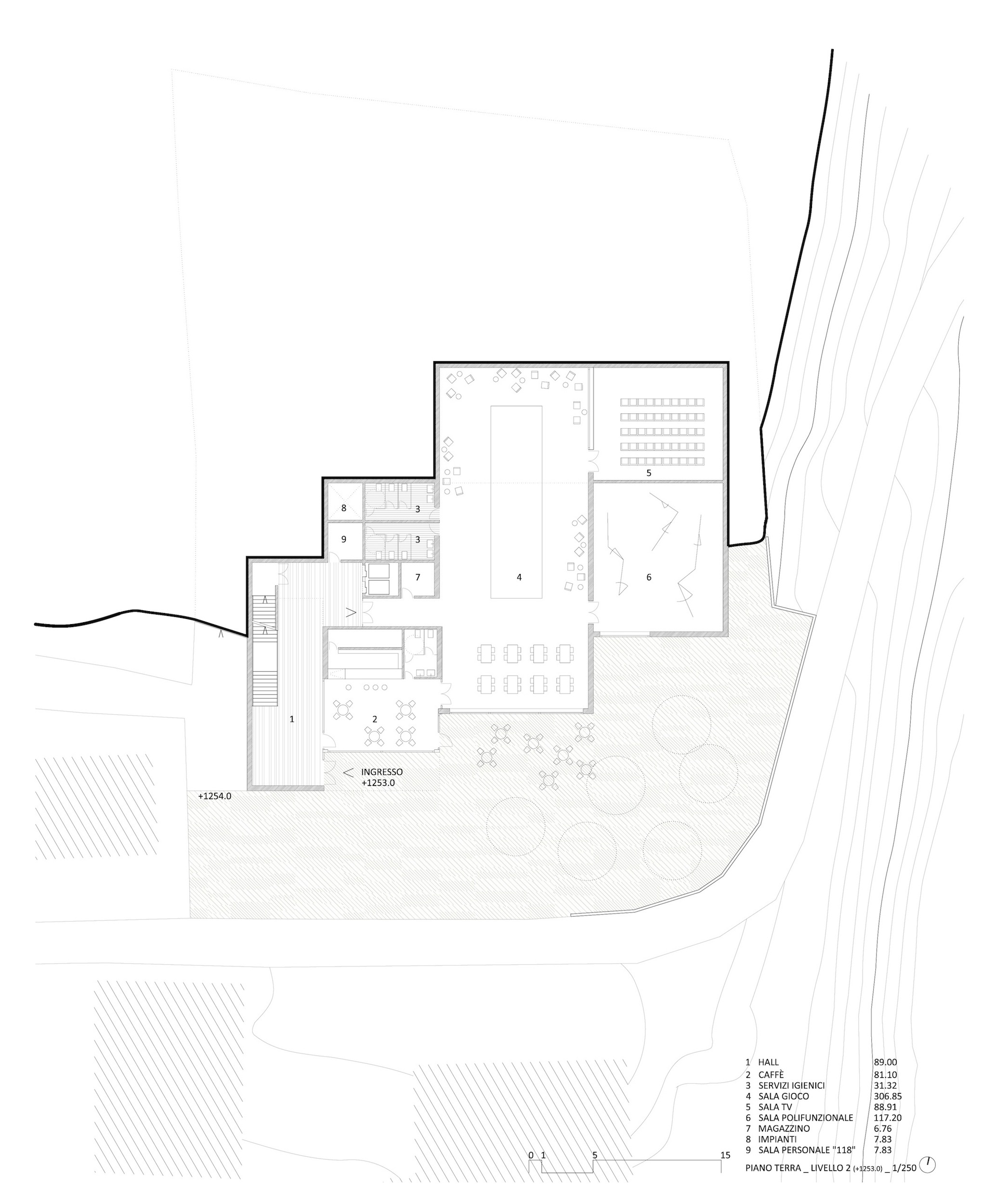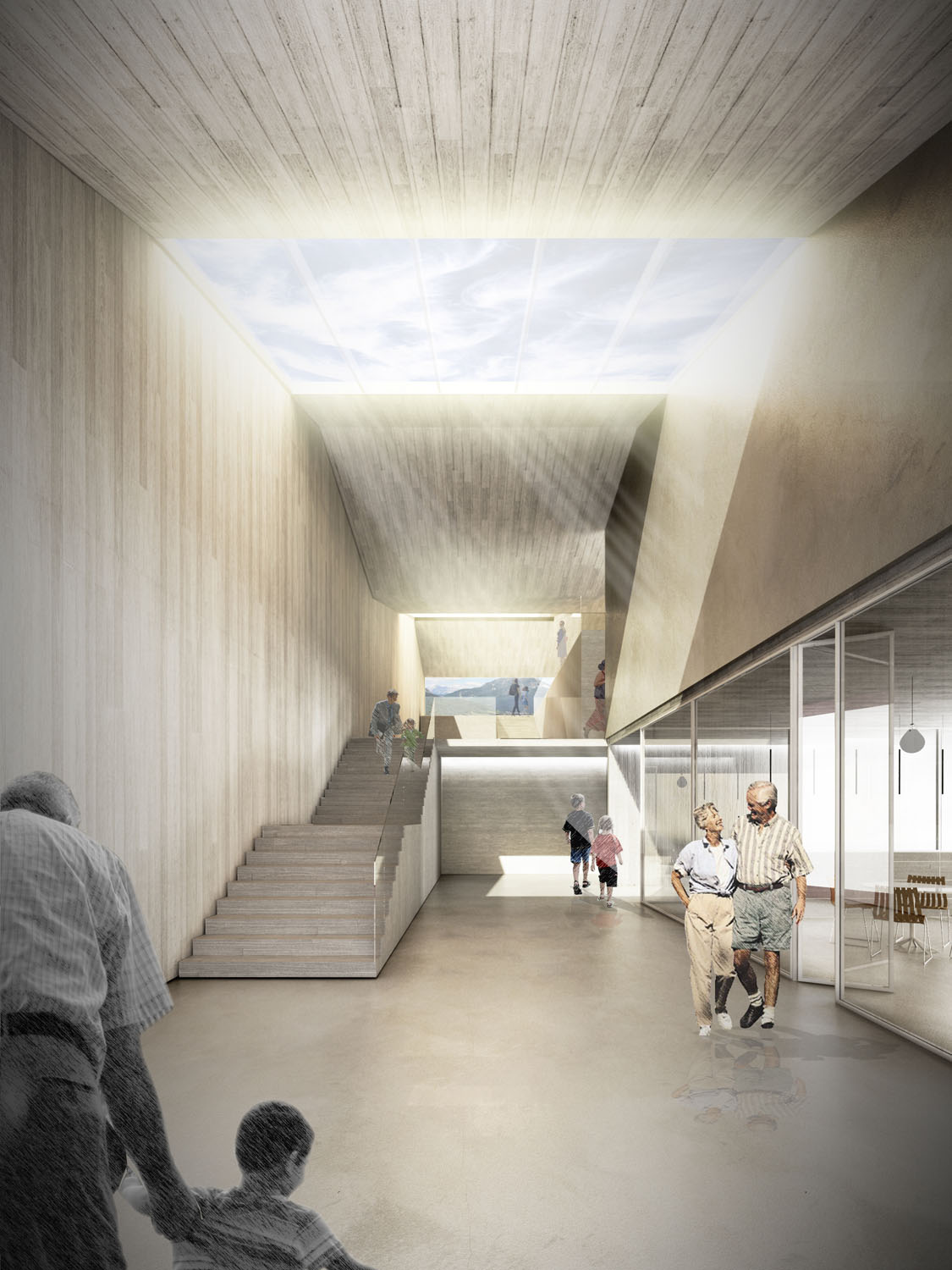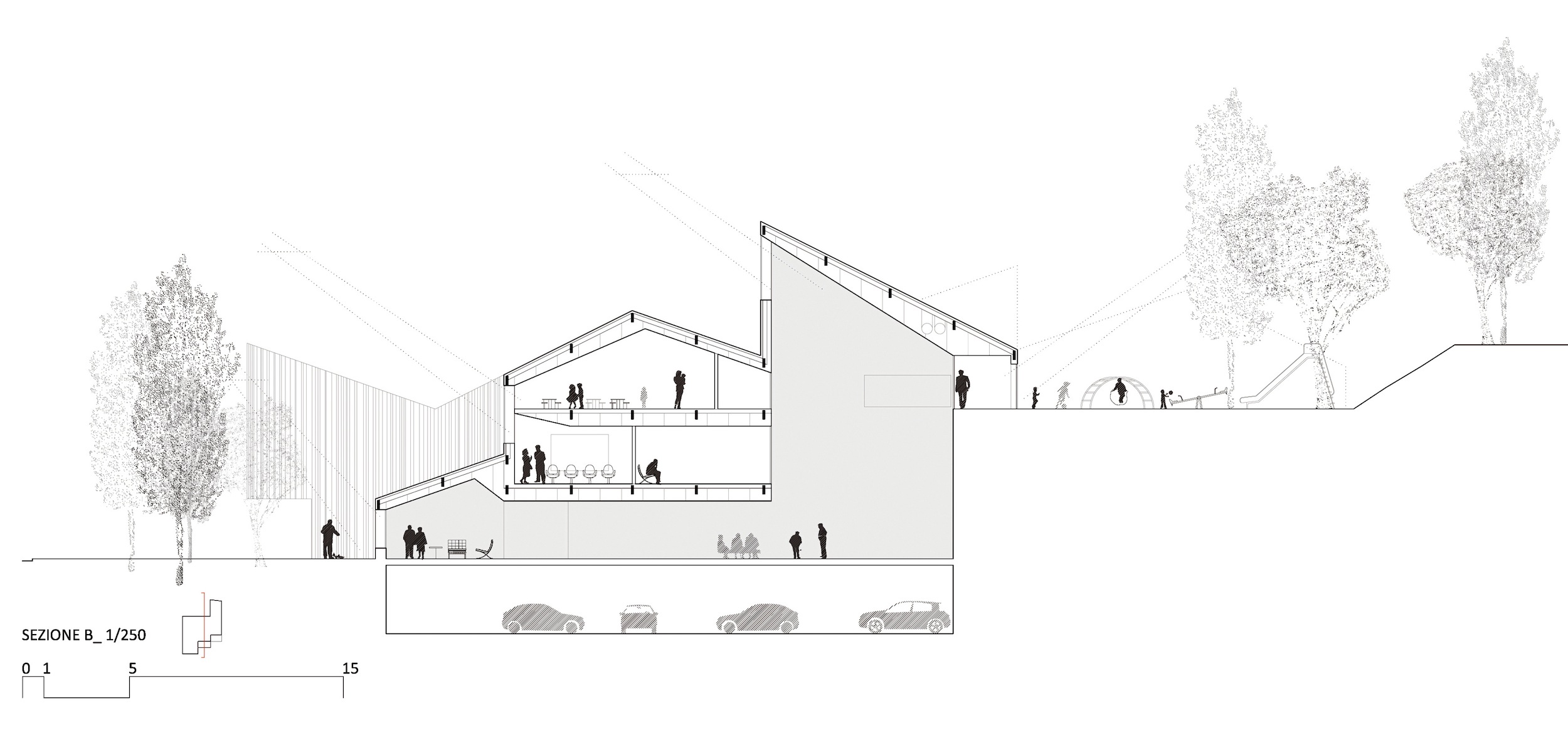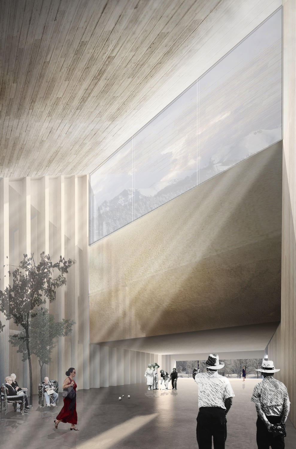 La mirada hacia el lugar se antoja necesaria aún más en este caso. Inmerso en un paisaje de alta montaña a los pies de los montes Dolomitas, Sappada es un asentamiento disperso, con una tipología edificatoria muy clara: edificios de cierta envergadura con cubierta a dos aguas, con zócalo pétreo sobre el que se construye en madera o enfoscado. La orografía de la parcela enseñaba pendientes pronunciadas, que desde el principio entendimos que tenían que ofrecer la solución, en lugar de ser un problema añadido. A la cierta dificultad del proceso se une un programa heterogéneo con unas premisas ciertamente claras respecto a su funcionamiento. Básicamente eran cuatros grandes paquetes funcionales: centro de día para mayores, residencia de estudiantes, escuela infantil, y aparcamiento. Uno de los puntos de partida fue unificar en un único hall escalonado el acceso a los distintos usos. Una espina dorsal funcional que conecta lateralmente en cada planta un uso diferente. Un espacio en cascada que ofrece miradas cruzadas hacia el imponente paisaje alpino.
