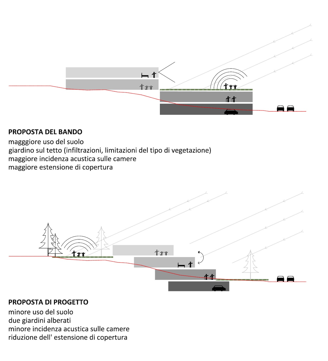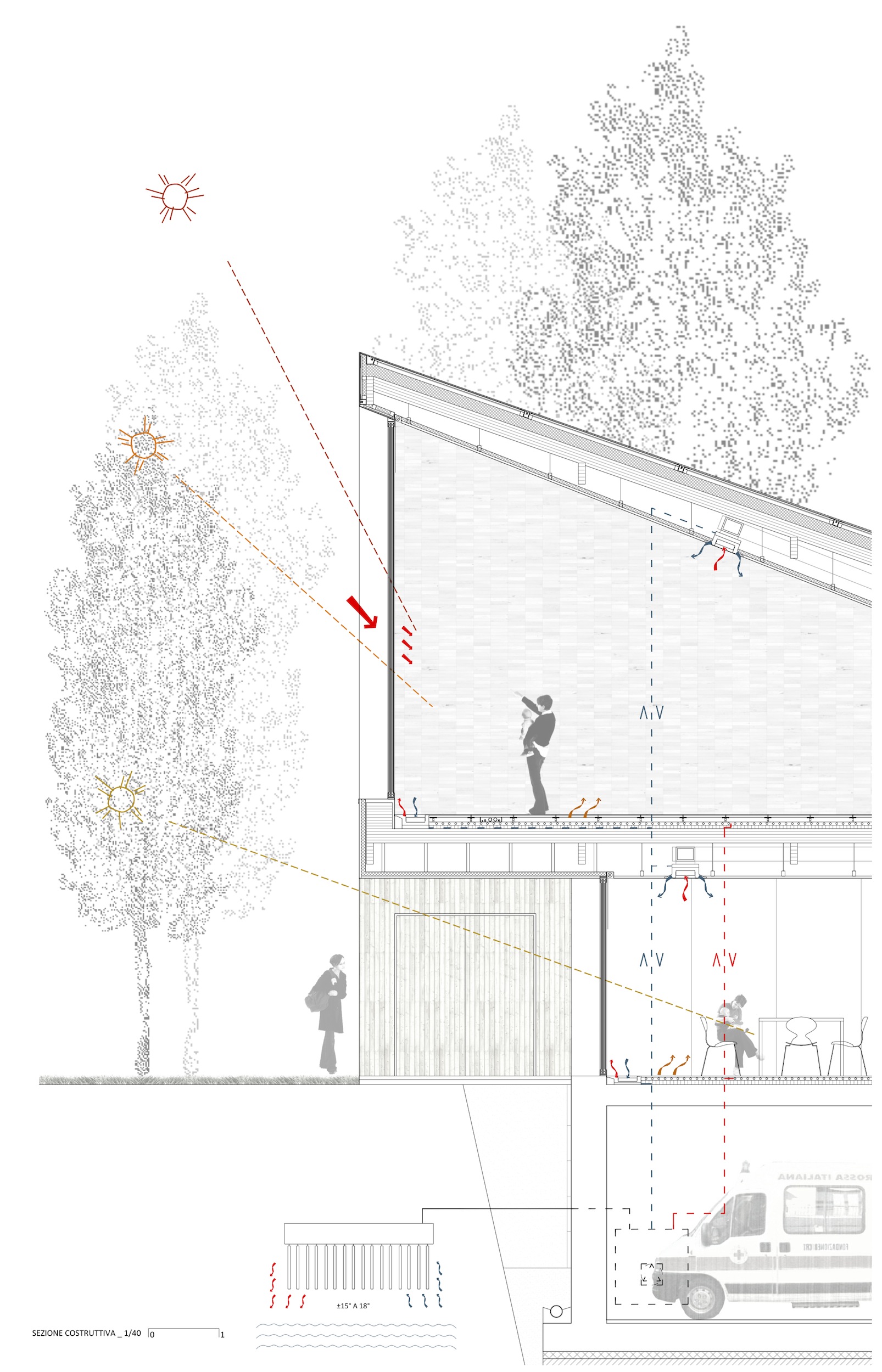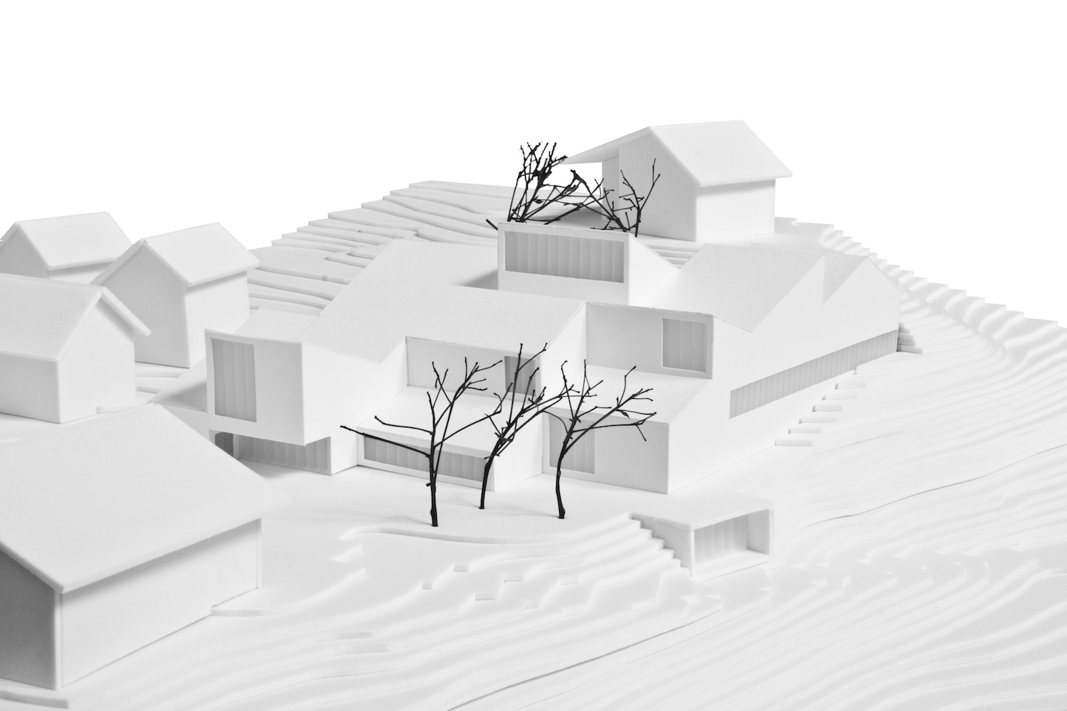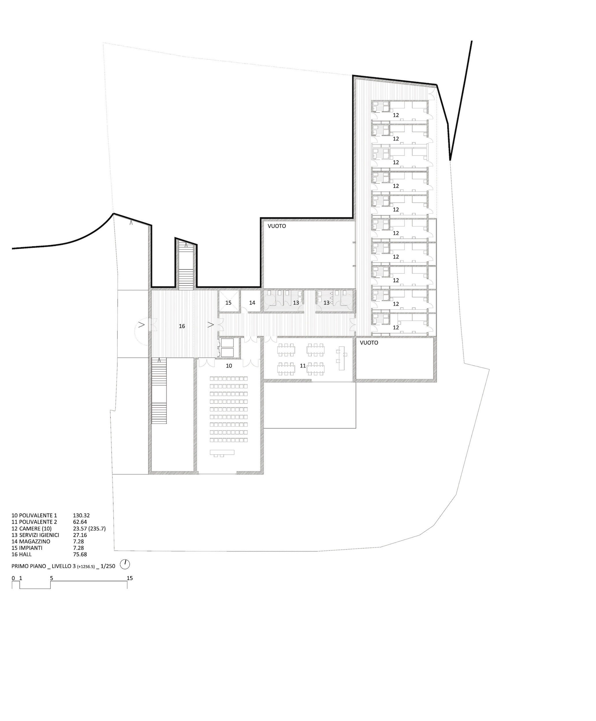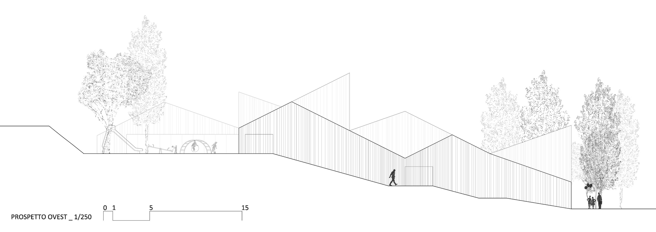 La mirada hacia el lugar se antoja necesaria aún más en este caso. Inmerso en un paisaje de alta montaña a los pies de los montes Dolomitas, Sappada es un asentamiento disperso, con una tipología edificatoria muy clara: edificios de cierta envergadura con cubierta a dos aguas, con zócalo pétreo sobre el que se construye en madera o enfoscado. La orografía de la parcela enseñaba pendientes pronunciadas, que desde el principio entendimos que tenían que ofrecer la solución, en lugar de ser un problema añadido. A la cierta dificultad del proceso se une un programa heterogéneo con unas premisas ciertamente claras respecto a su funcionamiento. Básicamente eran cuatros grandes paquetes funcionales: centro de día para mayores, residencia de estudiantes, escuela infantil, y aparcamiento. Uno de los puntos de partida fue unificar en un único hall escalonado el acceso a los distintos usos. Una espina dorsal funcional que conecta lateralmente en cada planta un uso diferente. Un espacio en cascada que ofrece miradas cruzadas hacia el imponente paisaje alpino.