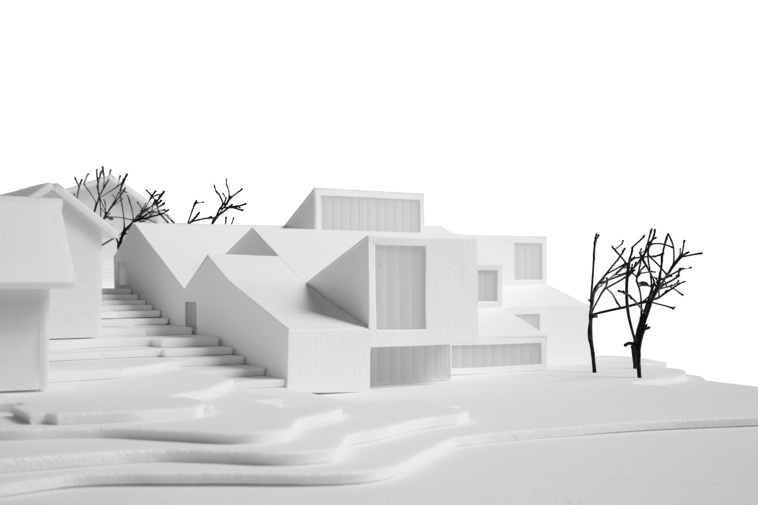 El programa y la pendiente de la parcela convergían en la resolución de la implantación, ya que dichas diferencias altimétricas permitían escalonar los tres programas diferentes, con accesos peatonales directos independientes cada uno de ellos, aparte del acceso principal común. Del mismo modo, el escalonamiento en el terreno resolvía la necesidad de generar dos amplios espacios libres sensiblemente planos: uno delante para terraza y juegos estivales de adultos, y otro detrás, donde el edificio reducía su escala, como patio de juegos infantil. El escalonamiento del programa no se iba a resolver aterrazando, ya que la arquitectura del lugar llamaba la atención respecto a la forma de terminación de la edificación: inclinación en cubiertas, de sentido común en zonas nevosas.