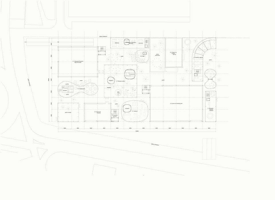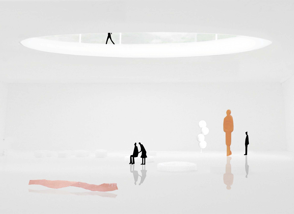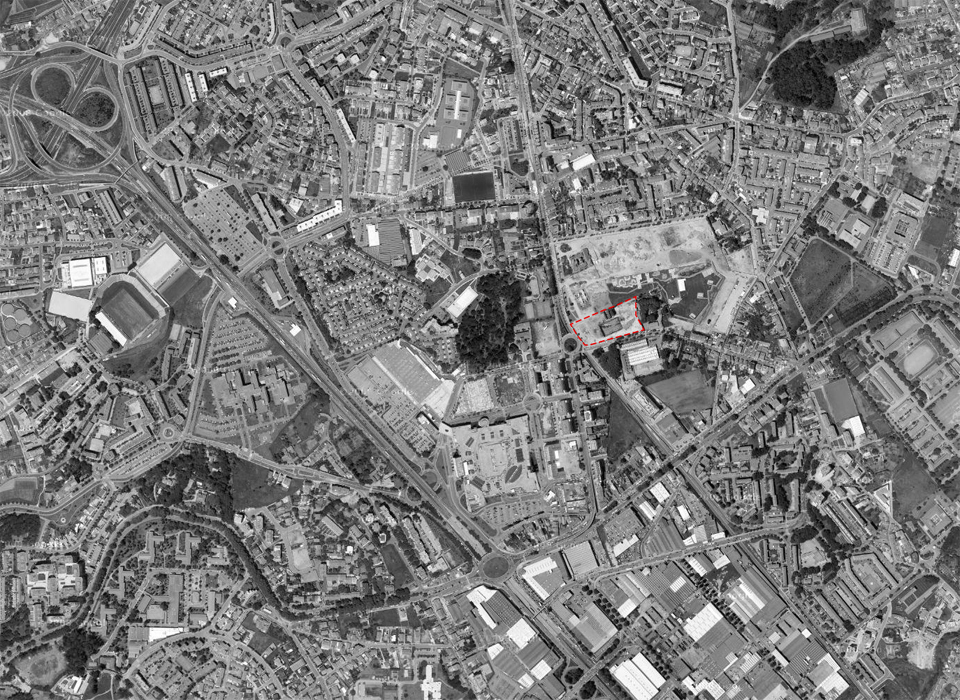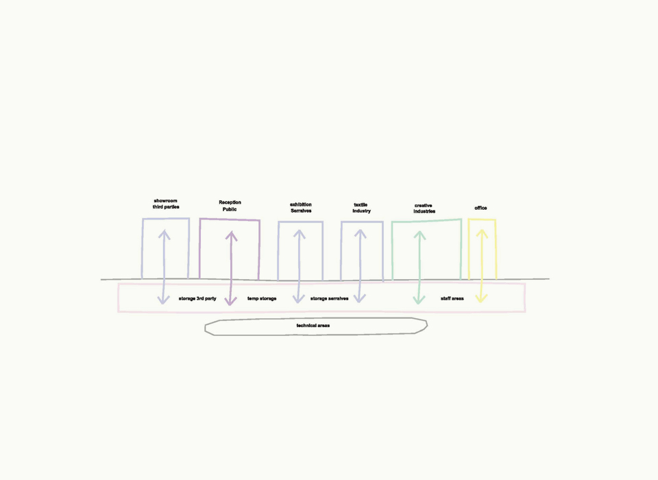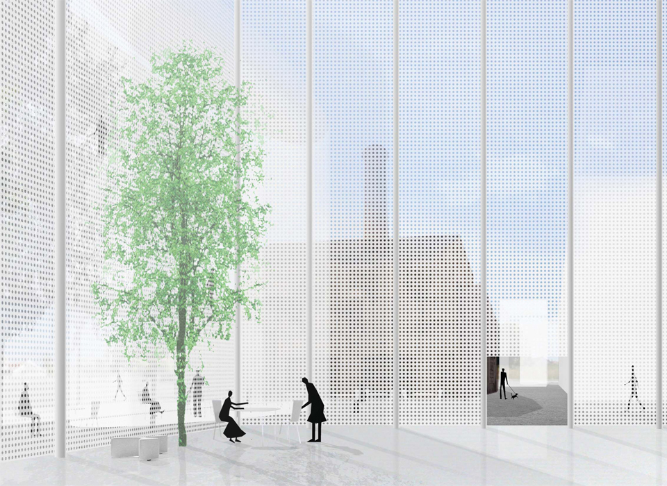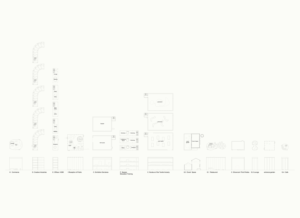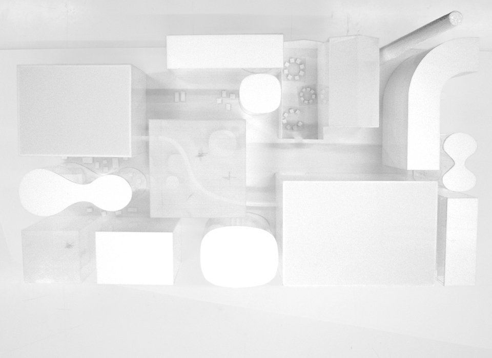 It is composed of a conglomeration of program blocks arranged with urban density around the existing building. This density allows the proposal to act as a focal point in a suburban environment of scattered housing. The program itself allows the multifunction building to relate to the city on several levels and the design seeks to make this explicit. It is not primarily a cultural institution but rather an environment where art, business and everyday life are able to come together, establishing an energy that will reverberate throughout an area which is already experiencing change. The textile industry building is fully embedded in the proposal and establishes the scale of the blocks that surround it. The space is not kept apart as a museum piece but rather integrated, so as to allow it to become a vibrant centre through its relationship to the programs around it.