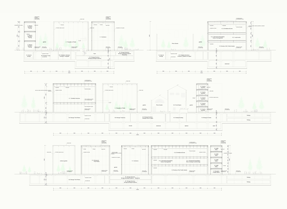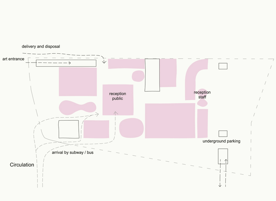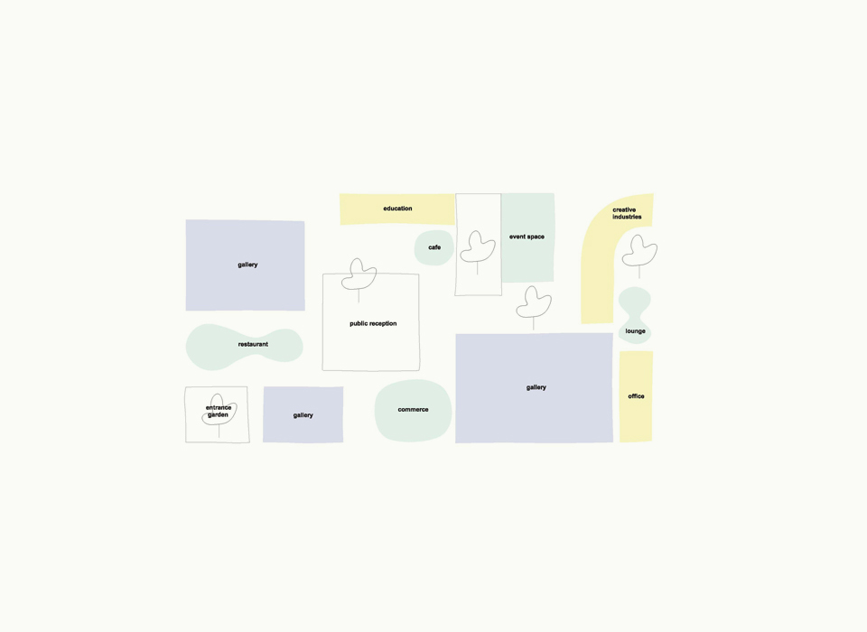 The program invites a new building typology, an institution evading typical classification and as a result a typical architecture. The interwoven activities that compose the multifunction building provide the opportunity for a new level of interactivity between the core functions and offshoots of an art institution. There is a democracy of space inherent in the proposal, each function has its own volume and each a shared outdoor area. Public space acts as a social glue between functions and the outdoor spaces provide commerce-free, unprogrammed environments that are usually absent or restricted in art institutions. Given that the brief is unique in its desire to open storage to the users of the institution we propose a full first basement of storage, a functional space that acts as an alternative glue welding the diverse functions together.