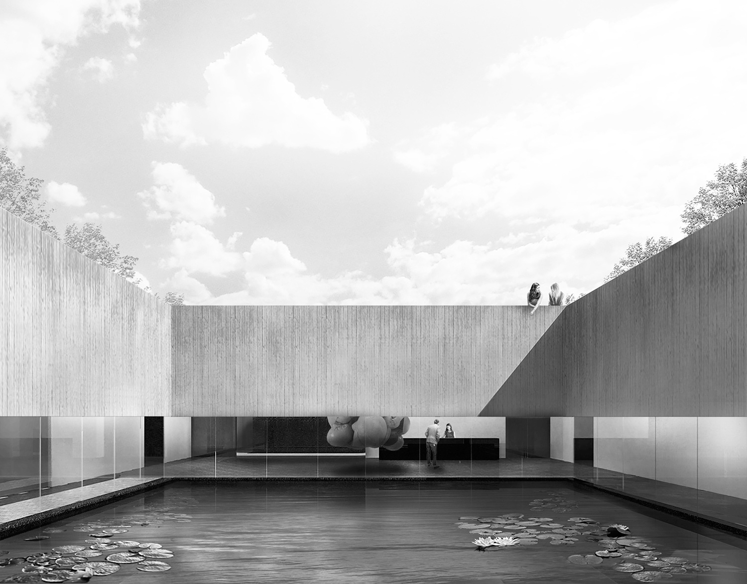 Esta rampa que rodea al volumen hermético y misterioso es el único acceso que conduce al museo. La película de agua que recorre los muros cumple la doble función de protegerlos de rayados vandálicos y acompañar al visitante en un preámbulo procesional como preparación al recorrido de la muestra. El fluir del agua conduce hasta el hall de acceso, desde donde se puede ver dónde desemboca el agua. En este punto el programa se divide en dos partes: la muestra y la zona administrativa.
