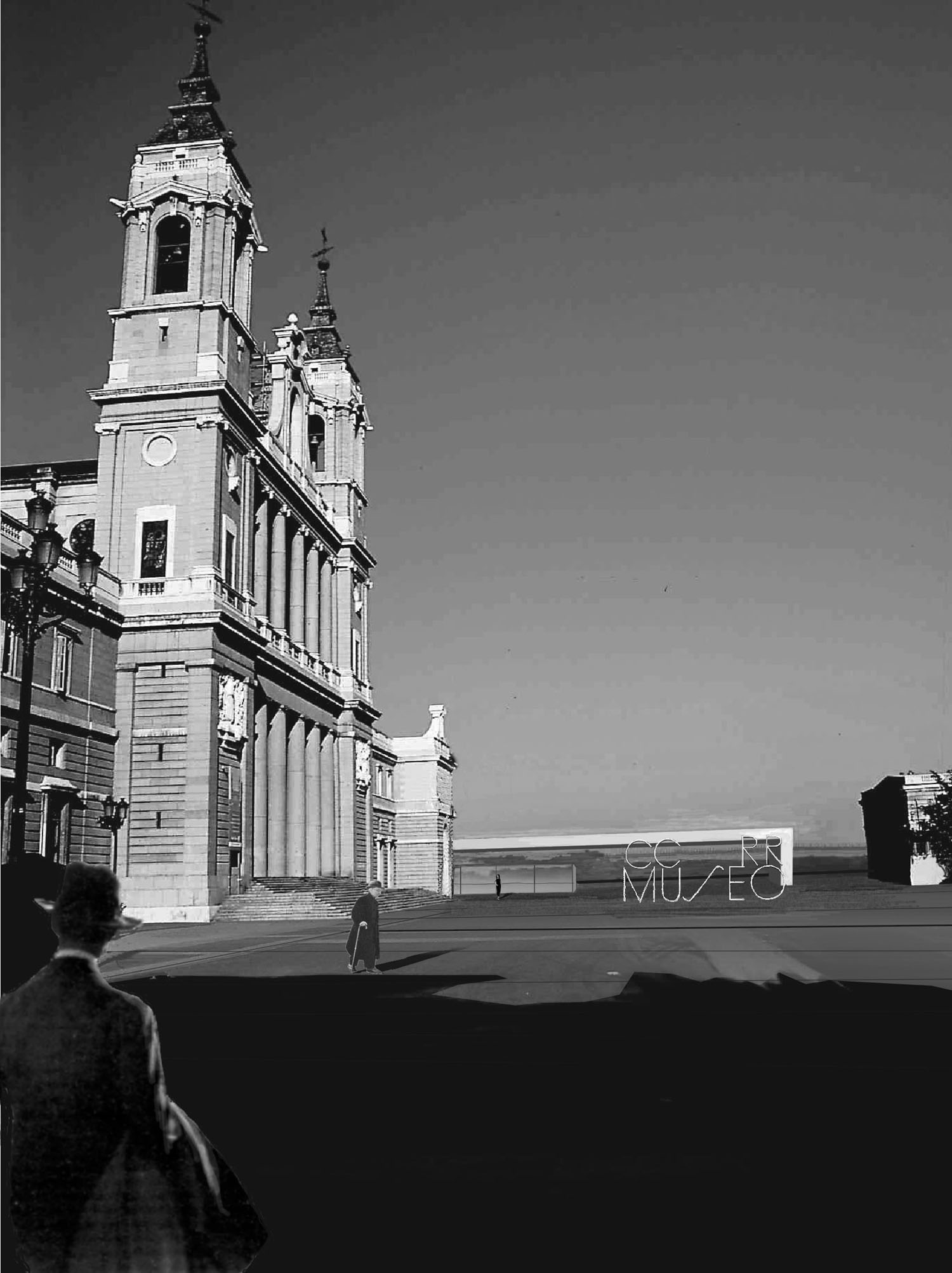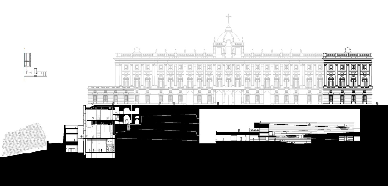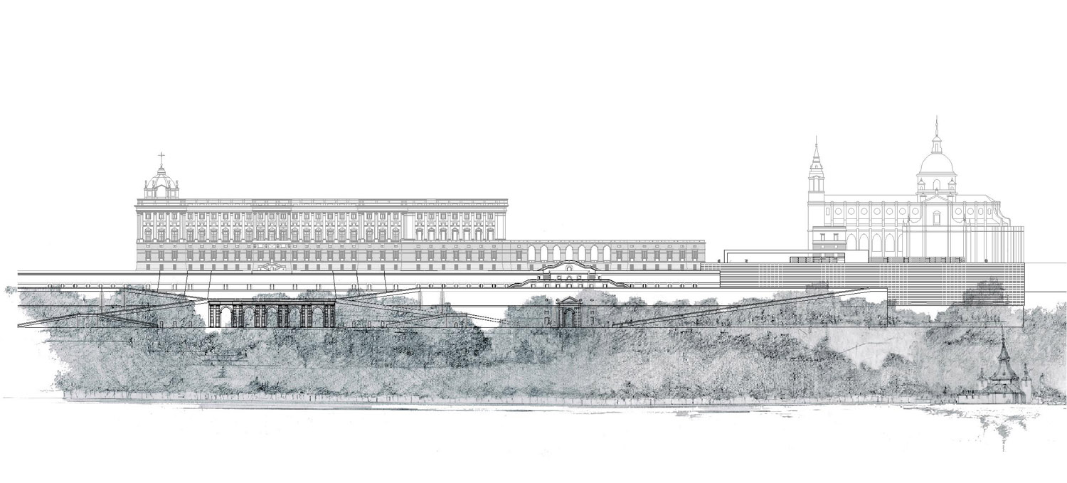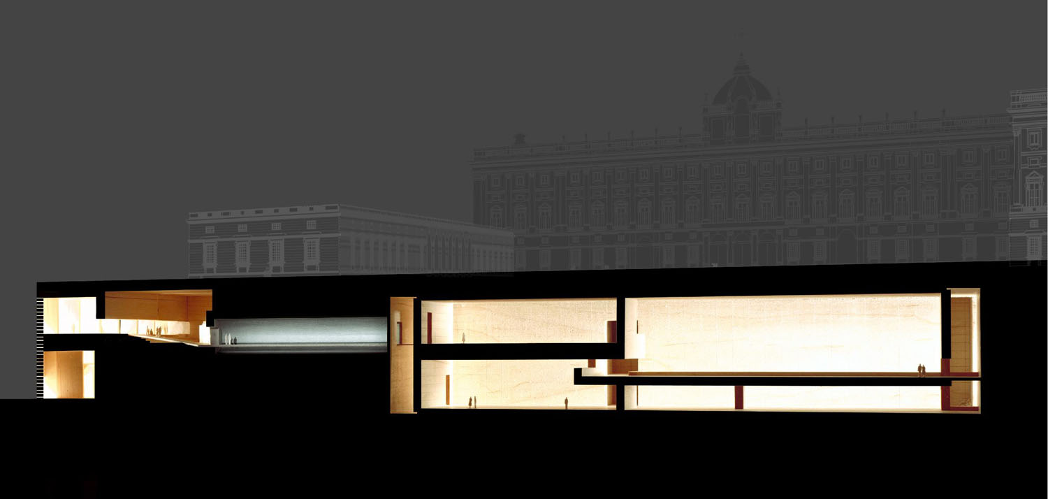 Se actúa sobre una plataforma tensa, entre el Palacio Real y la Catedral de la Almudena, que abre magníficas vistas hacia el río y a la Casa de Campo. Y alberga en su interior las trazas del núcleo que originó la ciudad y que el tiempo ha consolidado como mirador estratégico. En él, Palacio y Almudena se interrelacionan estableciendo una poderosa composición, en la que se introduce una pieza de carácter intemporal, acceso al nuevo museo, que deja ver, y es pórtico de sosegada presencia para acogida y mirador. El gran muro de contención basamental de la composición, se convierte en fachada del edificio, lo cual representa una enorme responsabilidad ya que queda afectada la fisonomía de la panorámica urbana. Nuestra propuesta potencia ese carácter de basamento. Por ello, debe percibirse desde la lejanía con un carácter pétreo, masivo. El lugar seguirá siendo el soporte sobre el que se elevan, dominando la composición por escala y singularidad, el Palacio Real y la Catedral de la Almudena.