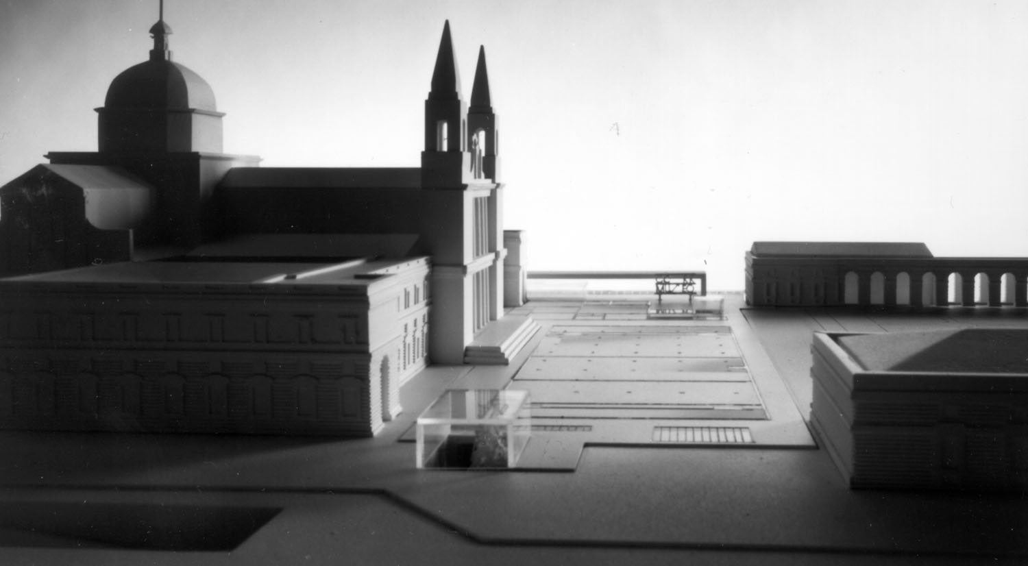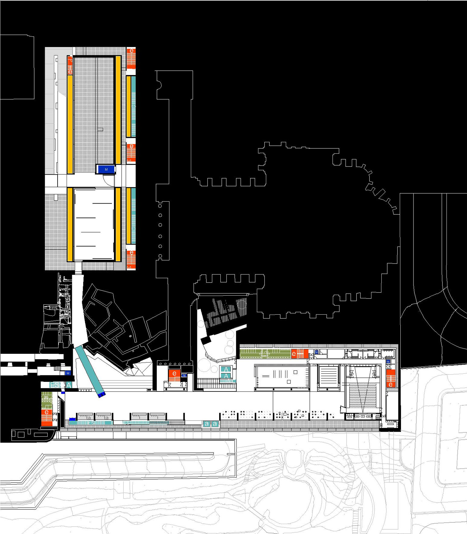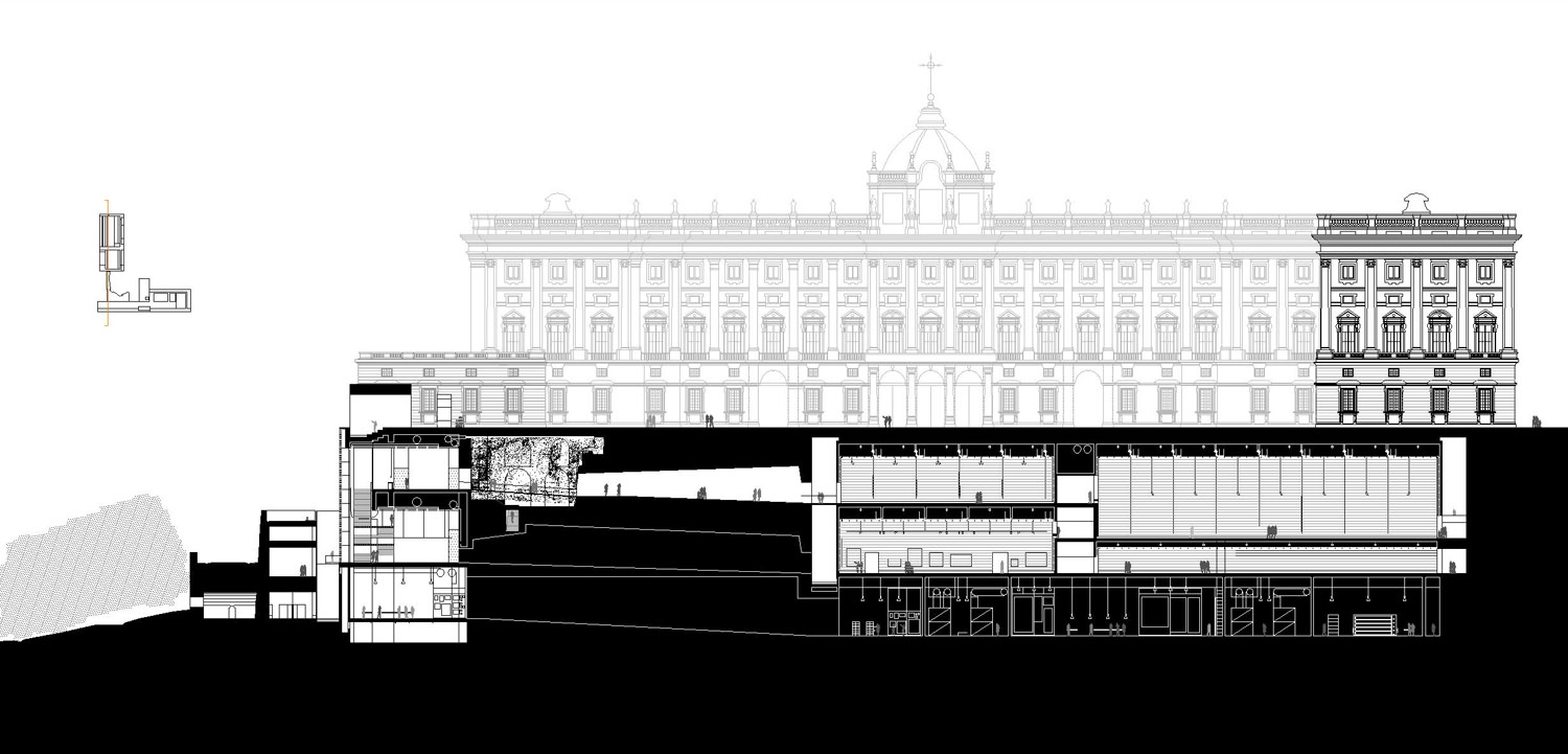 Se actúa sobre una plataforma tensa, entre el Palacio Real y la Catedral de la Almudena, que abre magníficas vistas hacia el río y a la Casa de Campo. Y alberga en su interior las trazas del núcleo que originó la ciudad y que el tiempo ha consolidado como mirador estratégico. En él, Palacio y Almudena se interrelacionan estableciendo una poderosa composición, en la que se introduce una pieza de carácter intemporal, acceso al nuevo museo, que deja ver, y es pórtico de sosegada presencia para acogida y mirador. El gran muro de contención basamental de la composición, se convierte en fachada del edificio, lo cual representa una enorme responsabilidad ya que queda afectada la fisonomía de la panorámica urbana. Nuestra propuesta potencia ese carácter de basamento. Por ello, debe percibirse desde la lejanía con un carácter pétreo, masivo. El lugar seguirá siendo el soporte sobre el que se elevan, dominando la composición por escala y singularidad, el Palacio Real y la Catedral de la Almudena.