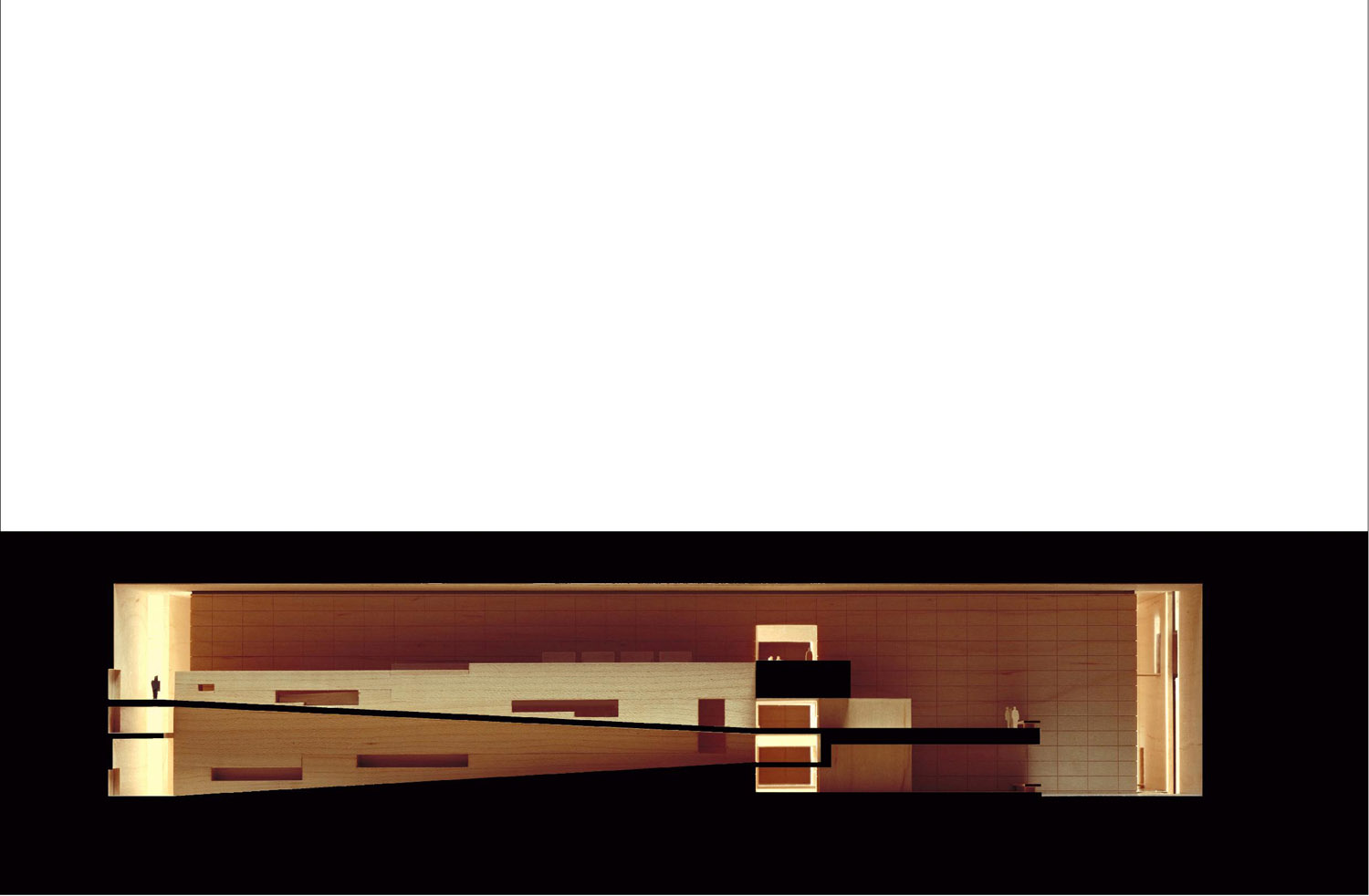 Las salas se van sucediendo mediante un recorrido lineal de desniveles espaciales a medias alturas relacionados por rampas que se incorporan al espacio expositivo. Se consigue así que la altura adquiera un fuerte protagonismo, jugando con los espacios comprimidos y los espacios abiertos. Para idear este conjunto fue decisivo el mundo de sugerencias que nos abrió la visita a las fascinantes y desconocidas rampas interiores de bajada desde el Palacio al Campo del Moro, obra de Sachetti. La potencia y brutalismo del cofre en su aspecto exterior contrasta con la delicadeza interior. El contenedor de hormigón frente al estuche de madera. Madera en color ébano, fondo neutro en el que flotan descontextualizadas las piezas expuestas. El equipamiento escénico con el que están dotadas las salas permite una gran flexibilidad en cuanto a tamaños y disposiciones de las piezas a exponer.