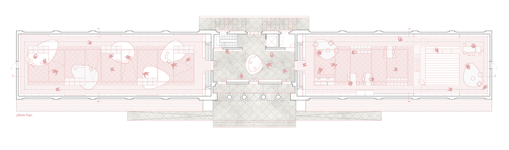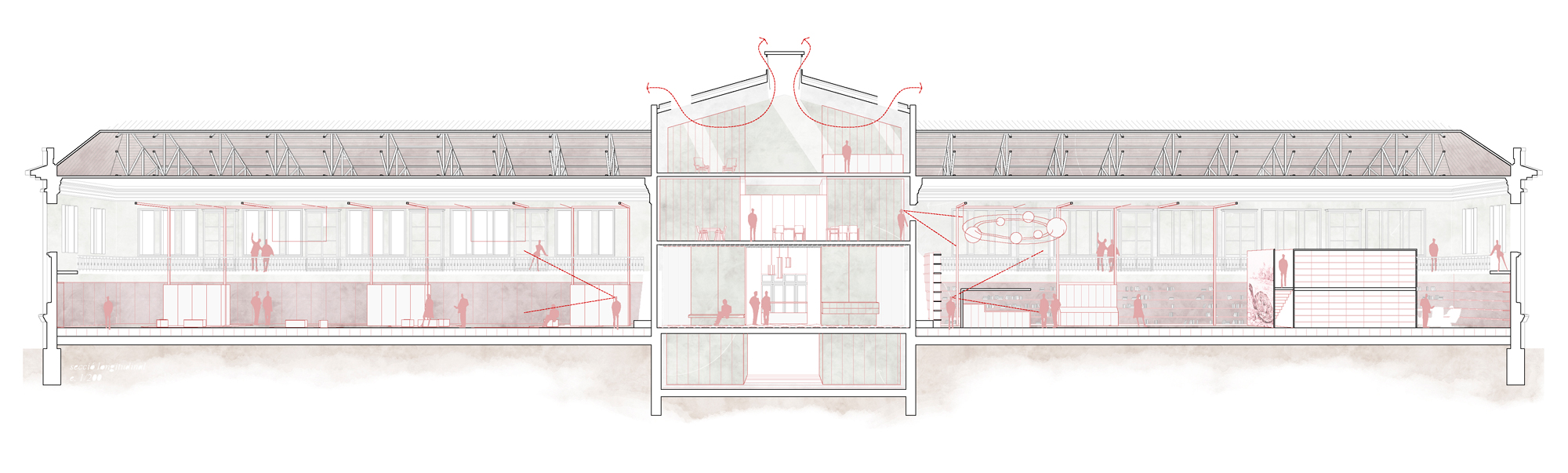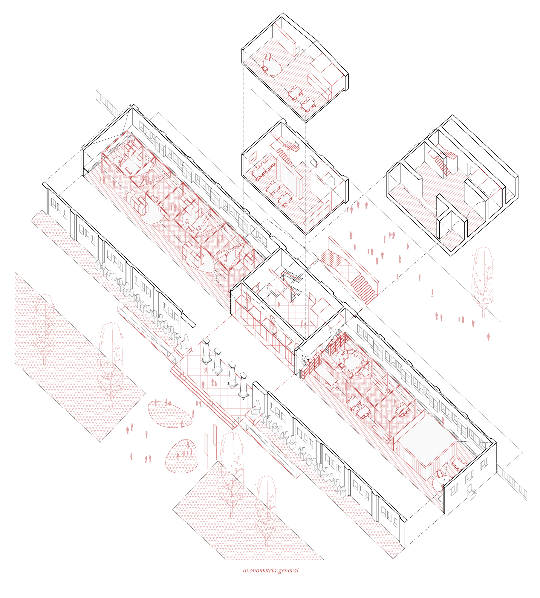 Una secuencia de módulos con diferentes usos se albergaran dentro de las grandes salas, pautados siempre por la trama, serán de carácter reversible y ayudaran a organizar las dos salas con conocimiento o escenas de un mismo relato museográfico. El cuerpo central seguirá siendo el nodo principal desde donde se dará acceso a los distintos espacios del museo y, a la vez, permitirá la visibilidad transversal parque-ciudad.