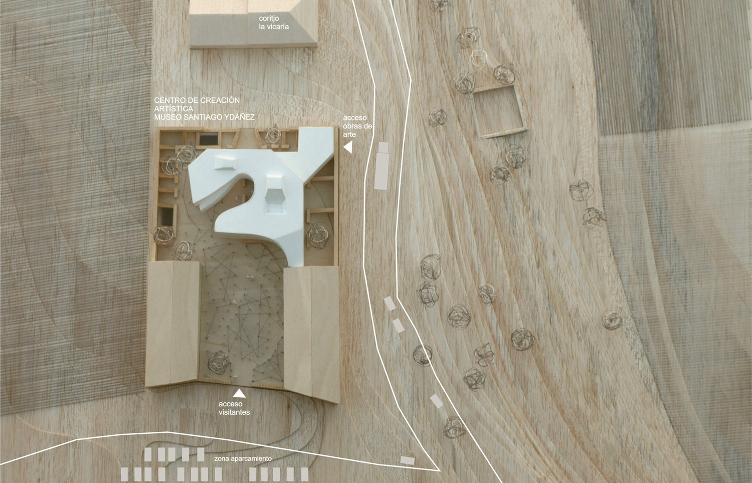 Las ruinas de una antigua fábrica abandonada y próxima al núcleo urbano de Puente de Génave es el escenario elegido para la intervención. El espacio industrial de la Vicaría es un recinto cerrado, delimitado por dos pabellones con restos de maquinaria, un cercado de piedra y silos dispuestos perimetralmente. La intención es recuperar un patrimonio industrial hoy en desuso para centro de divulgación del arte contemporáneo que contenga la sede del Museo Santiago Ydáñez, vinculando este nuevo espacio cultural a la memoria y a la historia del lugar. La propuesta del Centro de Creación Artística se organiza a partir de las relaciones con las antiguas edificaciones y las ruinas existentes. El reciclaje de estos elementos del pasado y su convivencia con la nueva arquitectura nos parece una solución apropiada para un centro divulgativo de arte, tratándose además de un contexto cultural como el nuestro, caracterizado por la continuidad histórica de los acontecimientos. La integración de las preexistencias del pasado en el proyecto del futuro espacio dedicado al arte nos parece además una solución sostenible, económica y adecuada a los tiempos que corren, realizada con mínima energía y en convivencia con nuestro legado patrimonial.