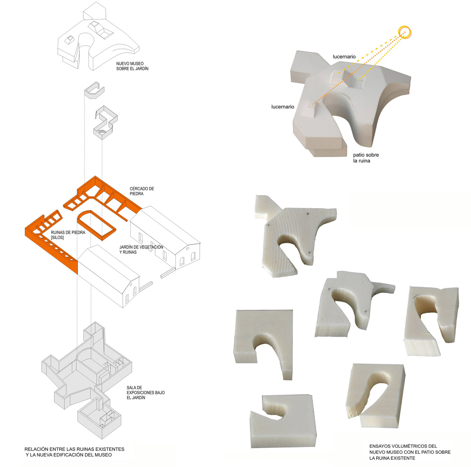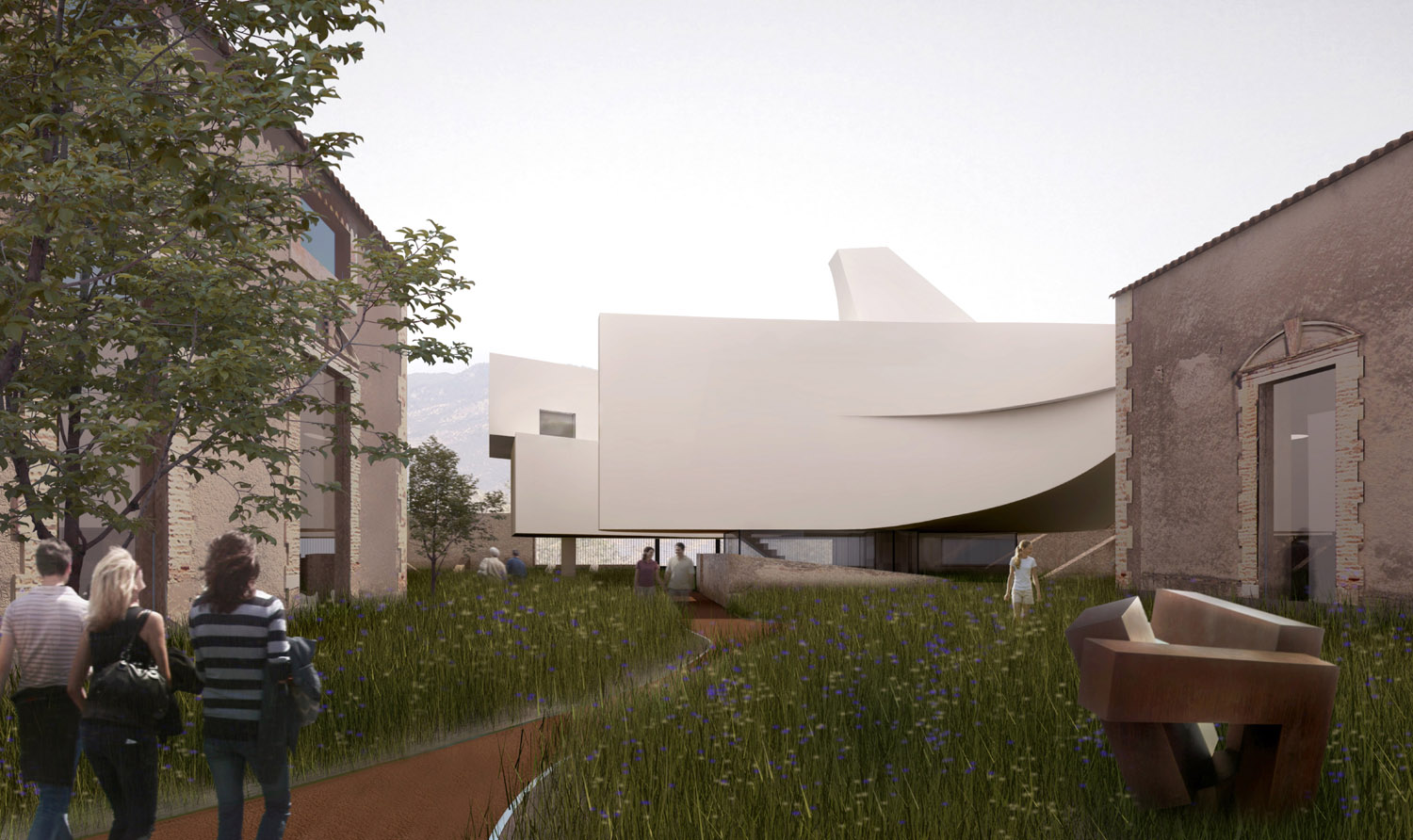 La propuesta comienza con la creación de un jardín entre las ruinas, un espacio de vegetación y arbolado autóctono que cambia con la estación del año. Este jardín de arte se convierte en el atrio de recepción para el visitante y acoge actividades de diferente tipo. Puede ser un jardín de escultura, un taller de actividades al aire libre, un espacio para proyecciones nocturnas de audiovisuales, un cine de verano en época estival o sencillamente un lugar de encuentro para la población. La vegetación del jardín se dejará crecer hasta una altura de 70cm y será como una alfombra de color extendida a todo el recinto sobre la que se recortará un camino de tierra mejorada que conducirá al visitante hasta los diferentes pabellones del Museo.
