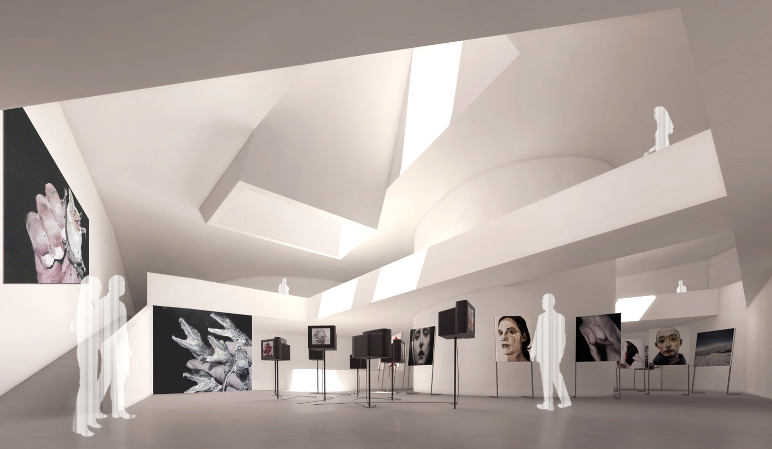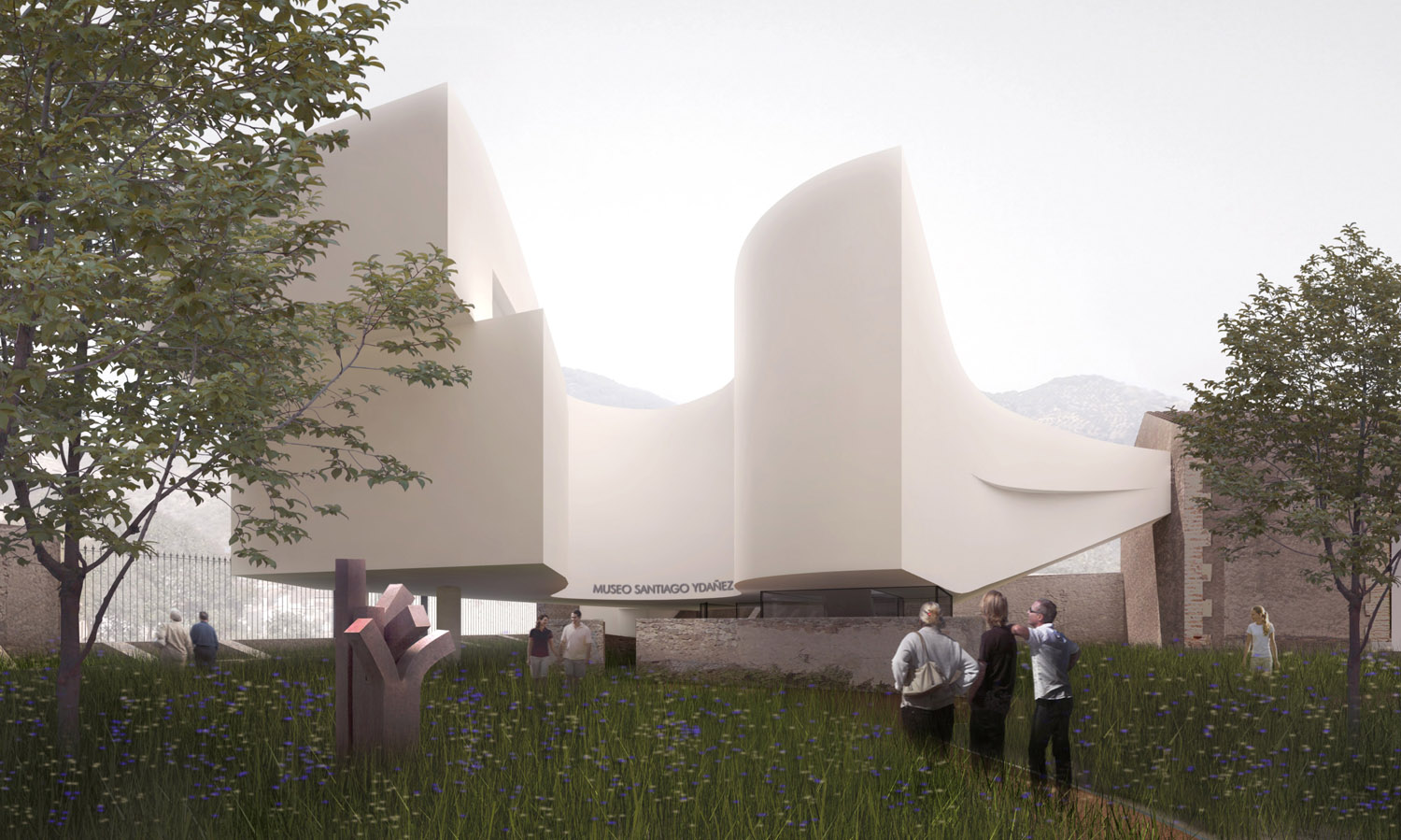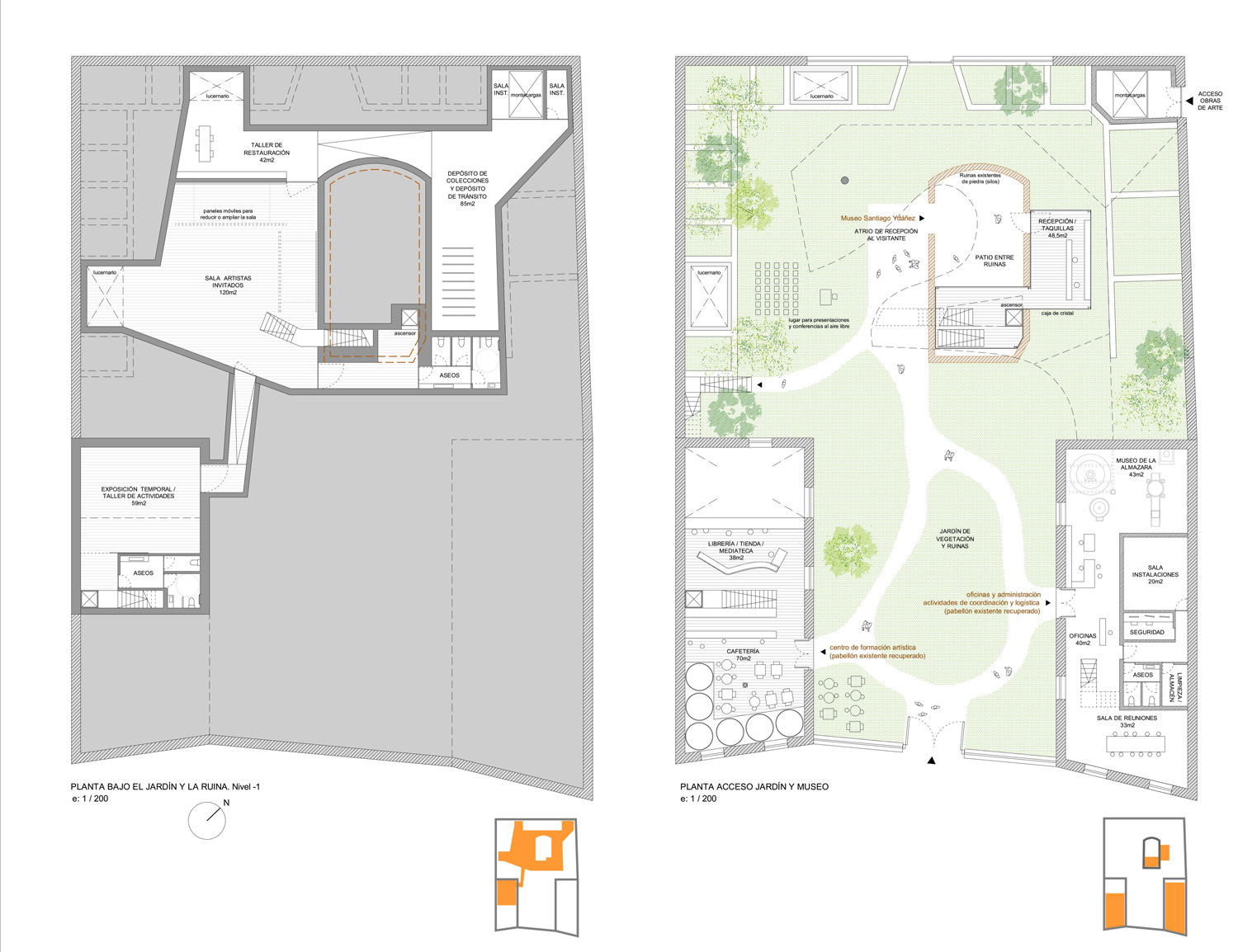 Las tres edificaciones pueden independizarse o permanecer conectadas entre sí sin necesidad de salir al exterior. De esta manera los espacios expositivos del Museo se prolongan al interior del pabellón administrativo a través de una galería sobre el jardín y mediante un pasadizo soterrado hasta el pabellón destinado a Centro de formación artística. En el interior se disponen ventanas estratégicamente situadas desde las que divisar el paisaje y una terraza mirador para salir a disfrutar de las vistas lejanas a la montaña. El ingreso de los visitantes se realiza desde el jardín y el de las obras de arte a través de una calle exterior paralela al muro. Un montacargas situado en la esquina del recinto conduce las obras hasta el depósito de colecciones o directamente a las salas para su exhibición. La nueva edificación destinada a Museo es un cuerpo suspendido sobre el jardín y las ruinas, abierto al sur mediante un patio curvo. Este singular espacio se reserva para que el artista Santiago Ydáñez trate con sus propias manos las fachadas curvas de acceso al Museo.