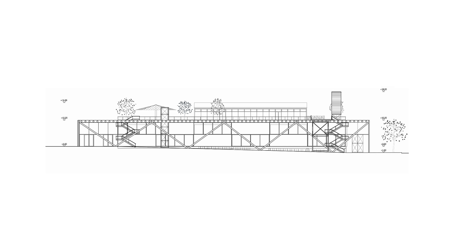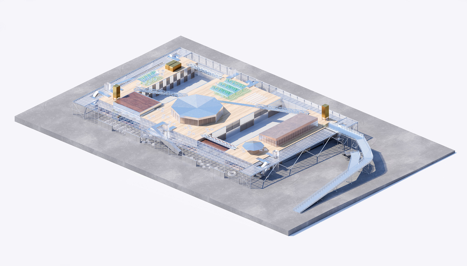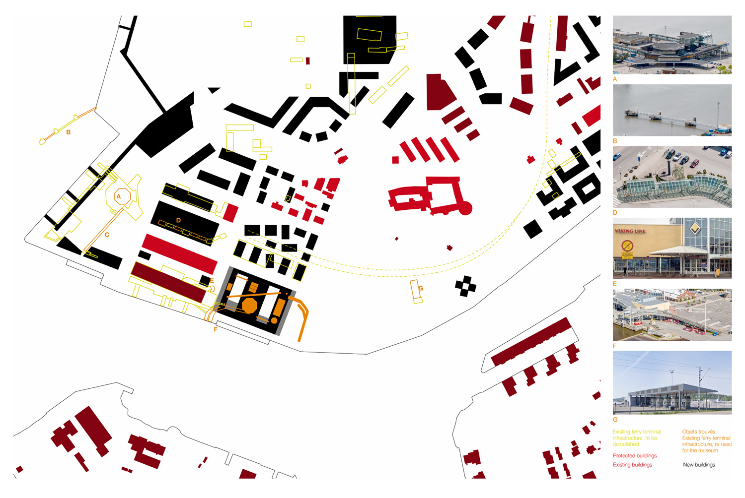 International competition for the new Museum of History and Future at the Seashore in Turku, Finland. The design draws architectural, structural, organizational, and material references from the past, present, and future use of the port. Elements like shipyards, warehouses, cargo-handling infrastructure, and terminal buildings for passengers and vehicles influence the building’s design, ensuring a connection with its role as a museum of history and future. The project repurposes existing port infrastructure, turning necessity into an opportunity for sustainability: bridges, ramps, containers, and entire pavilions, as well as structural and façade elements from the existing buildings, are integrated into the new design as objets trouvés from the harbor, symbolizing both the past and future through their reuse.