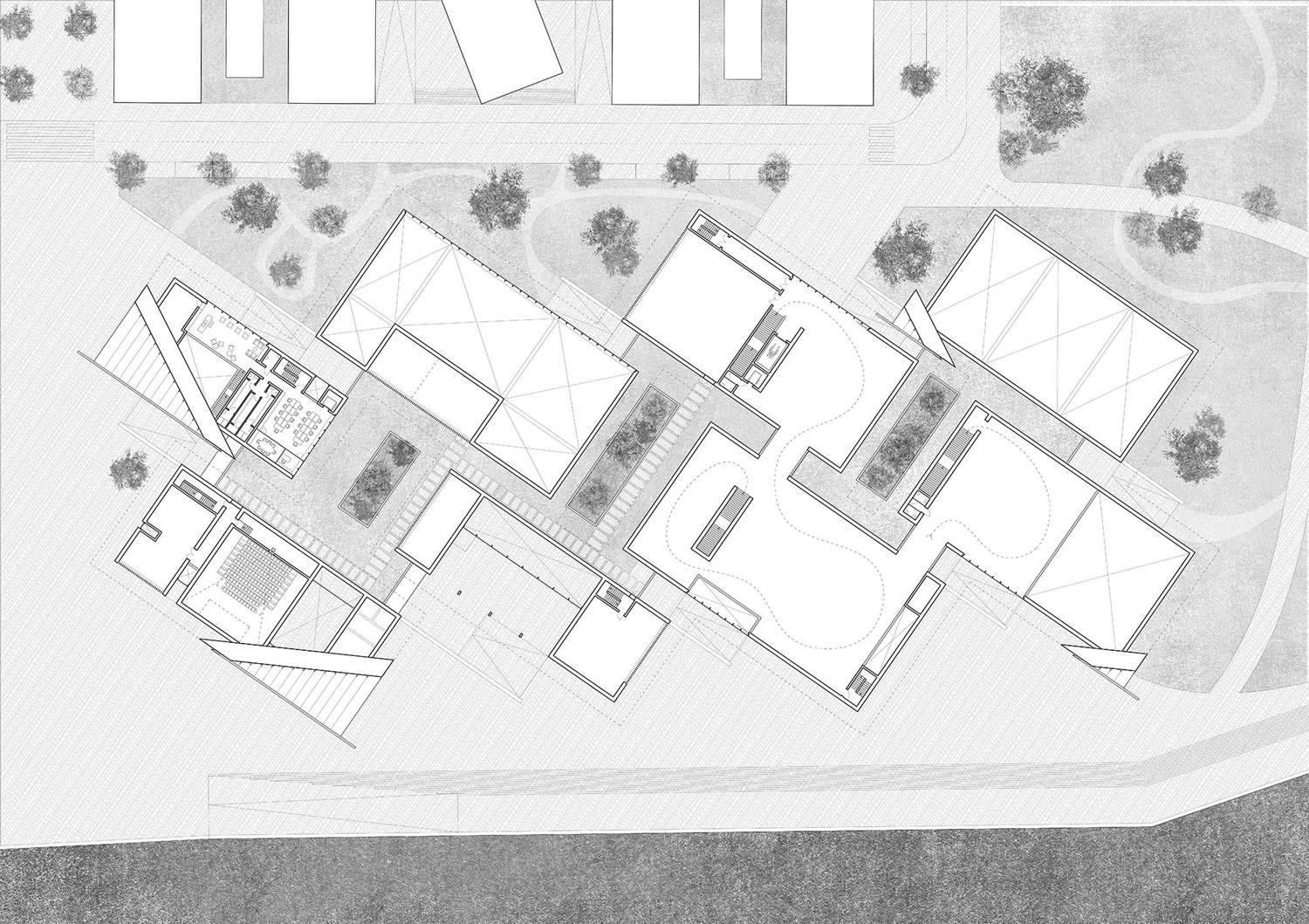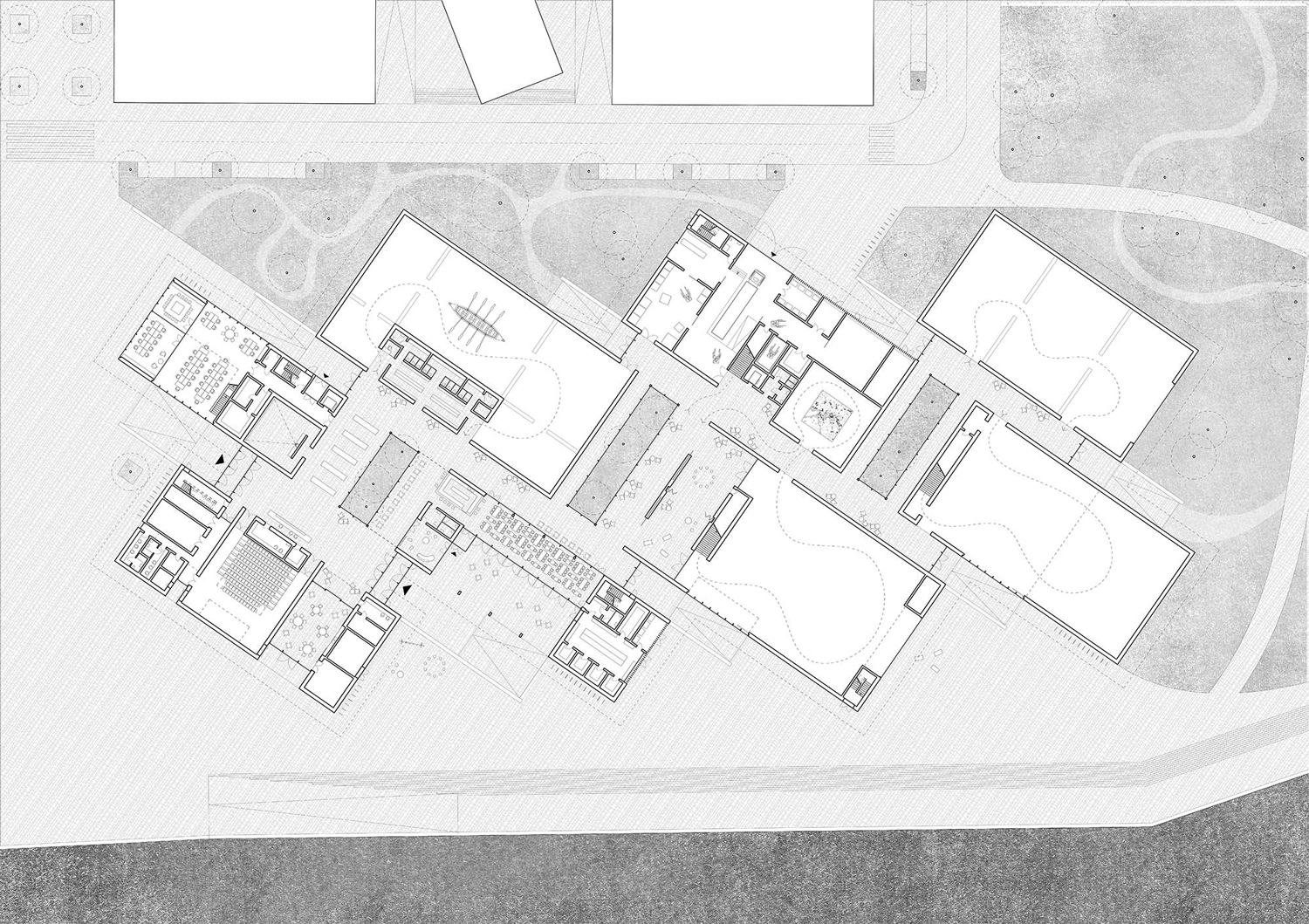 Conceived as an extension of Turku’s city fabric, the building consists of a series of modular timber pavilions arranged around multiple courtyards. This particular design facilitates future horizontal expansion or reconfiguration while prioritising access to daylight and the outdoors. The roof overhangs serve as an artful interpretation of a traditional Finnish architectural detail while shielding the structure and the visitors from harsh weather conditions.