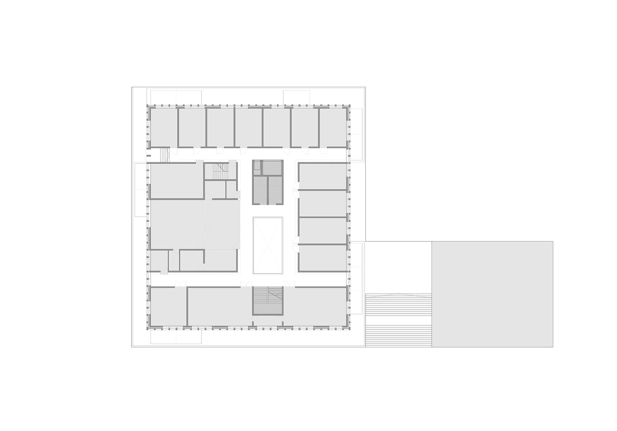 The volume scheme of the project answers in a simple way to the heterogenic building system around the square, different in scale and shape, and forms a dialogue, but without adding more dissonant elements. The building interacts with the climbing gymnasium, creating a balanced single system similar to a tower with a low body. Access to the building is guaranteed from the gallery; its public vocation converts it into a fundamental axis for the functioning of the building but also for the complex urban relations of the environment. The marked horizontality of the gallery articulates itself with the three level height of the school, increasing the perception of the inner space and giving a controlled illumination. The waiting area and the inside paths are laid around this void, in order that the inside space acts as an extension of the public space, holding some activities such as studying, meeting or socializing.
