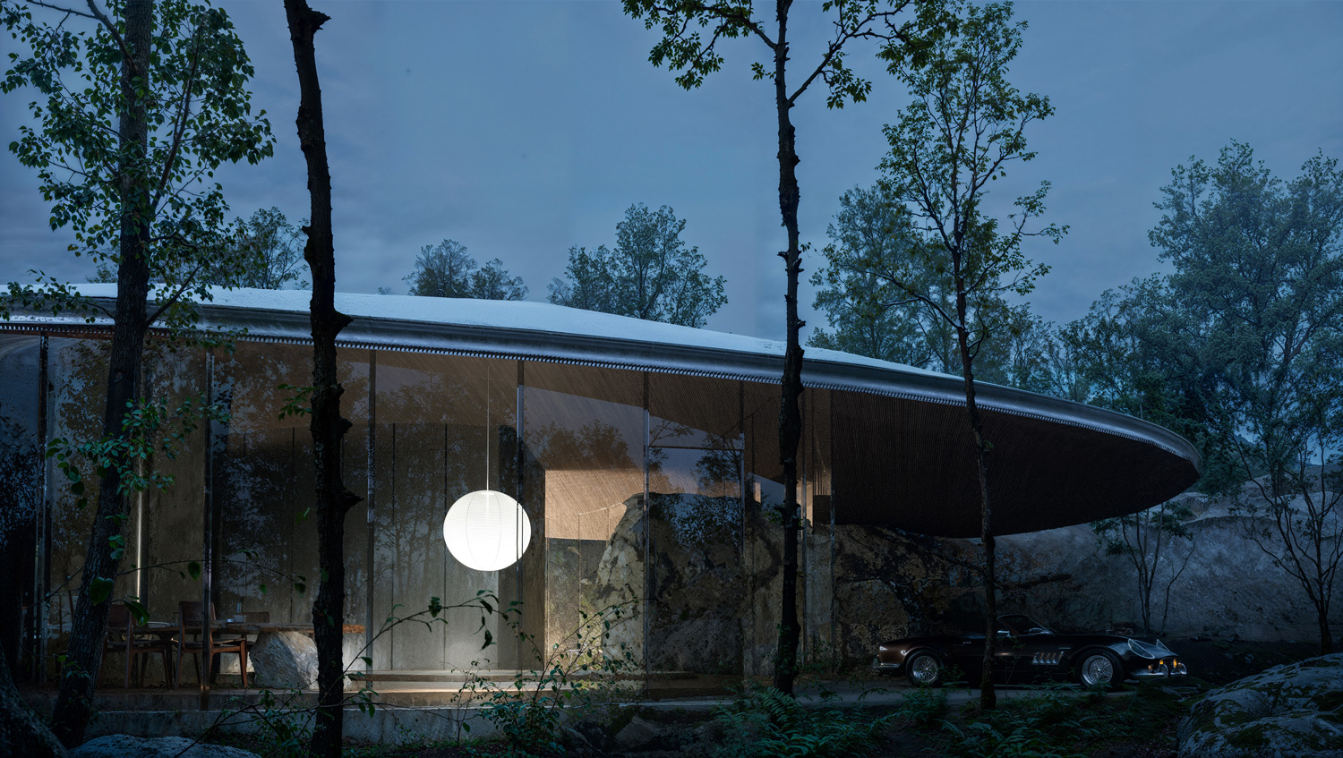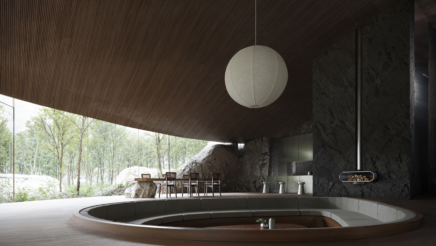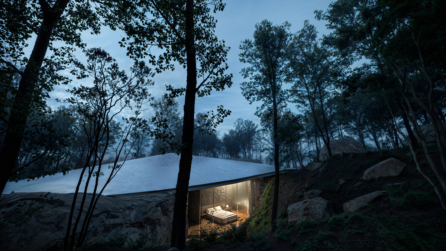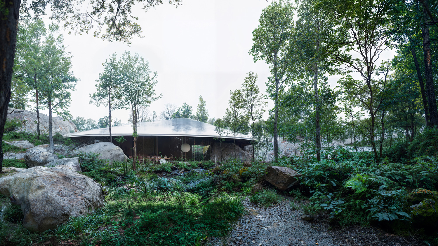 The project embraces a site rich in natural rock formations, integrating these stones as key structural and spatial components rather than treating them as obstacles. The house is embedded into the earth, following the natural slope and contour of the landscape, creating a harmonious relationship with its surroundings. By retaining the rocks in their original positions, they serve dual roles as load-bearing elements and defining interior features, reducing the need for extensive artificial foundations. Shaped as an imperfect ellipse, the form flows with the land, softening the transition between nature and structure. This organic geometry allows the house to emerge subtly from the ground, anchored by the rocks, which serve as both functional supports and aesthetic anchors. The lower façade is primarily glass, framing expansive views of the landscape and allowing natural light to permeate the interior. In this way, the design achieves a seamless integration of built and natural elements, creating a home that both respects and reflects its environment.
