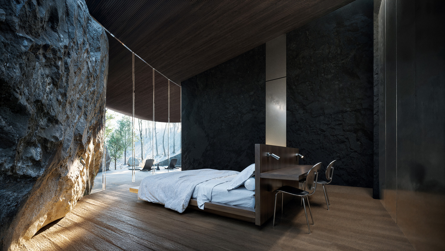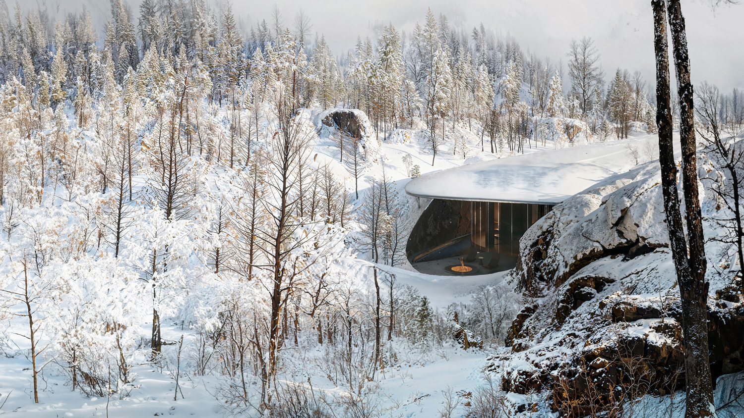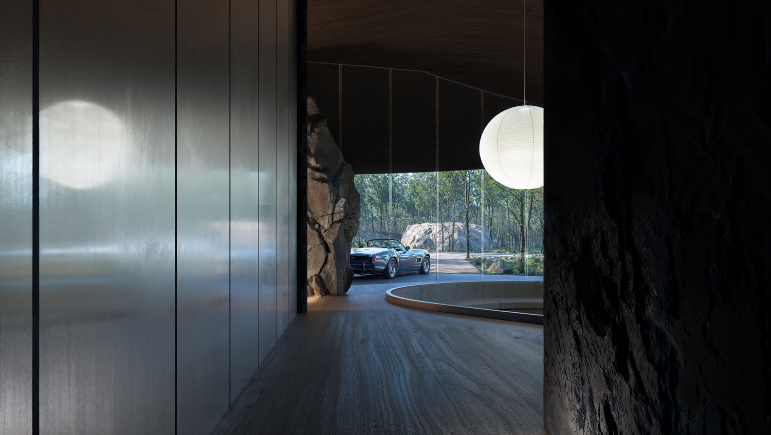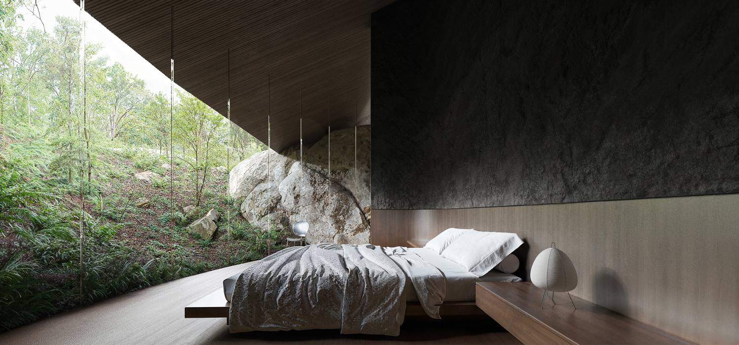 The project embraces a site rich in natural rock formations, integrating these stones as key structural and spatial components rather than treating them as obstacles. The house is embedded into the earth, following the natural slope and contour of the landscape, creating a harmonious relationship with its surroundings. By retaining the rocks in their original positions, they serve dual roles as load-bearing elements and defining interior features, reducing the need for extensive artificial foundations. Shaped as an imperfect ellipse, the form flows with the land, softening the transition between nature and structure. This organic geometry allows the house to emerge subtly from the ground, anchored by the rocks, which serve as both functional supports and aesthetic anchors. The lower façade is primarily glass, framing expansive views of the landscape and allowing natural light to permeate the interior. In this way, the design achieves a seamless integration of built and natural elements, creating a home that both respects and reflects its environment.