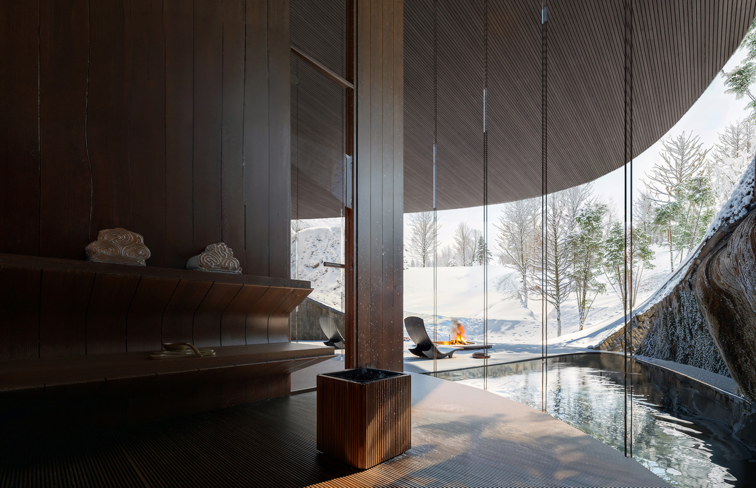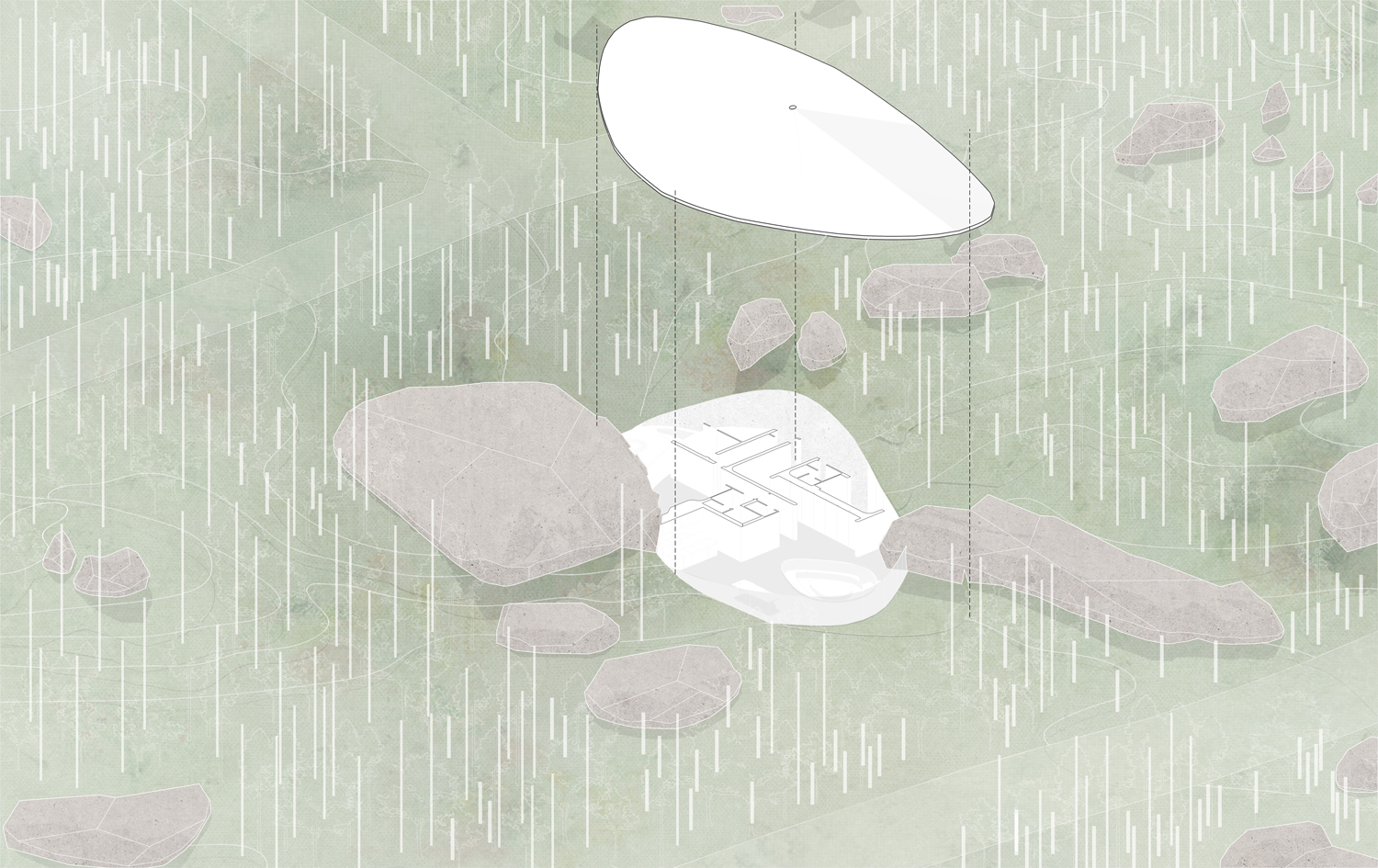 ☉ Nature within. Not a Hotel is a winning proposal by Unformed Design designed in 2024. It is located in Kitakaruizawa Japan in a forest setting. Its scale is small with a surface of 400 sqm. Key materials are glass stone and wood. Concepts such as nature roof and transparency are explored.