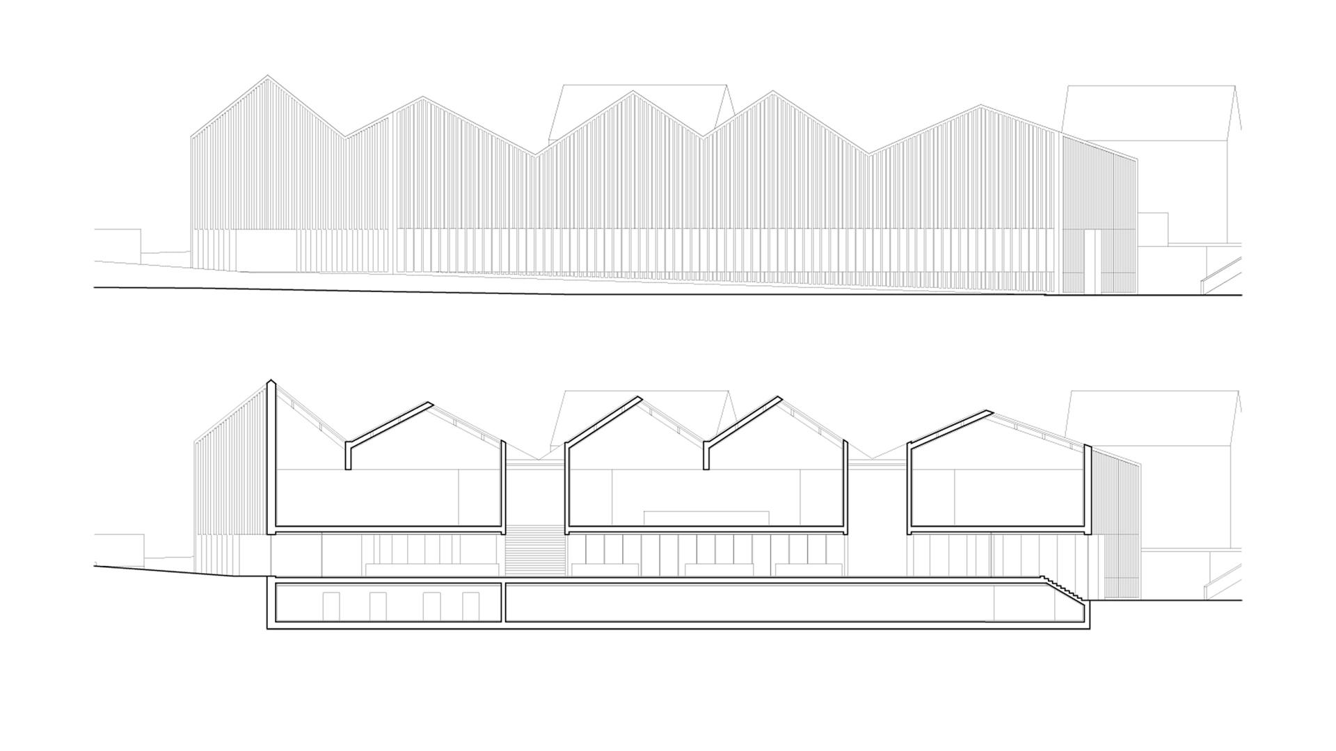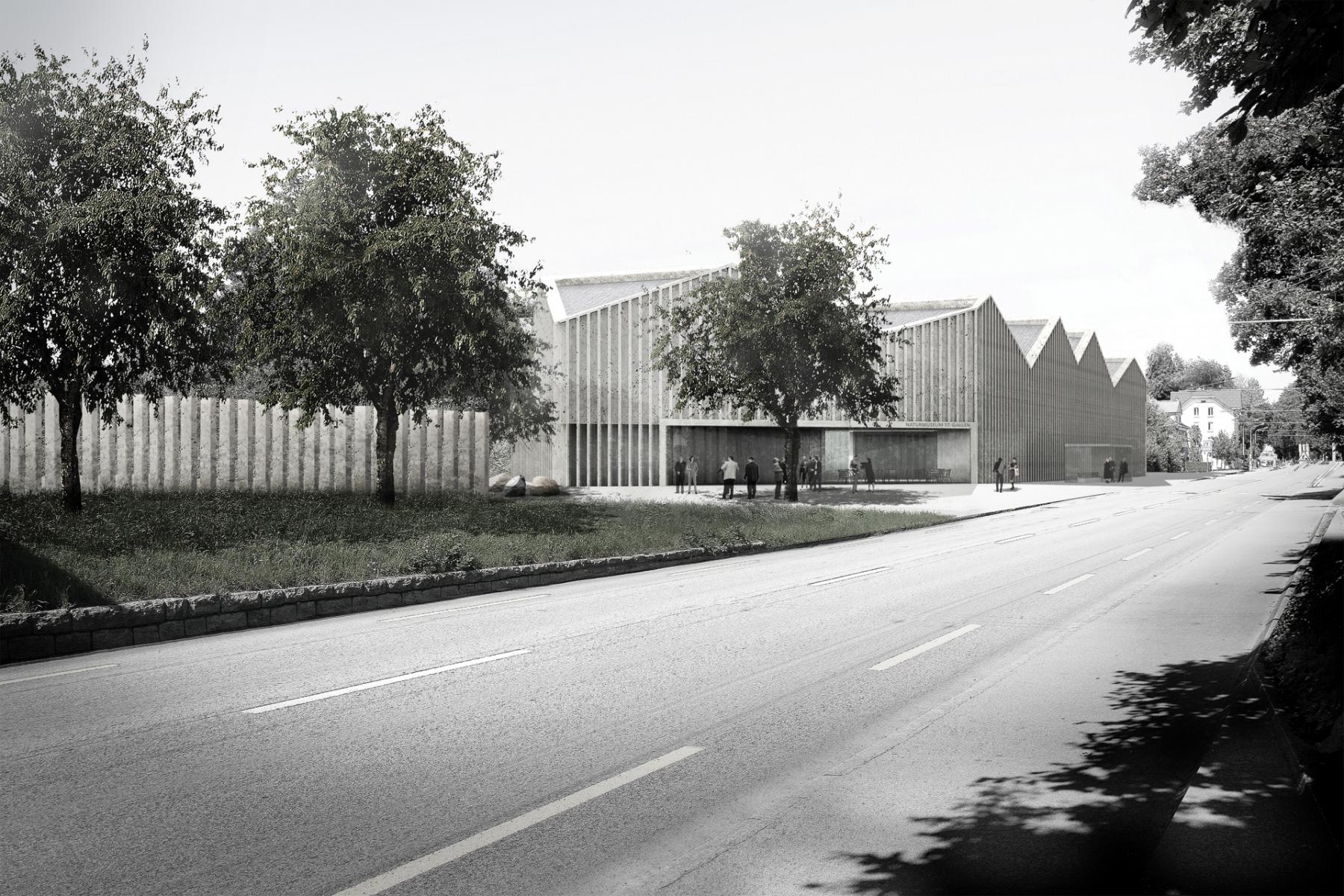 The Museum of Nature, St. Gallen was founded in 1846 by members of the St. Gallen Natural Sciences Society. While formed with high aspirations, its history would be characterized by instability due to personal and spatial conflicts. Both a symptom and a consequence, by 2009 the Nature Museum still had never had its own building. This was to change with the building of a new home for the museum, a space that could firmly establish the organization as a local and national presence. The selected site, a landscaped parcel in the city’s periphery, stands adjacent to the Botanical Gardens. We proposed connecting the two visitor centers with a continuous system of paths, thus creating a spatial sequence and building a relationship between the main entrance to the museum, the adjacent theme park, the entrance to the botanical gardens, and the Alpine House. The form of the building was composed based on a sequential idea about the predominant silhouettes of local suburban houses, and crafts an analogy to the assembly of homes. With the distinctive notching of the roof, the building mediates the various scales of the landscaped periphery and the presence of a developing city structure.
