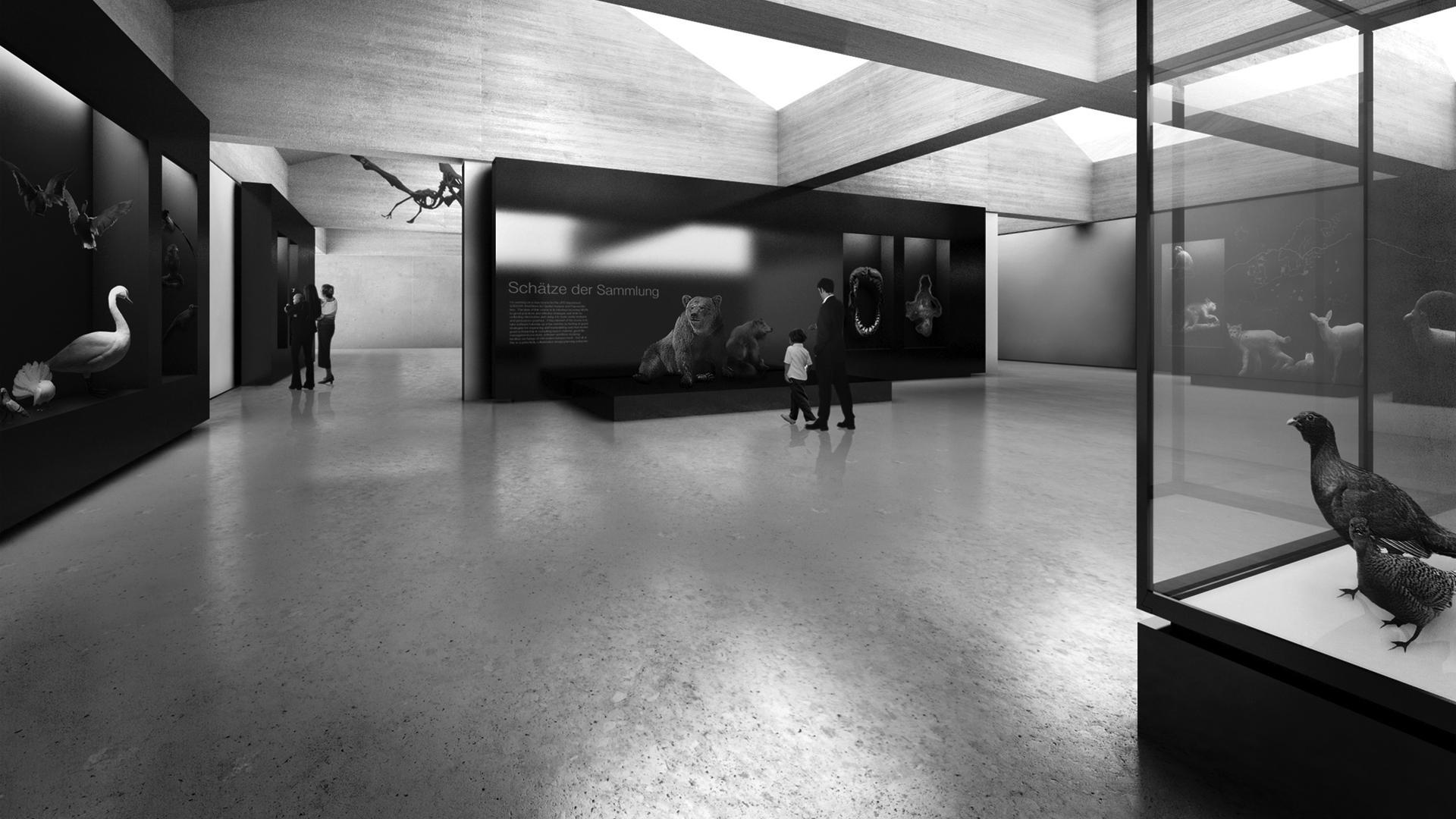 On the ground floor, a wide corridor unifies the interior program of the Nature Museum and connects it to the exterior spatial sequence. From the corridor, one accesses the publically oriented functions of library, reading rooms, classrooms, and cafeteria. The main stairs leading to the exhibition spaces and access to the storage rooms are marked by luminous atriums. These atria act simultaneously as showrooms for exhibition announcements and other activities. The development of the exhibition spaces alludes strongly to the character of natural history galleries. The Museum of Nature’s collection developed from a process of “capture, find, collect, and exhibit” and consequently, the exhibitions exude a lyrical, figurative quality. In contrast, the space is enclosed by a dominant, geometric structure. The roof contours, while initially inspired by the local context, enable agile placement of skylights for ideal lighting in the exhibition spaces. The resulting overall effect in the interior is a quality of abstraction and elusiveness. Interacting with the presence of the structure and displayed objects, the exhibition spaces oscillate between minimalistic heaviness and expressive lightness, a temperament which extends to the exterior. The concrete building shell, enriched by a relief texture, lends the building an egocentricity and heaviness while simultaneously creating the picturesque character of the inviting and generous entry area and the roof form of the new construction.