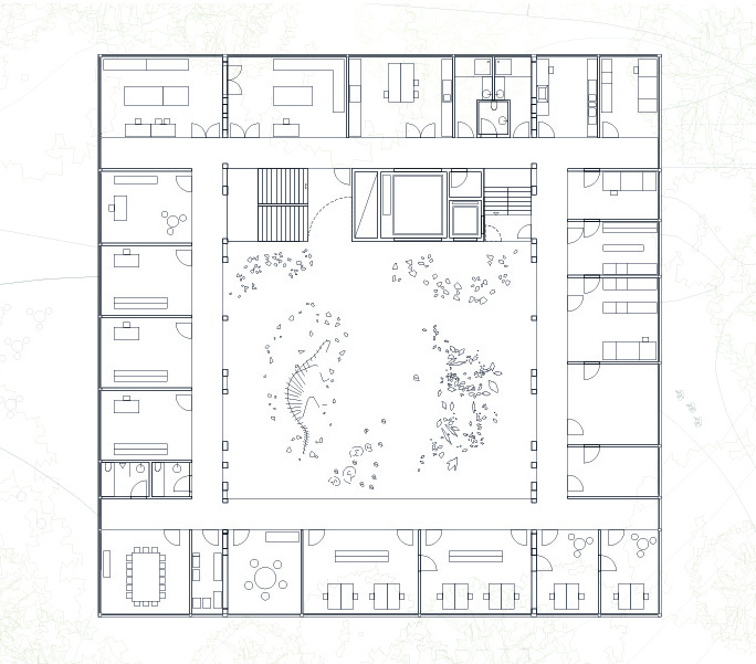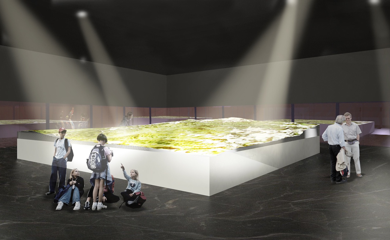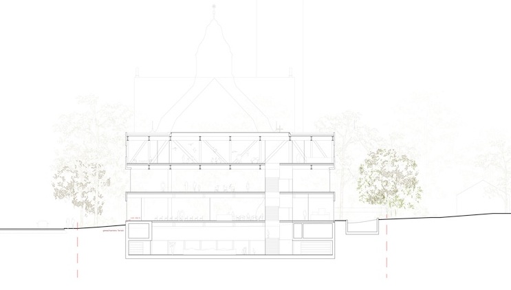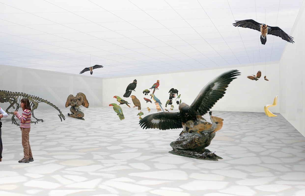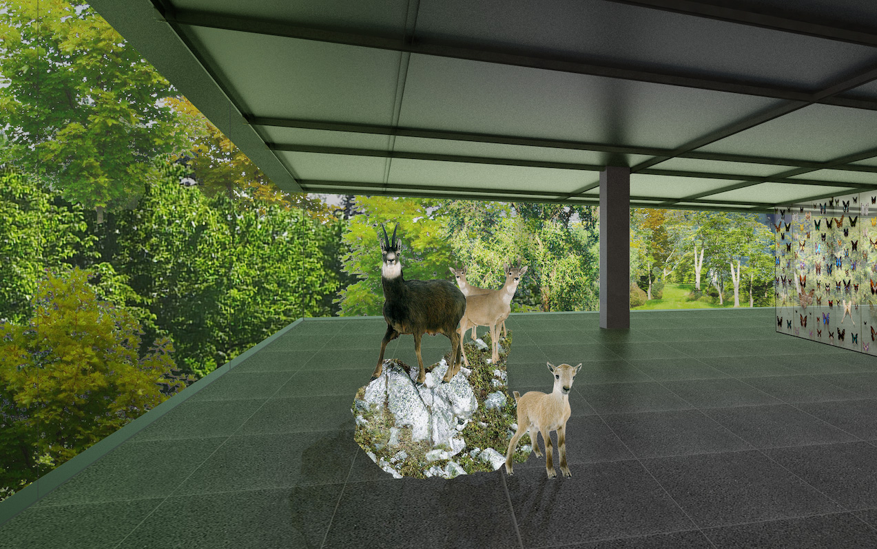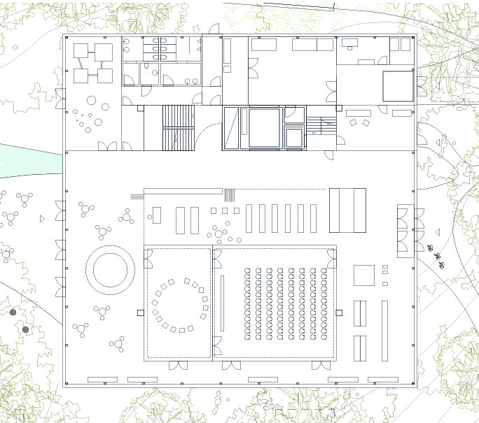 The Museum of nature is conceived as an open and transparent structure with a large-span and flexible construction. In contrast to a classical museum with a layout based on added rooms, this museum is organised on completely open floors on different levels. Each level has a particular relation to the outdoor space and a specific and unique exhibition typology. The main showroom is designed as an open space glazed towards the newly planted forest that surrounds the museum. Its only partition is the central core and four steel columns. Within this space the visitor does not experience the nature-exhibits captured in a human-scale space, the artefacts float in a scale-free space which is related to nature.