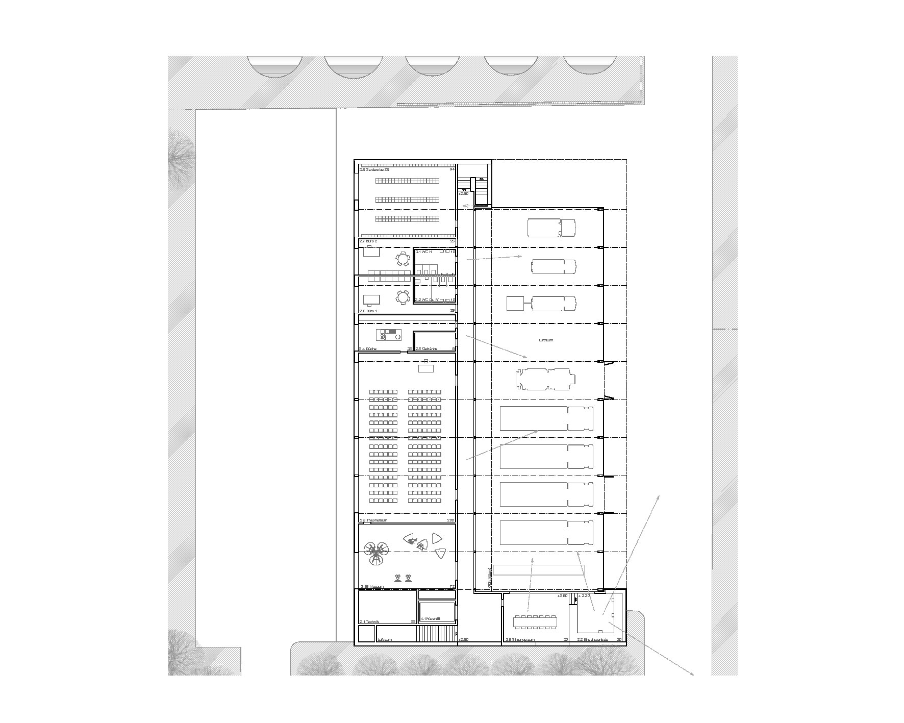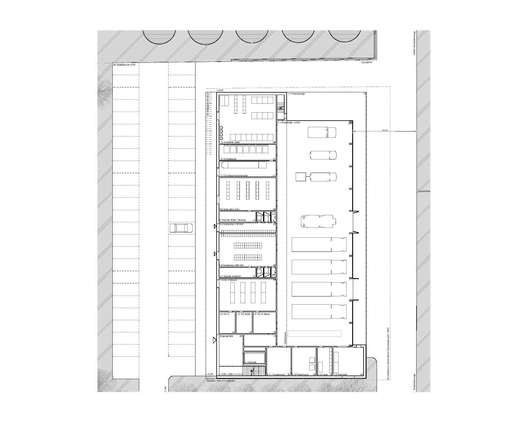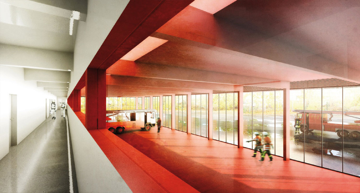 Die ostseitig ausgerichteten, fahrbereiten Feuerwehrfahrzeuge bilden den Grundstein für die Gebäudestruktur. Zusammen mit dem über die Mittelachse gespiegelten Serviceteil wird die Grunddisposition der Gesamtanlage definiert. Für die interne Gebäudeerschliessung bildet die Schnittstelle von Fahrzeugund Serviceteil eine Art Rückgrat. Auf der Erdgeschossebene wie im Obergeschoss dient diese Zone der Erschliessung der Räume. Nordund südseitig situieren sich zwei Treppen als Vertikalerschliessung. In Strassennähe bildet sich die kleine Eingangshalle mit der im Vergleich zur nordseitigen Fluchttreppe prominenteren Treppenanlage zu einer diskreten Empfangszone. Externe Besucher, die den Theoriesaal oder den Museumsraum zum Ziel haben, erhalten durch die Sichtverbindung in die Einstellhalle auf selbstverständliche Weise Einblick in den Betrieb des Feuerwehrmagazins. Ebenso direkt erschlossen ist die Raumeinheit für Besprechungen und Kommando. Die Serviceraumschicht im Erdgeschoss ist auf zwei Seiten durchlässig, damit die Verbindung von Ankunft/Anlieferung zur Fahrzeughalle gut und direkt gewährleistet ist.