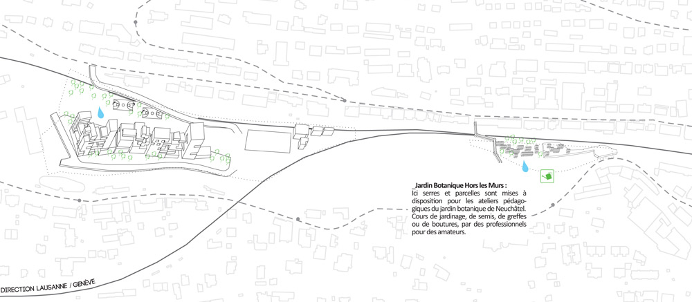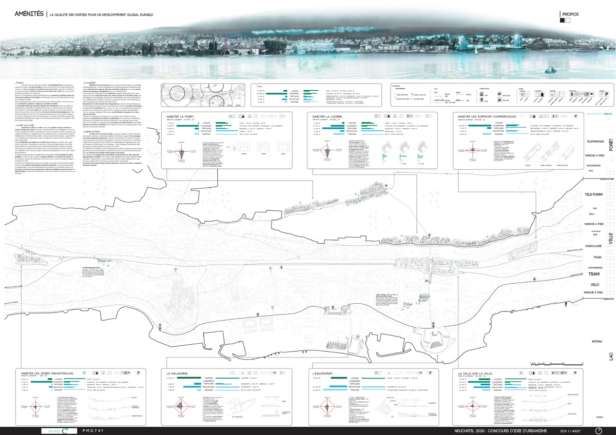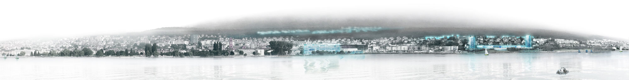 Intervenir sur une ville pour projeter son développement, en prenant en compte les enjeux d’un futur durable ne peut se résoudre à une simple attitude de «zoning». Il s’agit de prendre en compte le macro et le micro, la grande et échelle et les situations locales, mettre en lien tous les territoires de la ville mais surtout leurs identités particulières et respectives. Assurer un aménagement urbain pérenne passe par soutenir les qualités propres de chacune des parties de l’ensemble, la ville devient alors un tissu de relations et non une collection d’objets. Avant de distinguer d’un côté les rives du lac et de l’autre la forêt, il nous faut avant tout rechercher à exploiter le déjà là, le mutable et l’oublié. Sur Neuchâtel 2020 sept territoires d’étude sont sélectionnés. Du lac à la forêt, ils représentent une palette de l’ensemble de la cité. La majeure partie de l’intervention proposée s’opère sur la ville même parce qu’elle constitue à court et moyen termes, avant tout autre lieu, une réserve foncière de développement. Pour autant, le long des Jeunes Rives de nouveaux équipements restructurent le rapport lac / ville et catalysent le lien à l’environnement. A la lisière de la forêt, de petits îlots d’habitations densifient les franges d’une forêt patrimoniale intouchable.