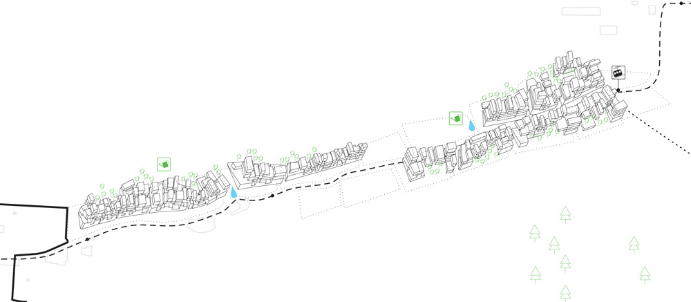 La forêt est un territoire sensible. Le bois de l’Hôpital, réserve forestière étonnante, constitue un patrimoine végétal et identitaire singulier. Tout aménagement doit en garantir la pérennité. Il convient de densifier en priorité le long des tracés existants et d’interdire l’occupation au cœur des zones boisées. A cet effet le coefficient d’occupation du sol contraint les implantations en alignement sur voie, et s’amenuise à mesure que l’on s’en éloigne. Cette stratégie d’implantation crée des espaces communs généreux ouverts sur la forêt. L’implantation des logements est accompagnée de celle de nombreux autres usages garantissant une vie de quartier. Le Chemin du Pertuis, la rue de l’Orée deviennent alors un nouveau tissu hybride mêlé d’urbain et de nature. Dans chaque îlot le gabarit des unités bâties est structuré par le vide, potentiel appropriable et mutable. Ainsi chaque espace/usage bénéficie d’un espace extérieur dédié mais gérer collectivement. Cette implication collective s’étend également à la gestion des énergies afin de diminuer la consommation d’ensemble. Au travers de ce projet l’espace devient générateur de sens et la ville un outil pour retrouver la nature.