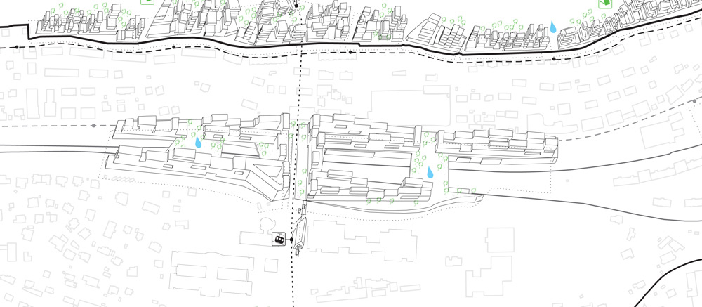 Construire la ville sur la ville permet de capitaliser l’espace existant et contenir l’étalement urbain. De vastes potentiels fonciers sont dégagés en restructurant et densifiant les friches industrielles, les zones ferroviaires et tout les espaces aux usages incohérents ou inadaptés avec leur contexte proche. A cette attitude s’ajoute l’exploitation de l’emprise des grandes surfaces commerciales de type «supermarché», en y greffant des programmes mixtes: du logement, commerce de proximité ou pôles d’éducation. Cette stratification des usages sur un même lieu développe une offre riche. Habitations, boutiques, équipements culturels ou de services garantissent une attractivité sociale et la mise en place d’une ville plurielle féconde en activités. De cette même façon le maintient des industries liées à l’environnement comme la STEP et son intégration à de nouveaux usages construisent physiquement le lien entre ville et environnement. Ce travail de superposition est accompagné de plusieurs structurations de vides qualifiés. En effet la mise en place de jardins collectifs, d’un marché de quartier et de nombreux espaces de respiration et de loisirs crée un réseau d’usages partagés à l’échelle de la ville. La position de l’équipement (centre des congrès, université et loisirs) participe également de cette attitude d’exploitation d’espaces potentiels. Ici le nœud autoroutier est appropriable, une surface exploitable est retrouvée et la continuité entre la rue des Saars et la Plage Verte est assurée par le fait que le bâtiment épouse le terrain. Il s’efface de façon à préserver l’entièreté des vues des maisons en contre haut de la rue.